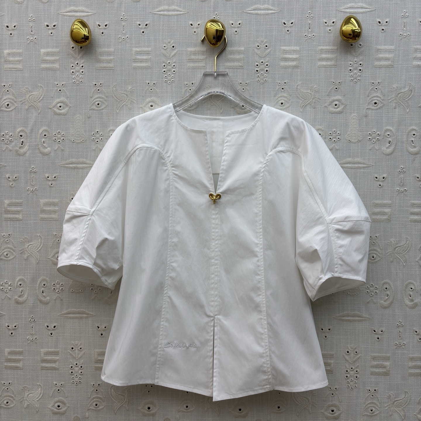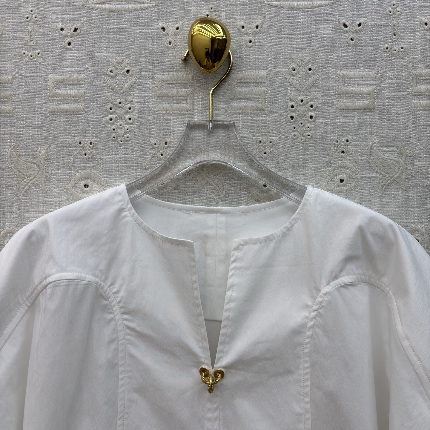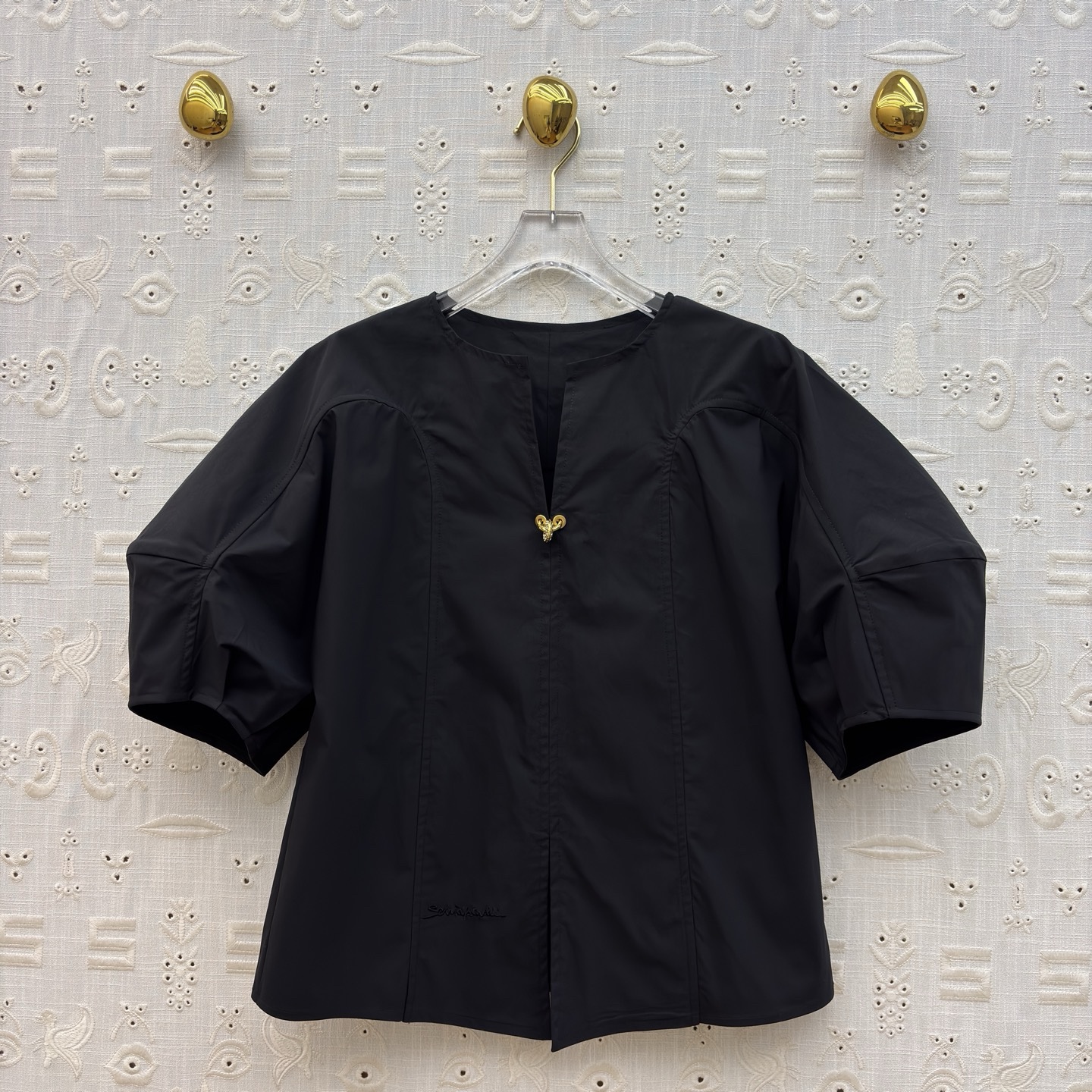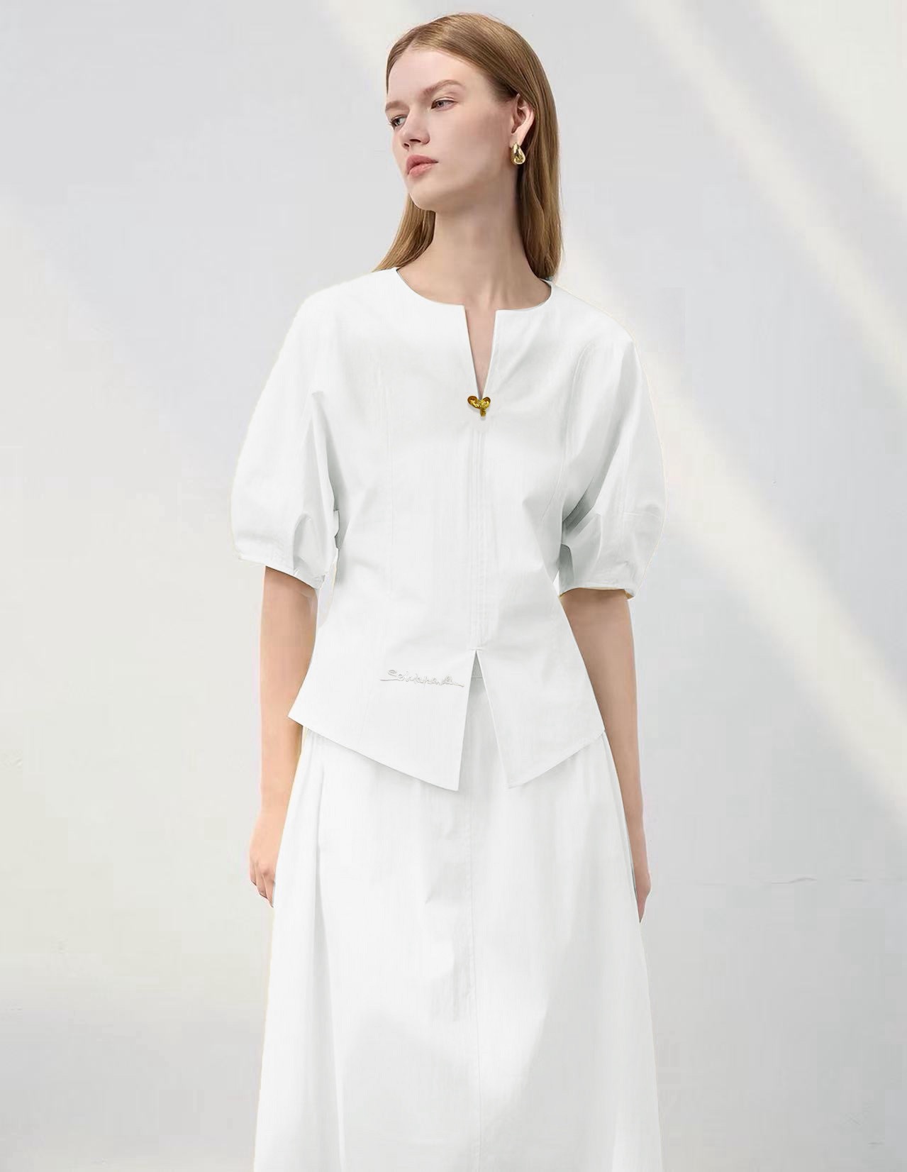 Блузка с пышными рукавами в сочетании с юбкой миди. Небольшой V-образный вырез и металлические пряжки помогают скрыть руки. Продается отдельно в размерах S, M и L