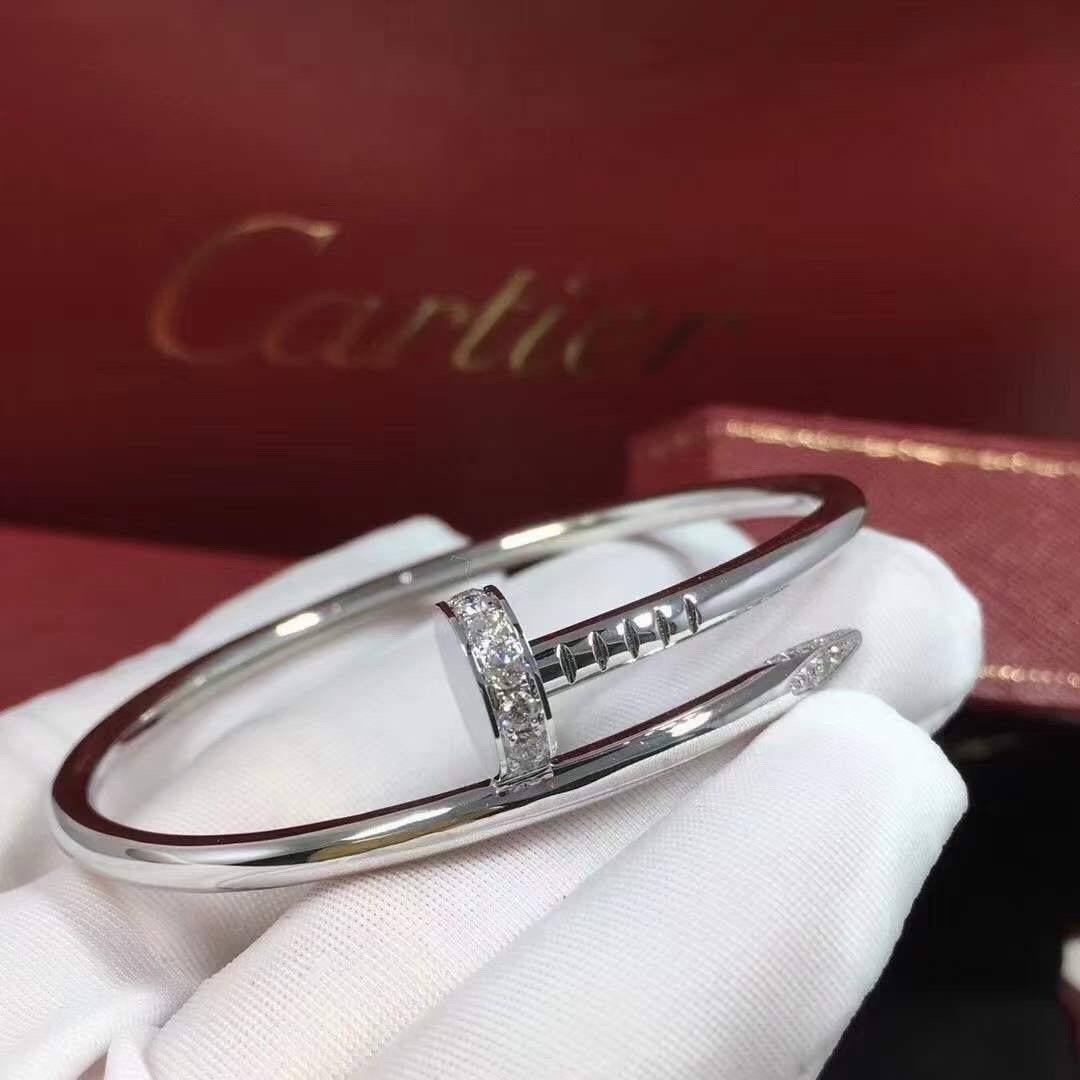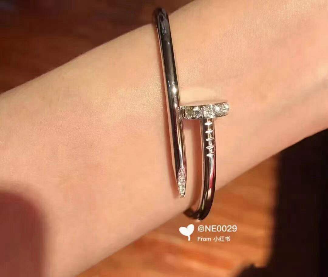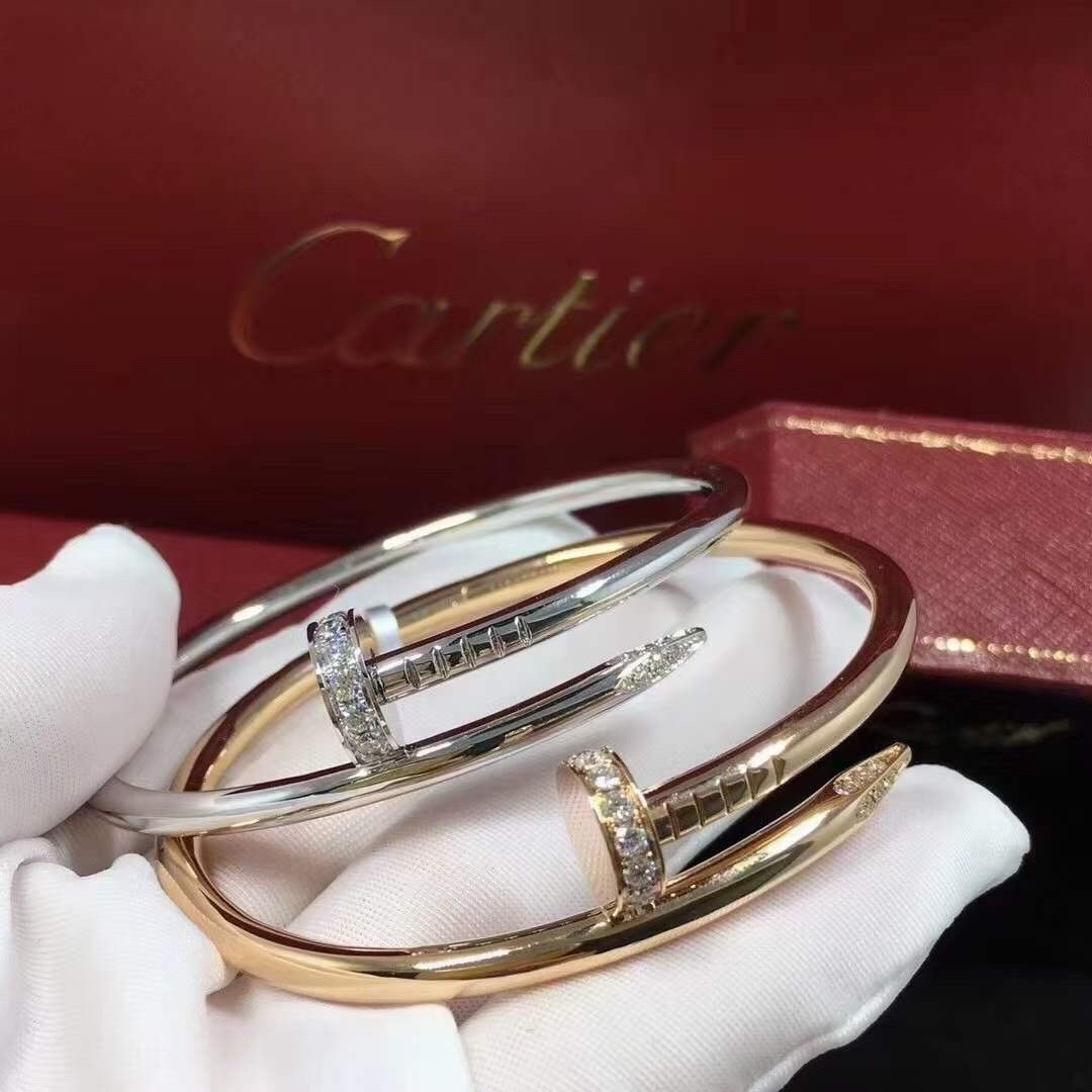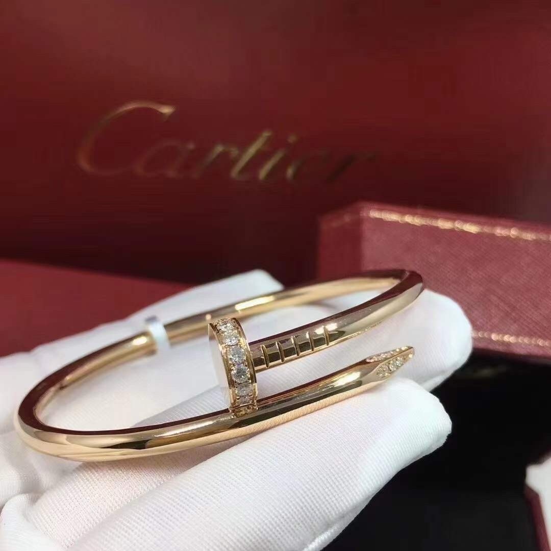 Классический браслет Cartier любим во всем мире. Этот браслет с застежкой-гвоздиком удобнее носить благодаря эластичному механизму открывания. Он классический, но в то же время элегантный и шикарный, украшен бриллиантами на обоих концах. Браслет изготовлен из трех слоев толстого покрытия из розового золота. Шедевр мастерства!