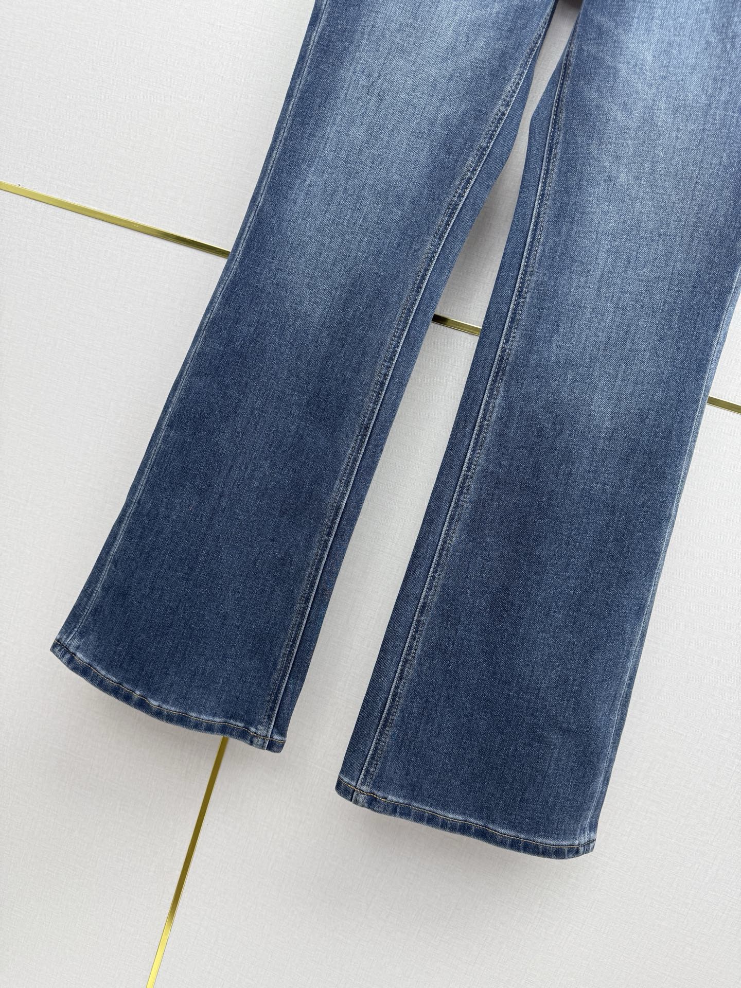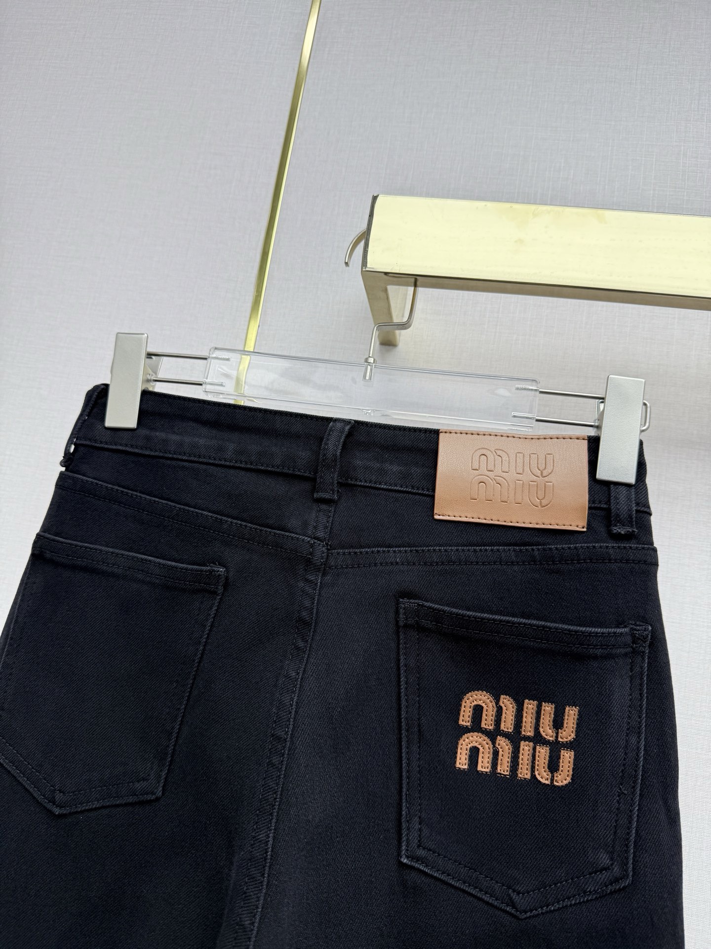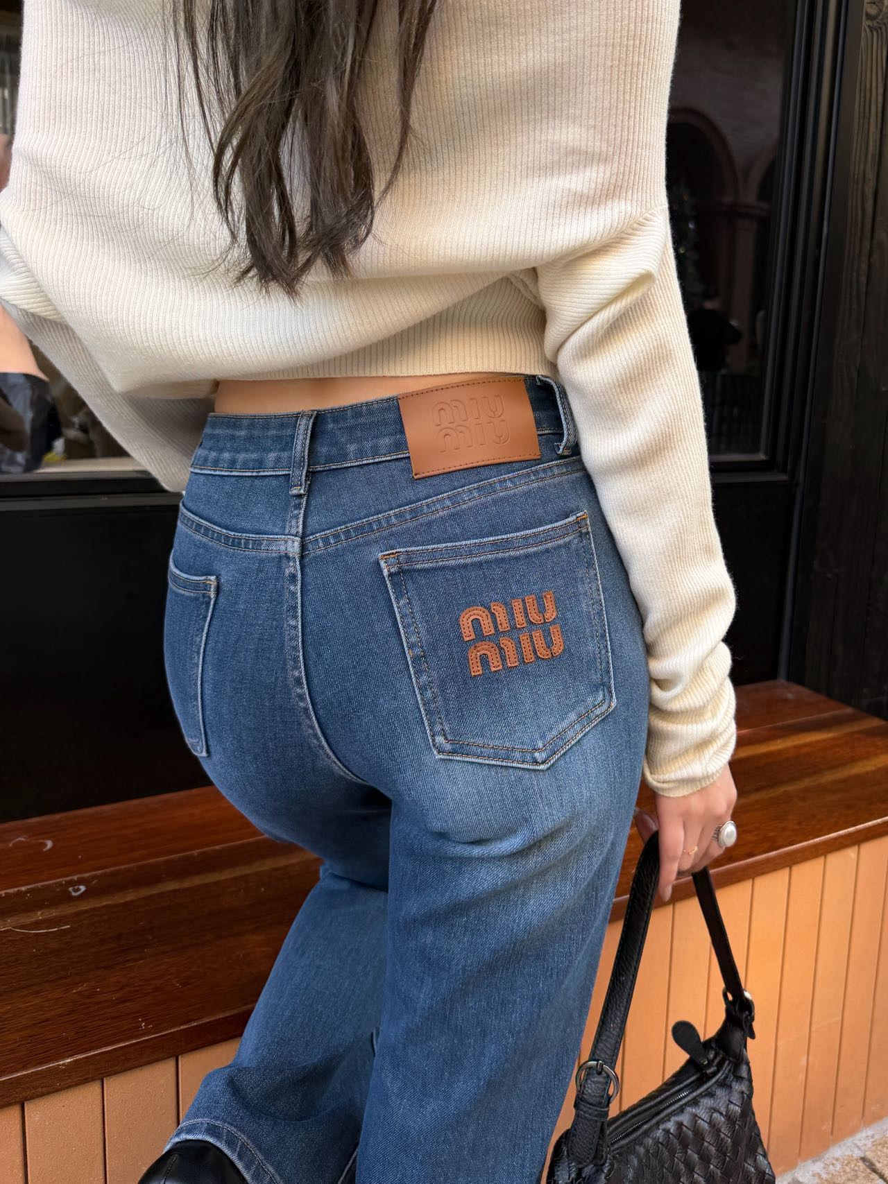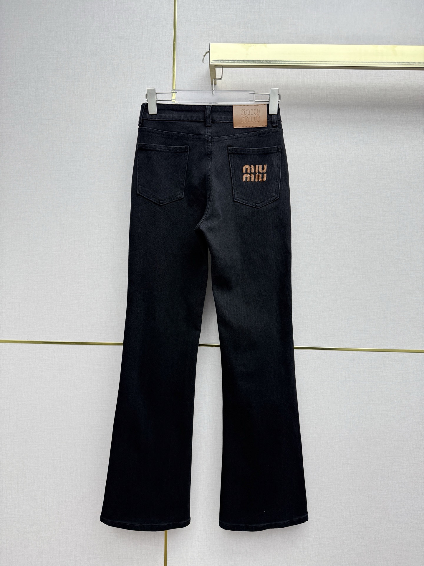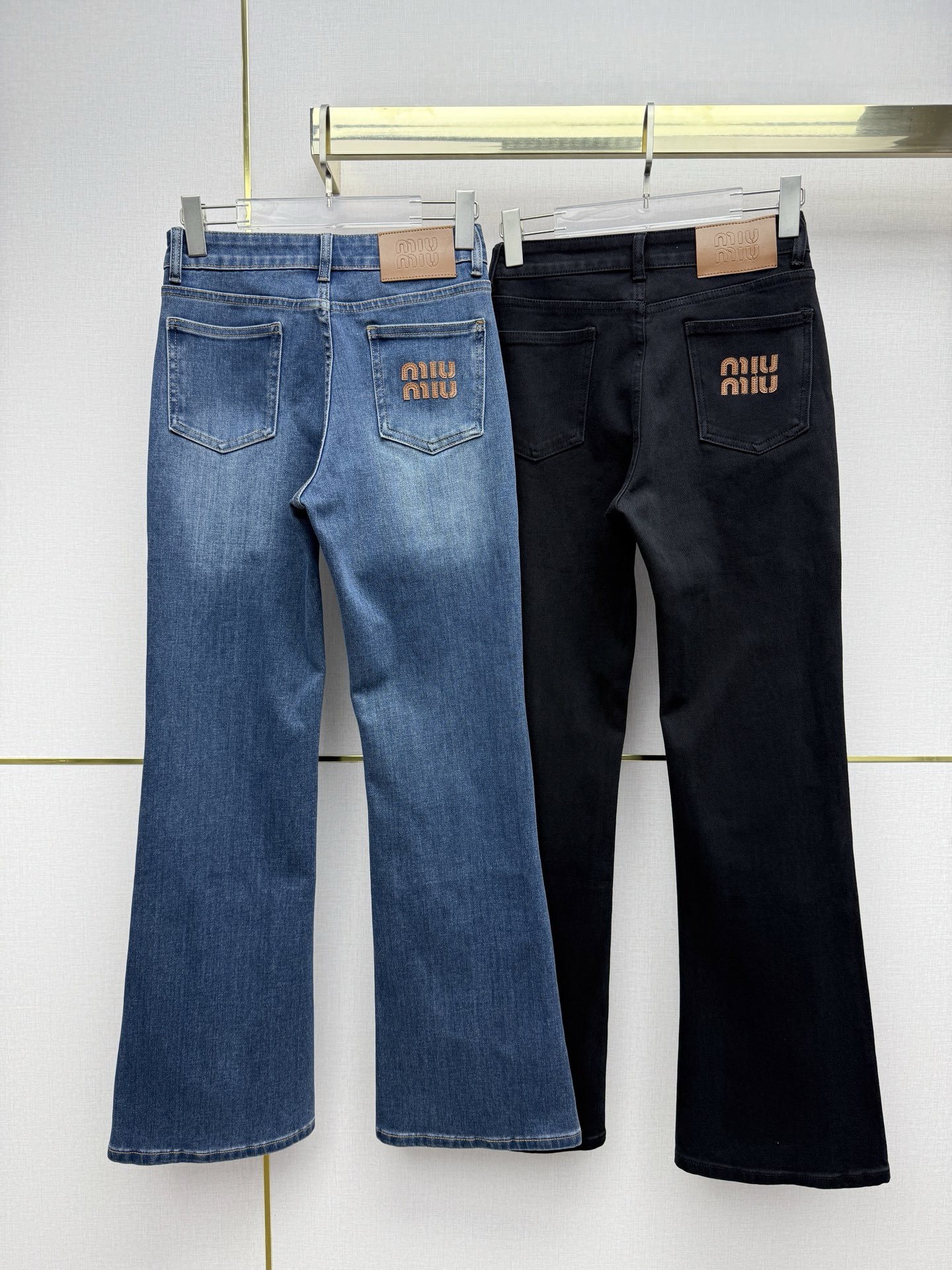 MiuMiu Новые универсальные джинсы-клеш / Расклешенный крой / Вышивка в виде букв на задних карманах / Визуально удлиняют ноги / Эластичная джинсовая ткань, растягивающаяся в четырех направлениях / Градиентная обработка: синий и черный / Два цвета, пять размеров (26/27/28/29/30)