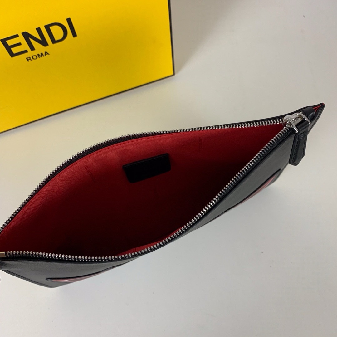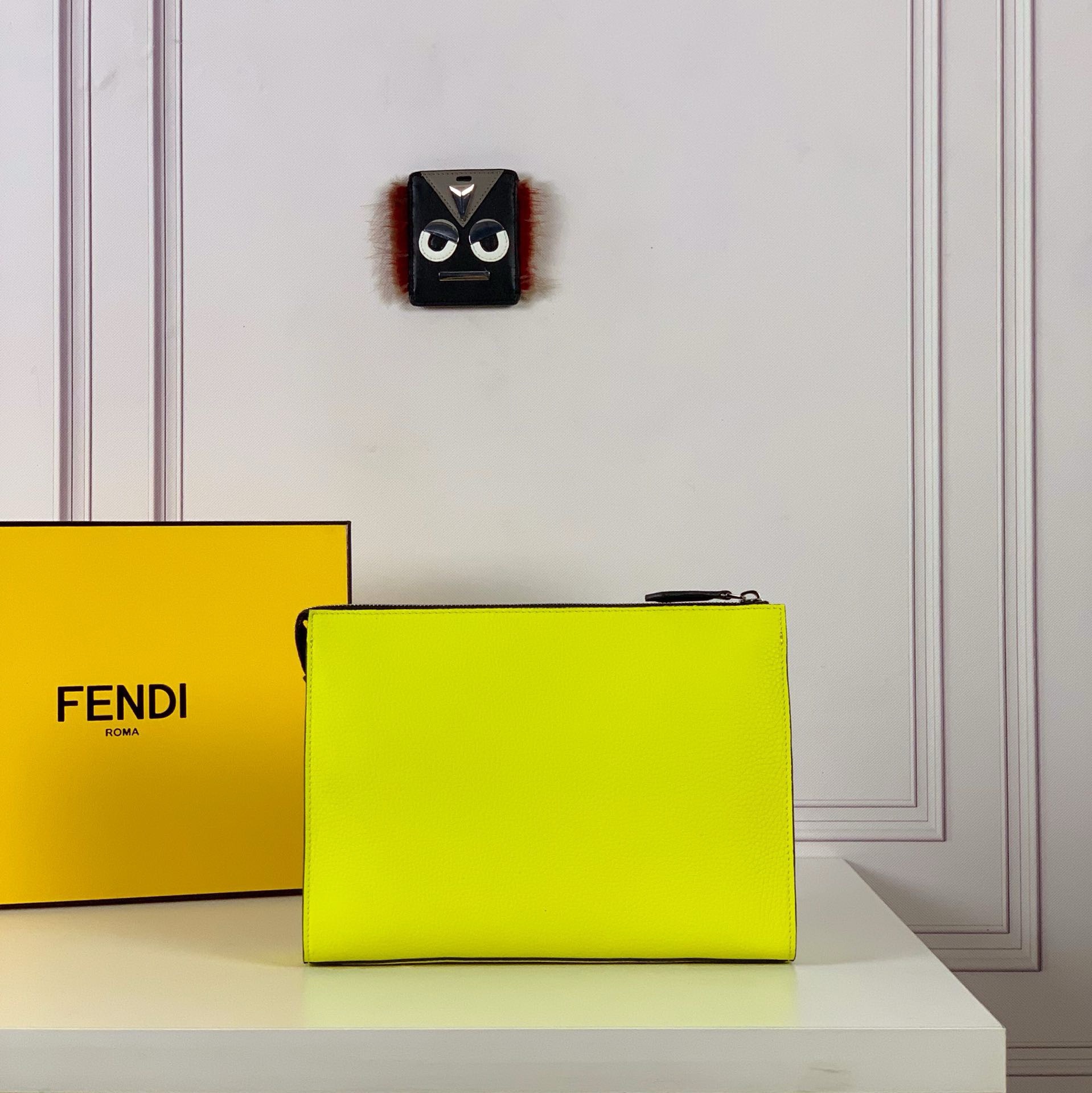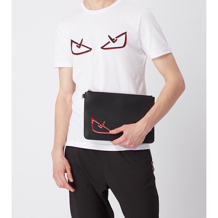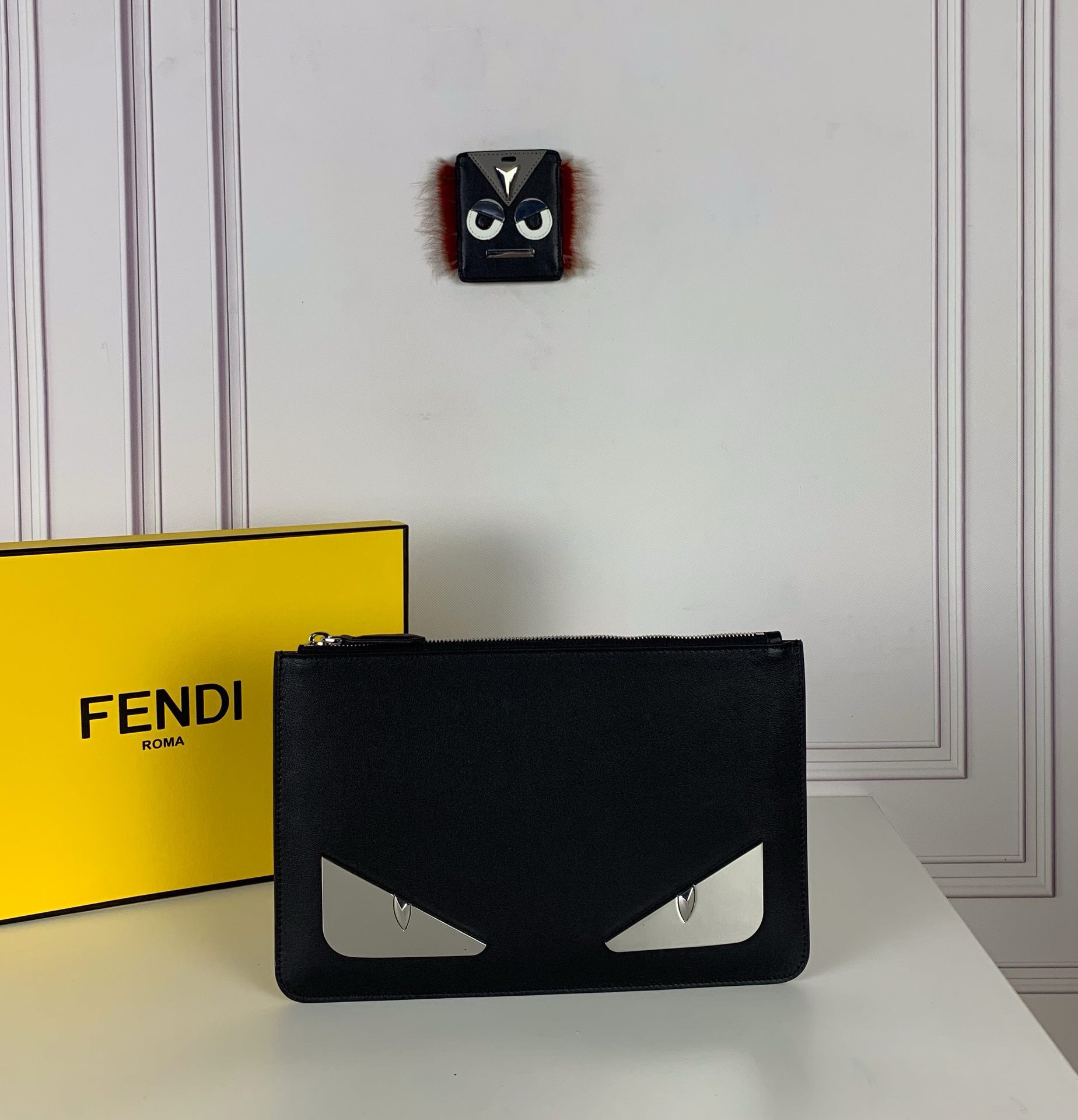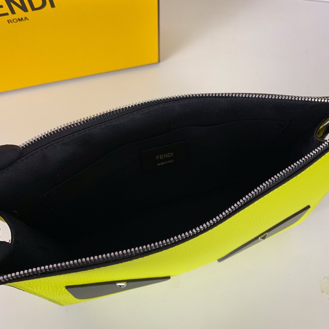 Клатч FENDI на молнии Внутренний плоский карман, флуоресцентная кожа. Украшен черной матовой металлической аппликацией в форме «глаза жука». Фурнитура с палладиевым покрытием. Сделано в Италии. Размеры: 27х20х6 см