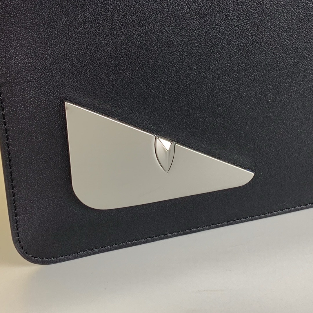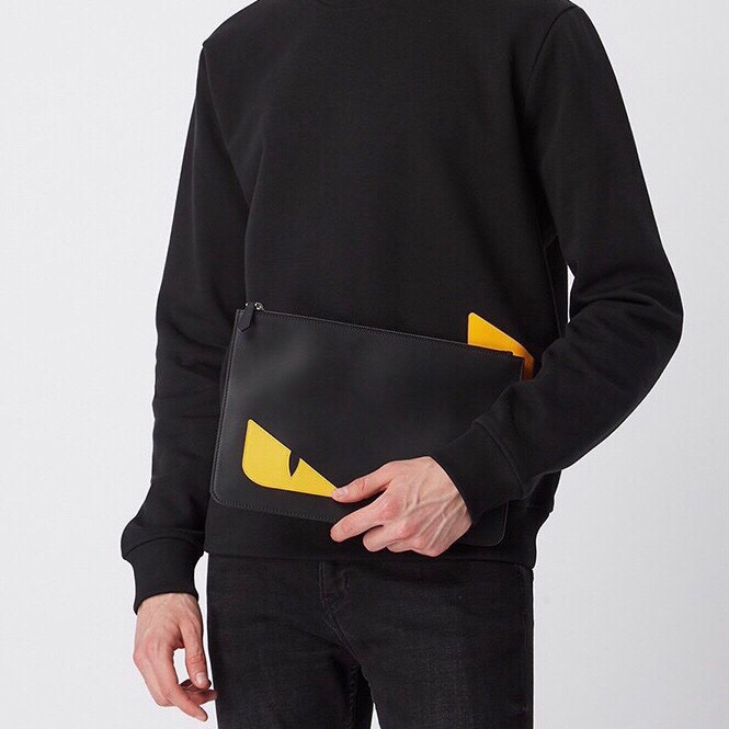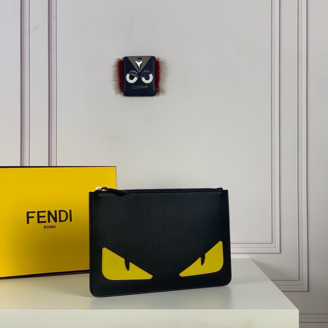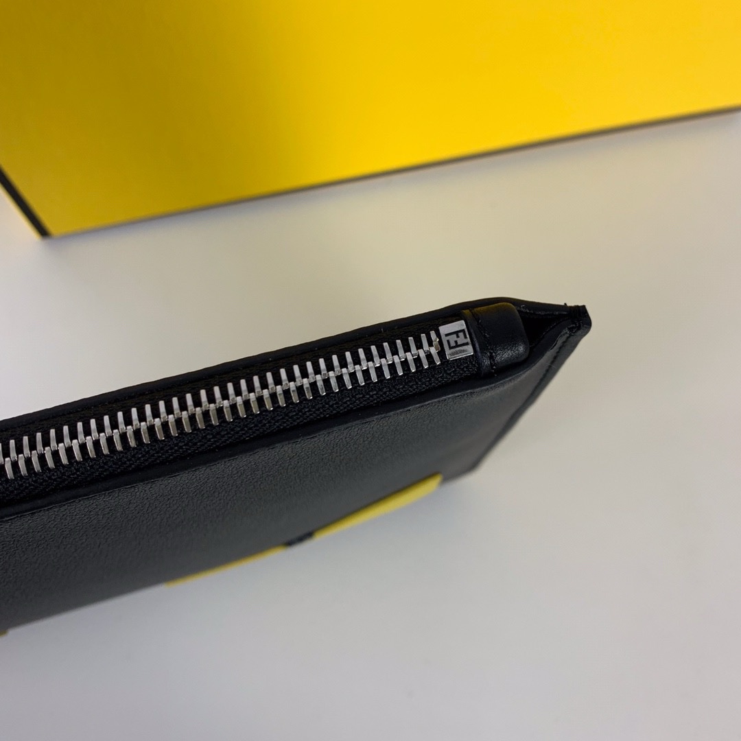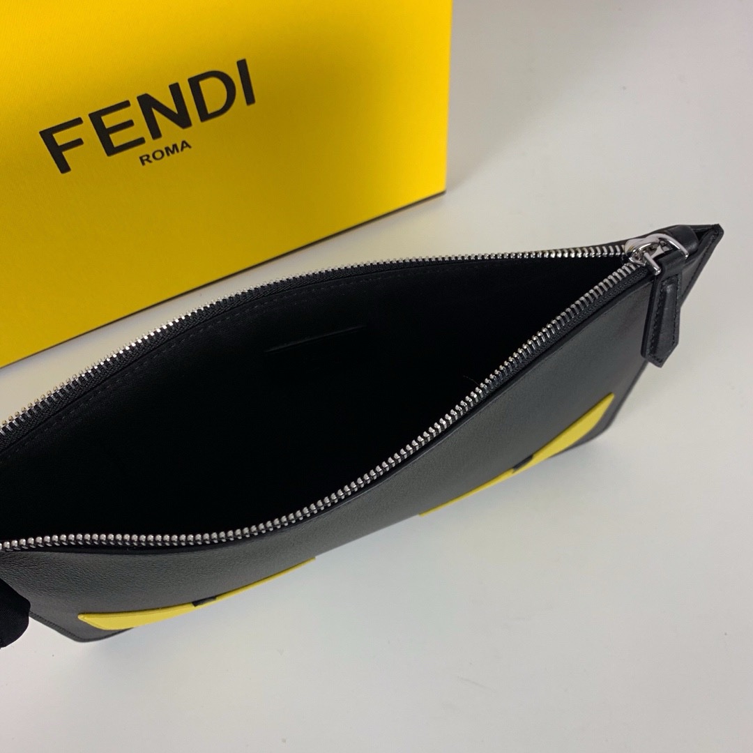 Клатч FENDI на молнии Внутренний плоский карман, флуоресцентная кожа. Украшен черной матовой металлической аппликацией в форме «глаза жука». Фурнитура с палладиевым покрытием. Сделано в Италии. Размеры: 27х20х6 см
