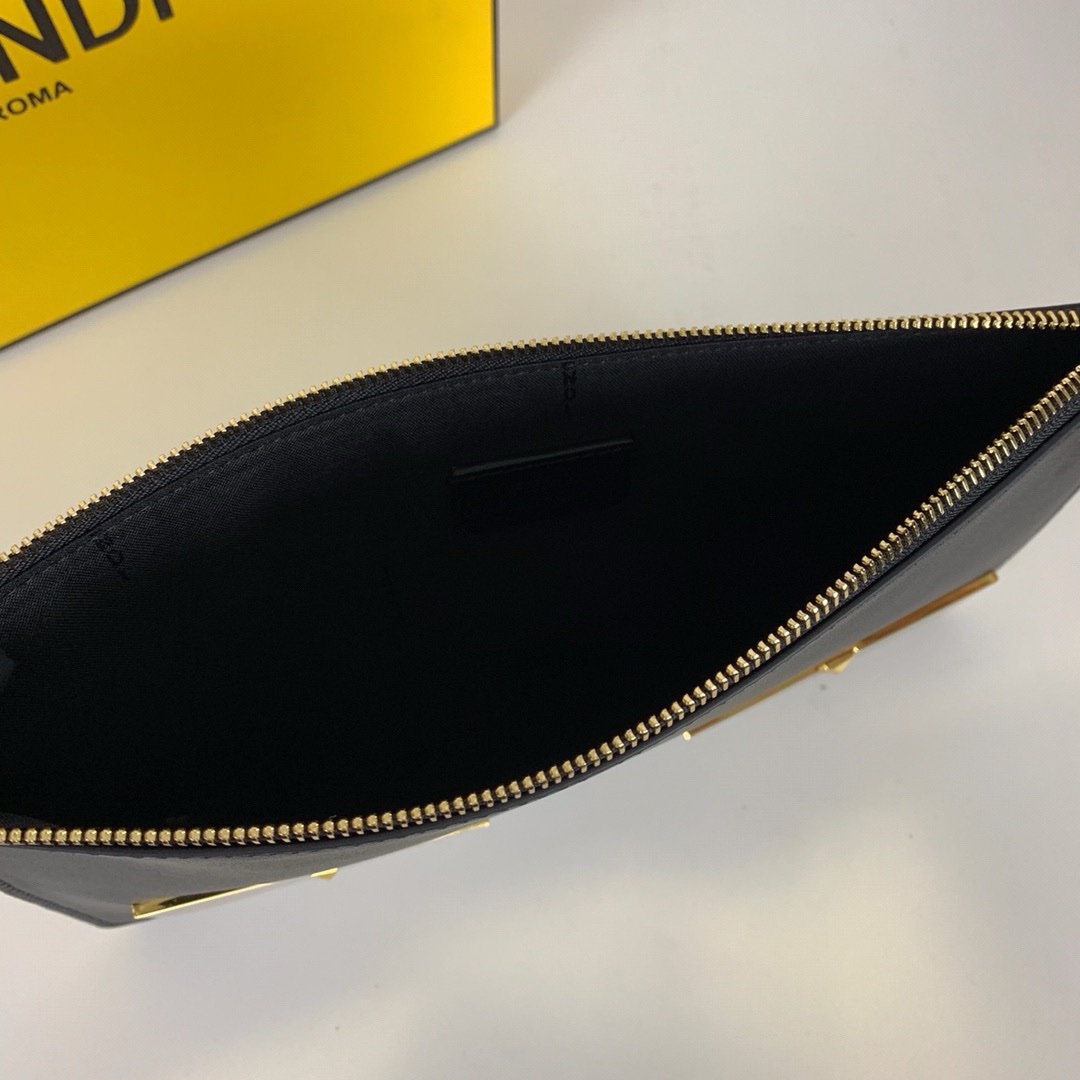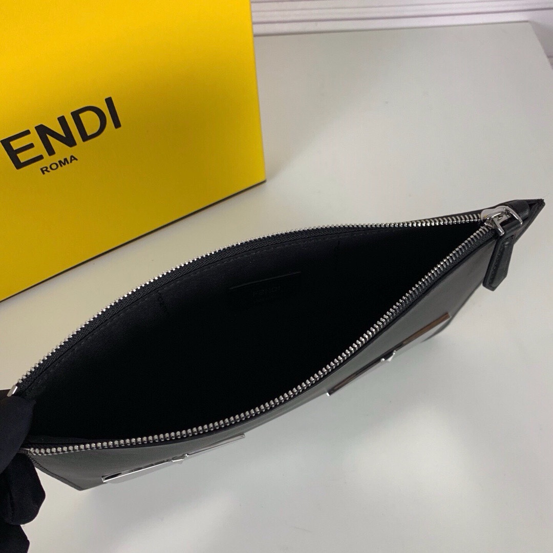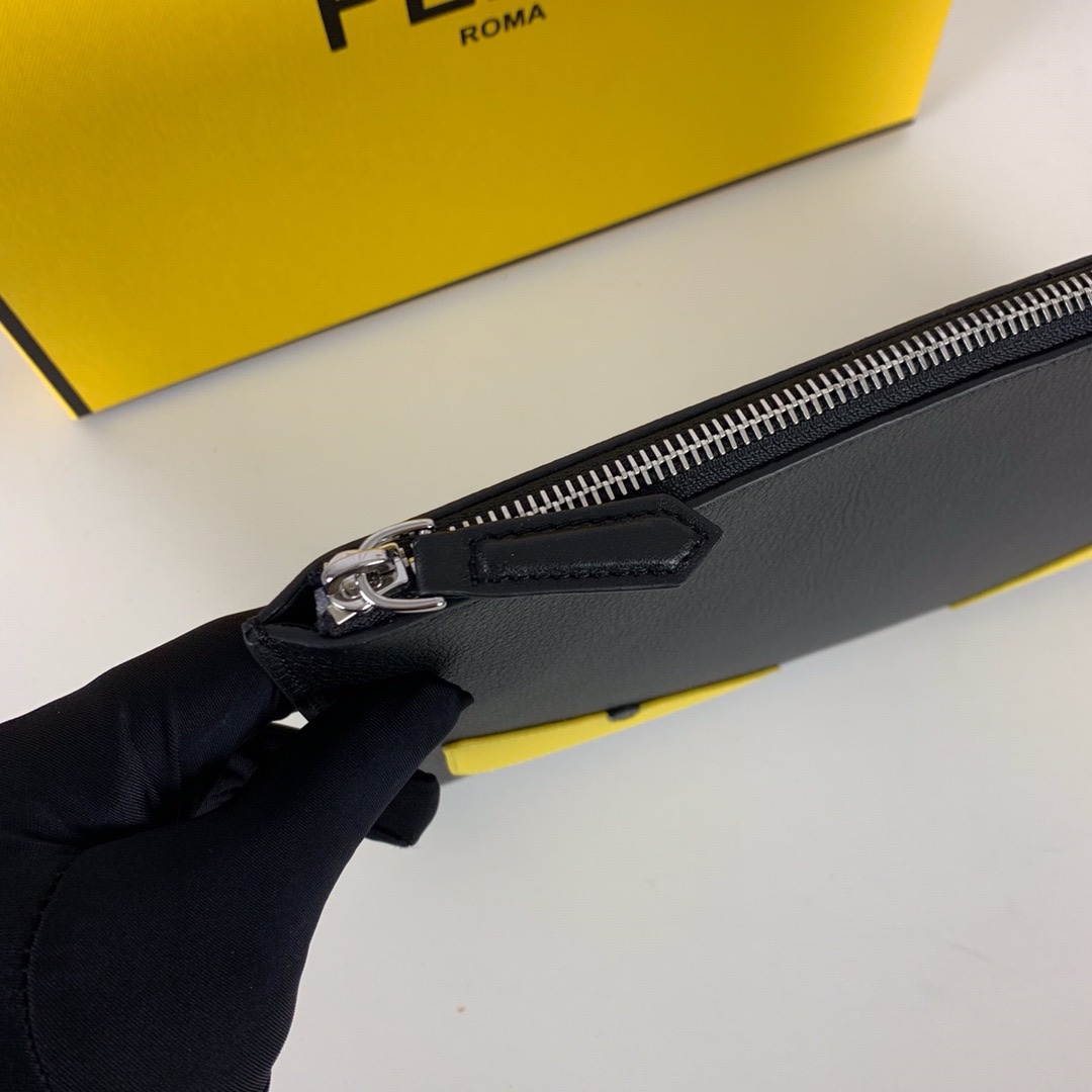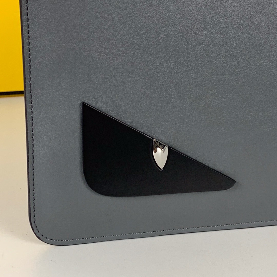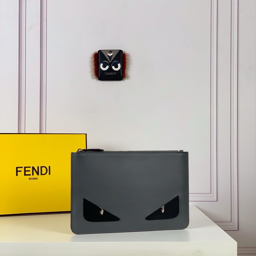 Клатч FENDI на молнии Внутренний плоский карман, флуоресцентная кожа. Украшен черной матовой металлической аппликацией в форме «глаза жука». Фурнитура с палладиевым покрытием. Сделано в Италии. Размеры: 27х20х6 см