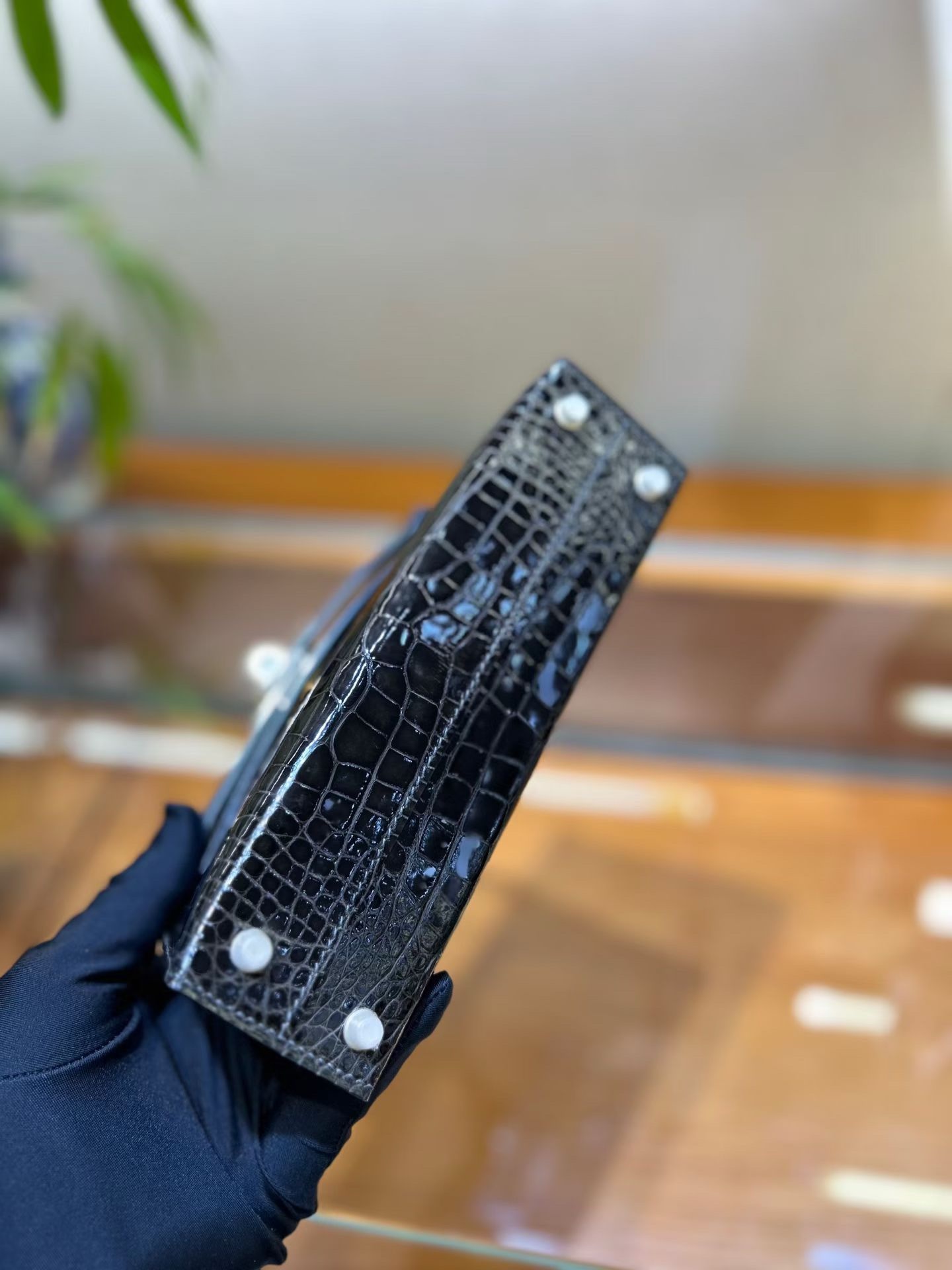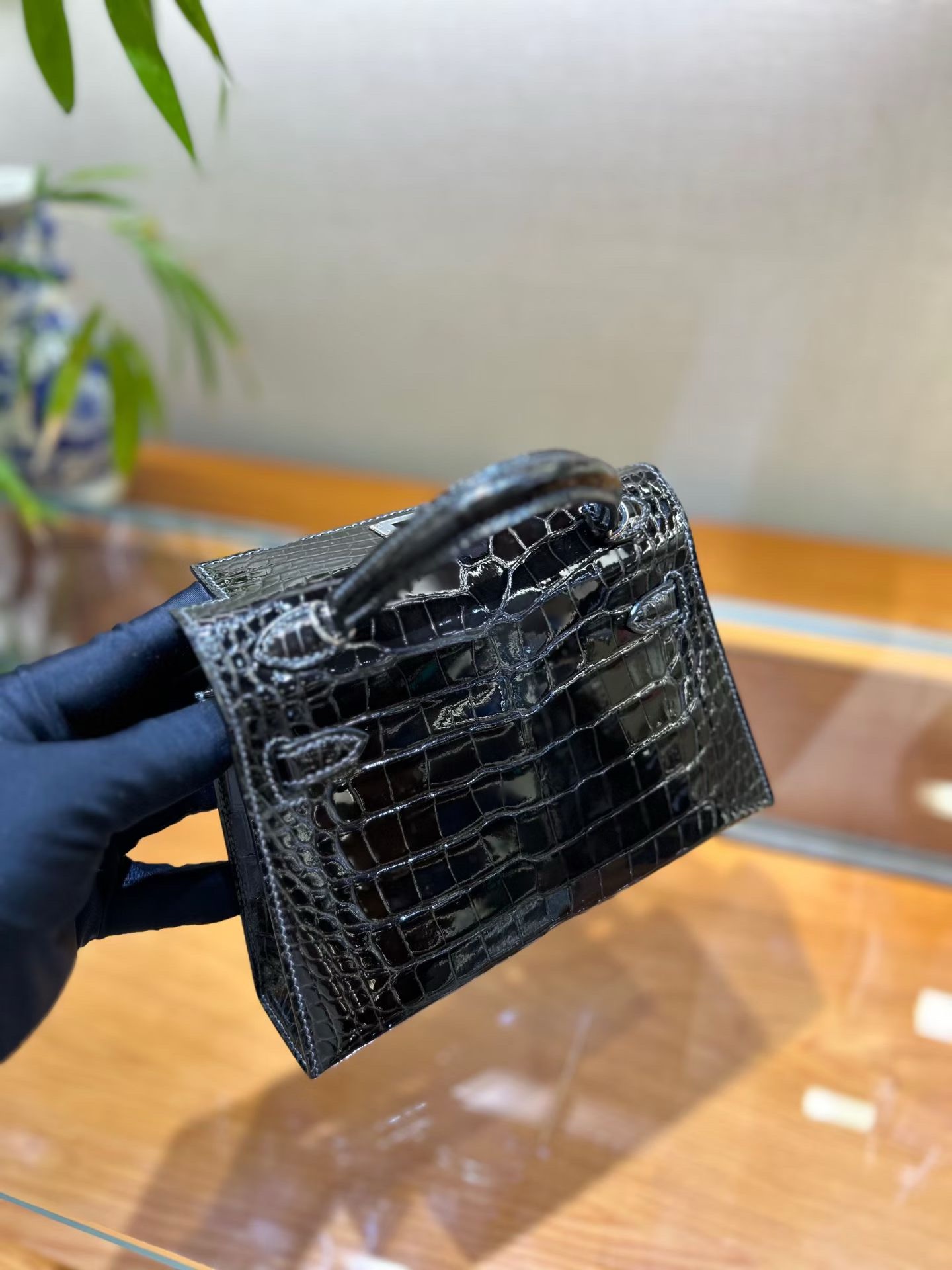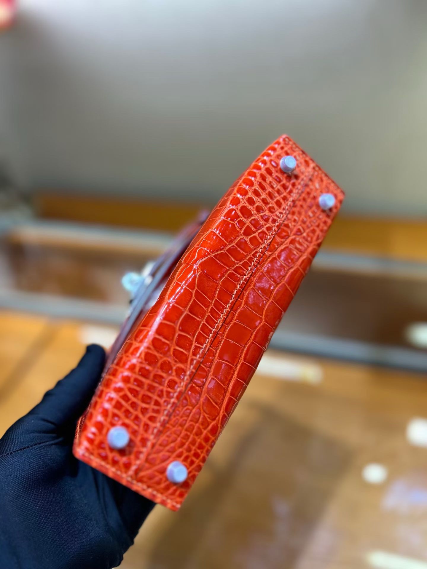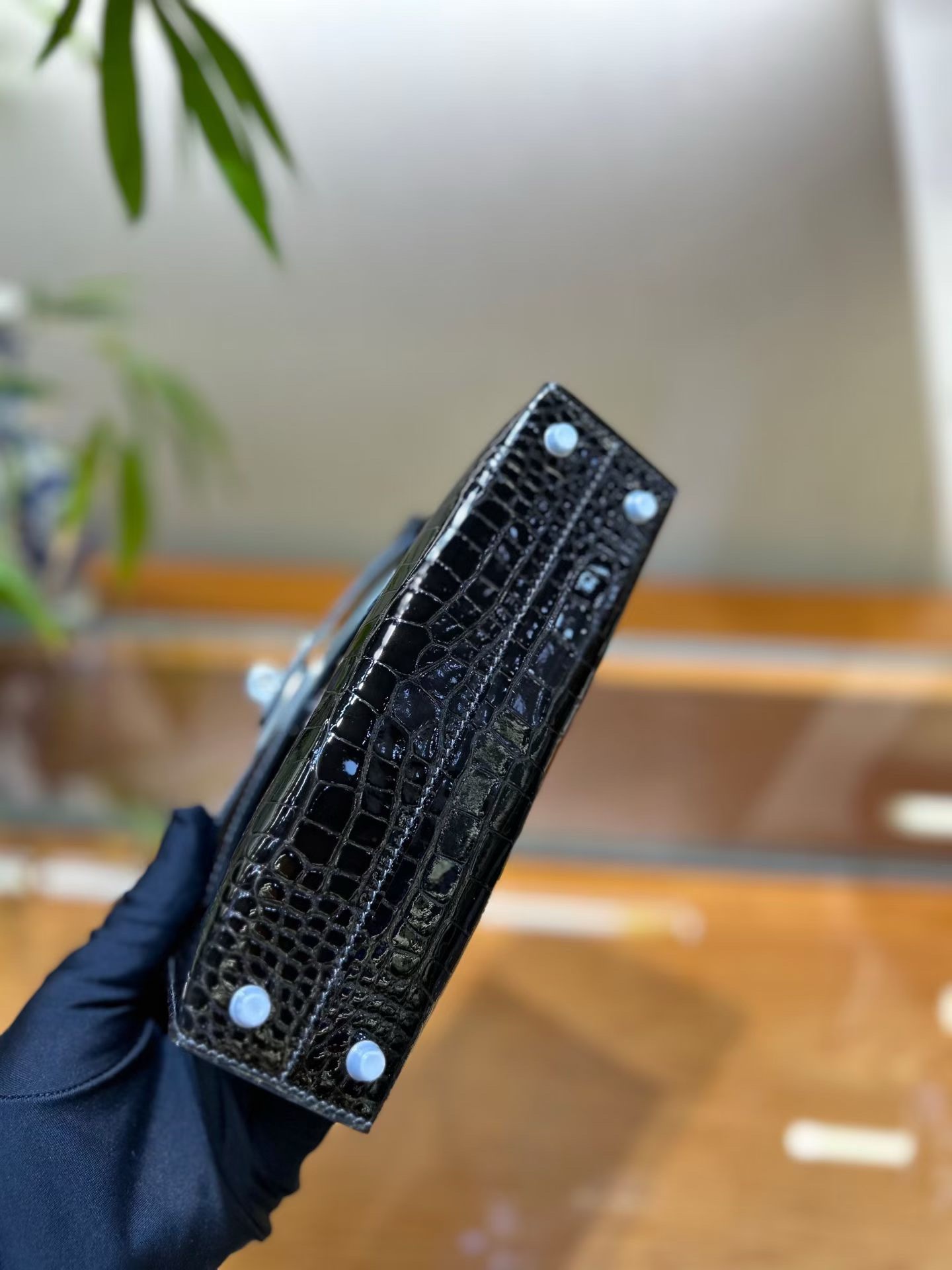 Материал и отделка: Сумка выполнена из материала с выраженной глянцевой текстурой, из кожи аллигатора.