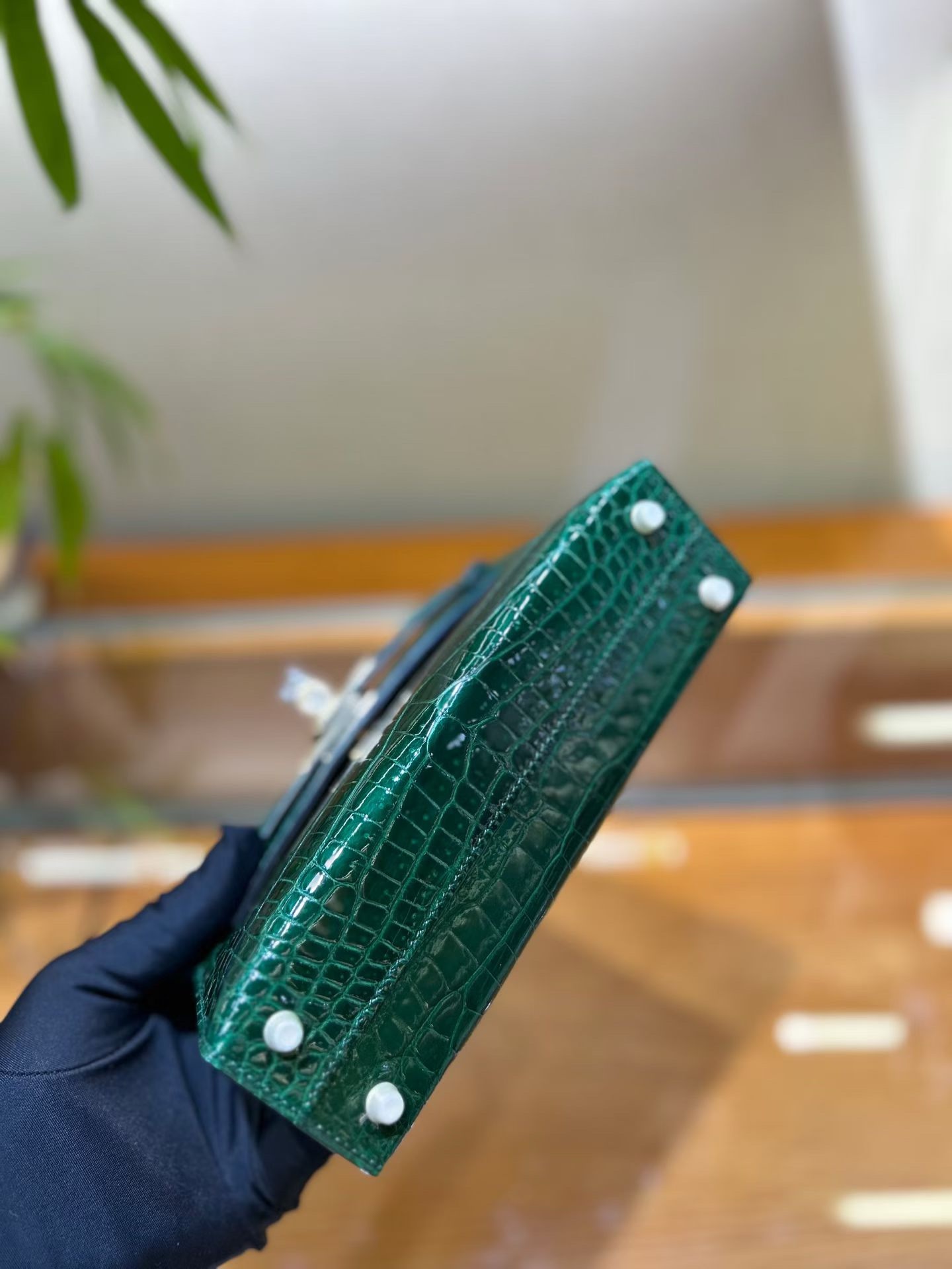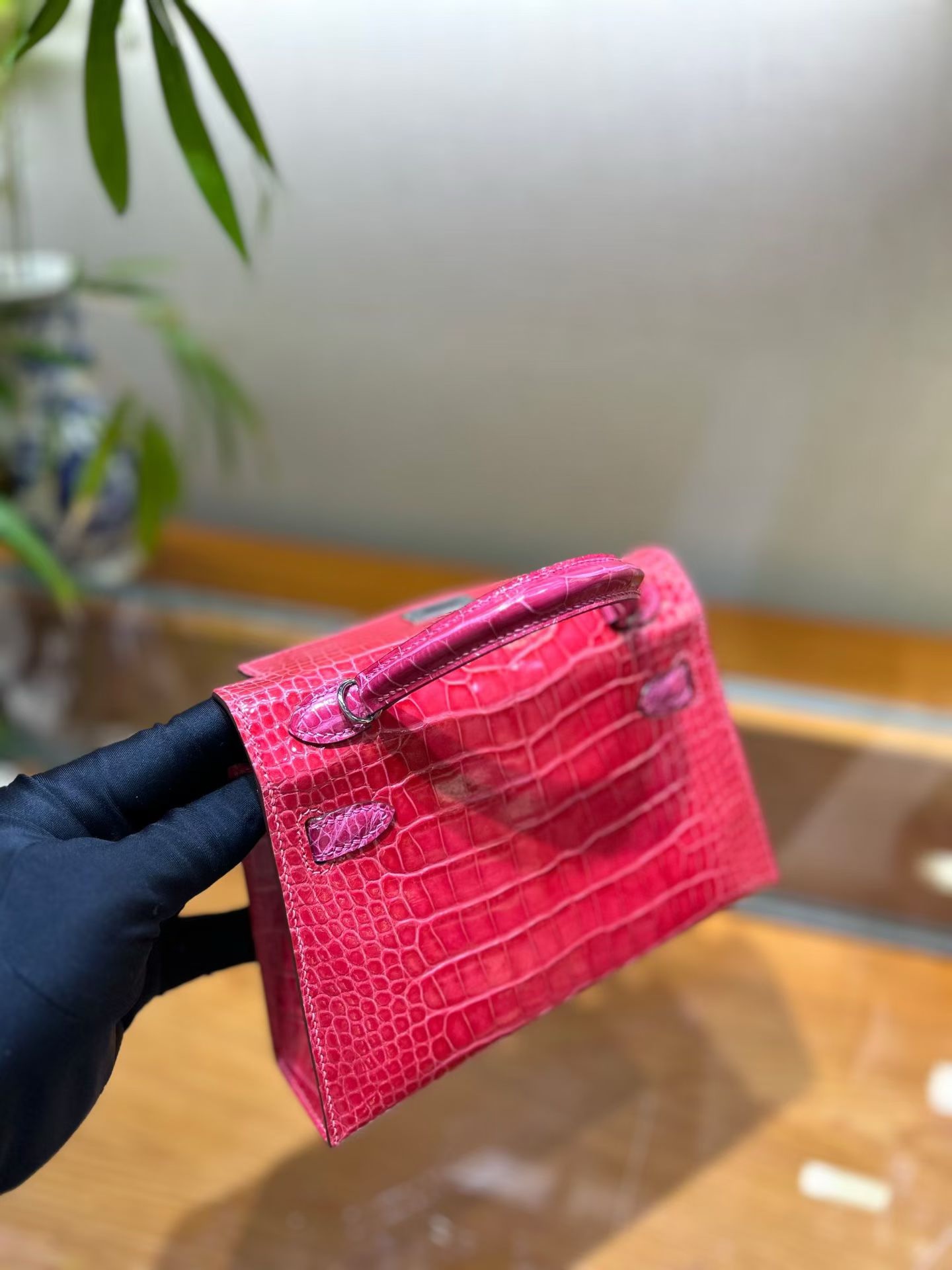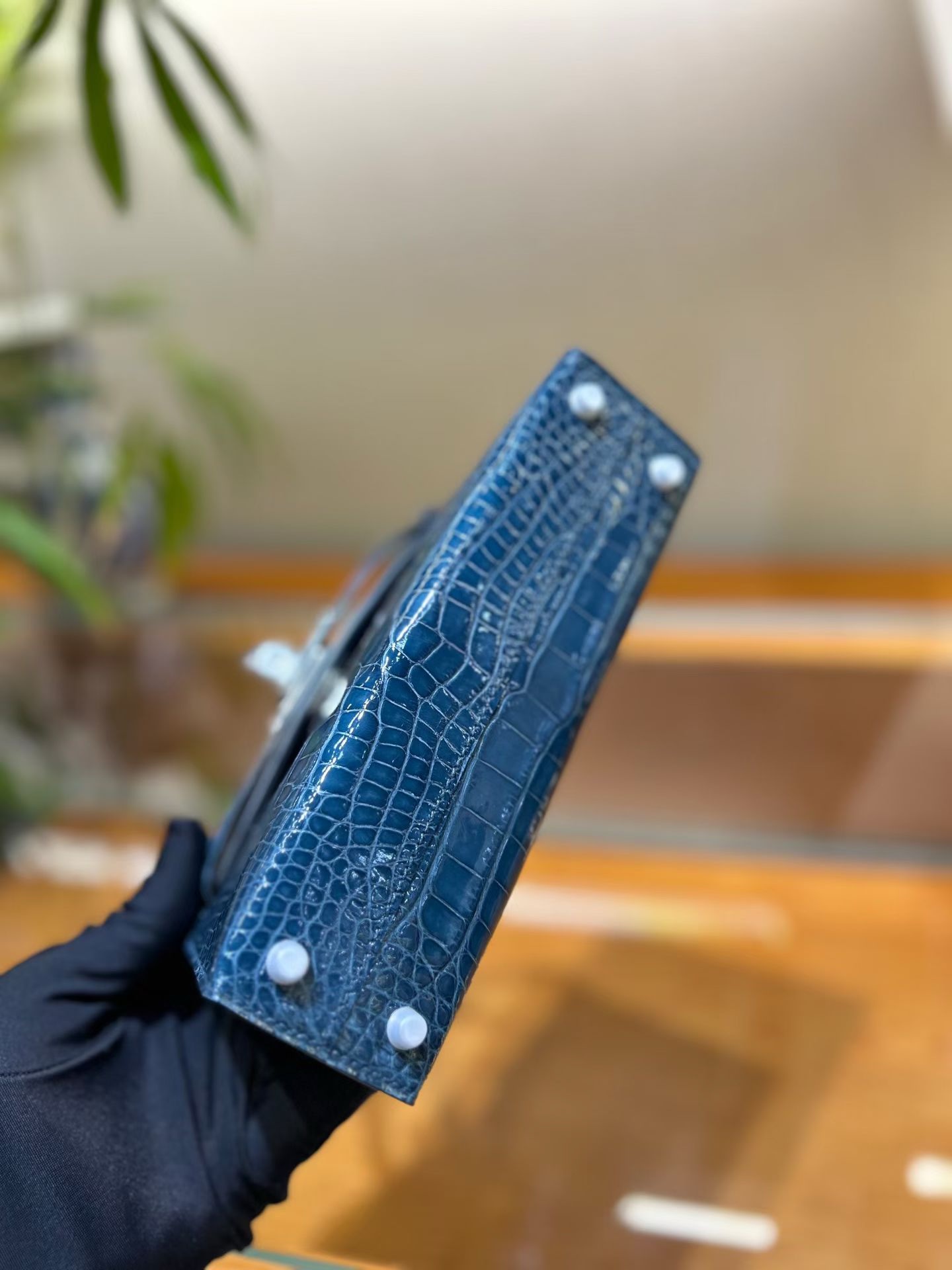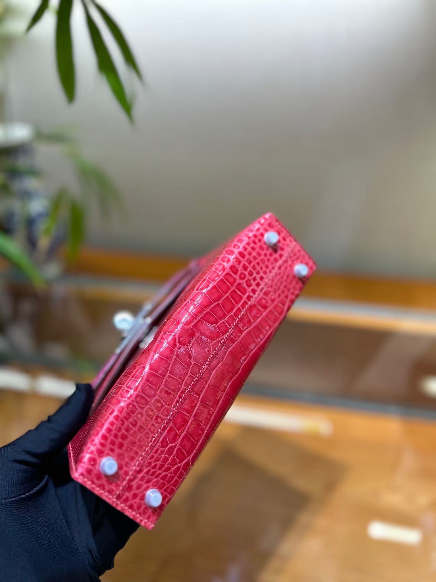 Материал и отделка: Сумка выполнена из материала с выраженной глянцевой текстурой, из кожи аллигатора.