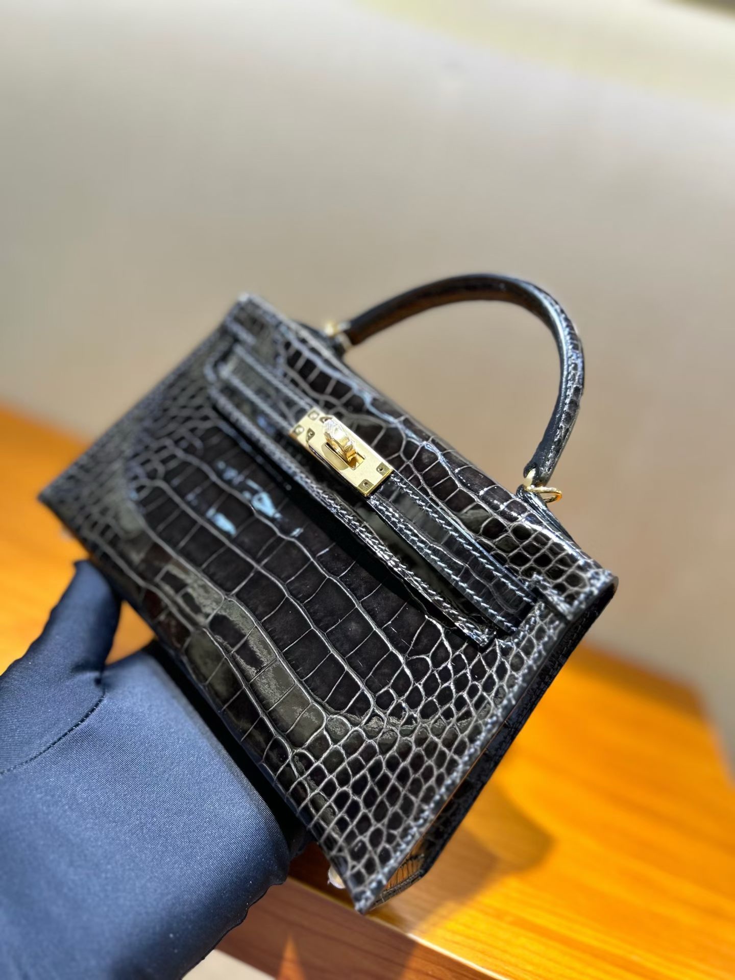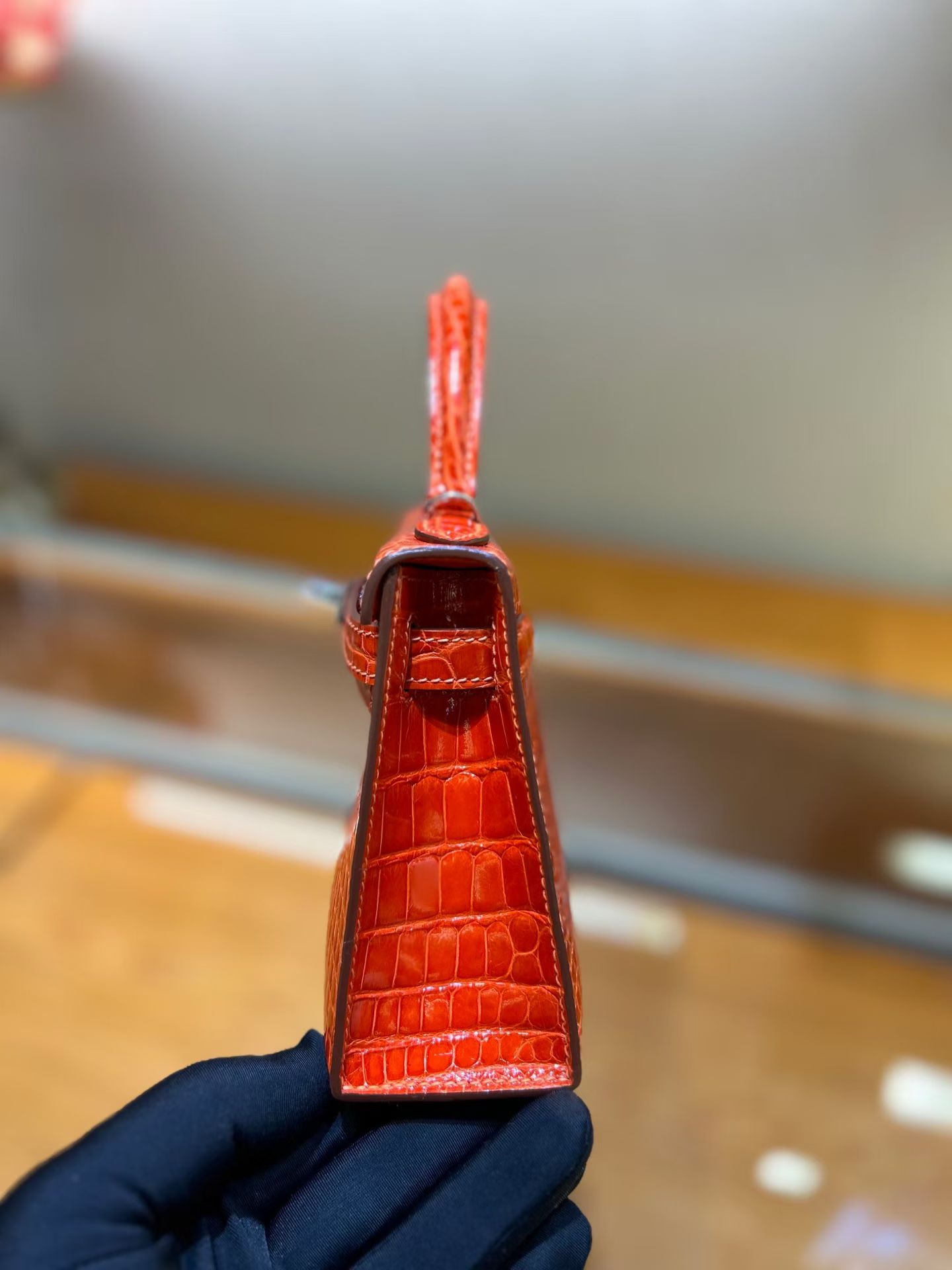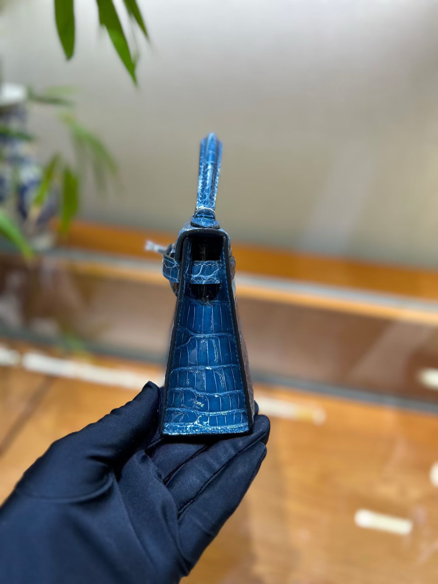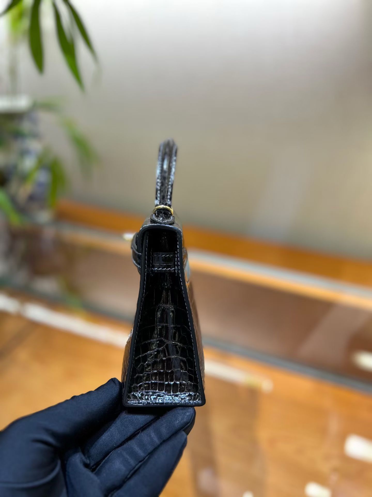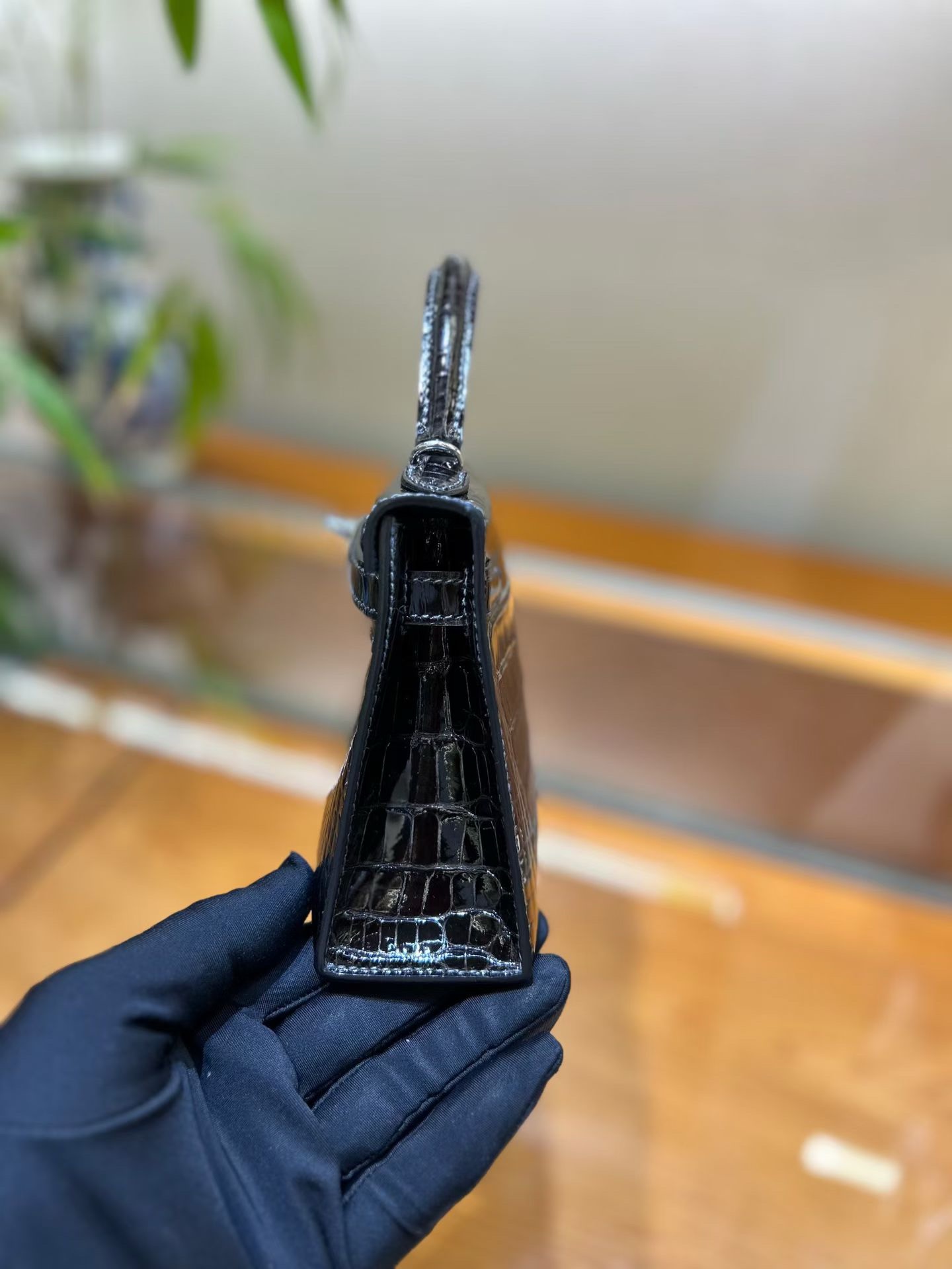 Материал и отделка: Сумка выполнена из материала с выраженной глянцевой текстурой, из кожи аллигатора.  Дизайн: Это миниатюрная сумка-тоут (или клатч с ручкой) с жестким каркасом и клапаном.  Фурнитура: Металлическая застежка и детали выполнены в золотистом цвете.  Ручка: Сумка оснащена одной короткой верхней ручкой для ношения в руке или на предплечье.  Форма: Изделие имеет четкую, структурированную форму