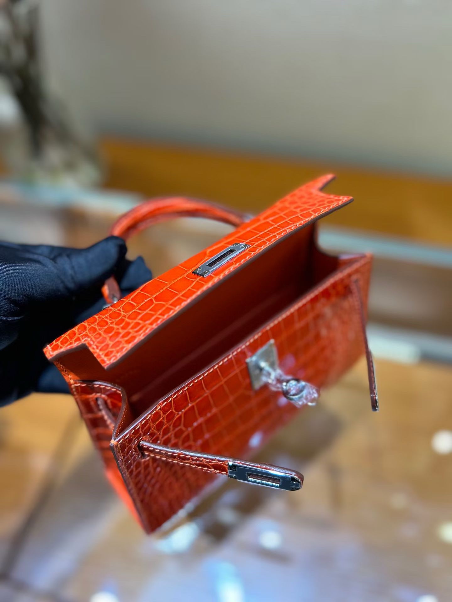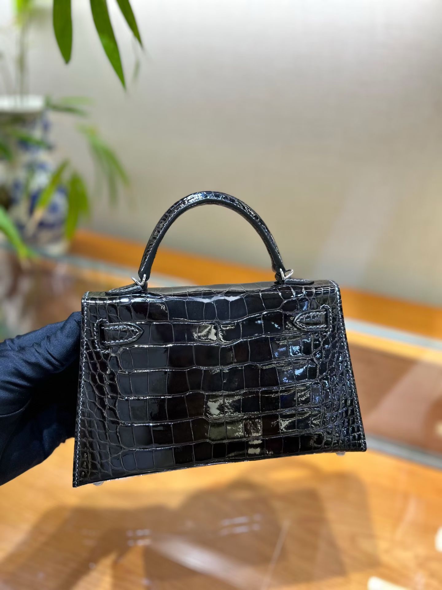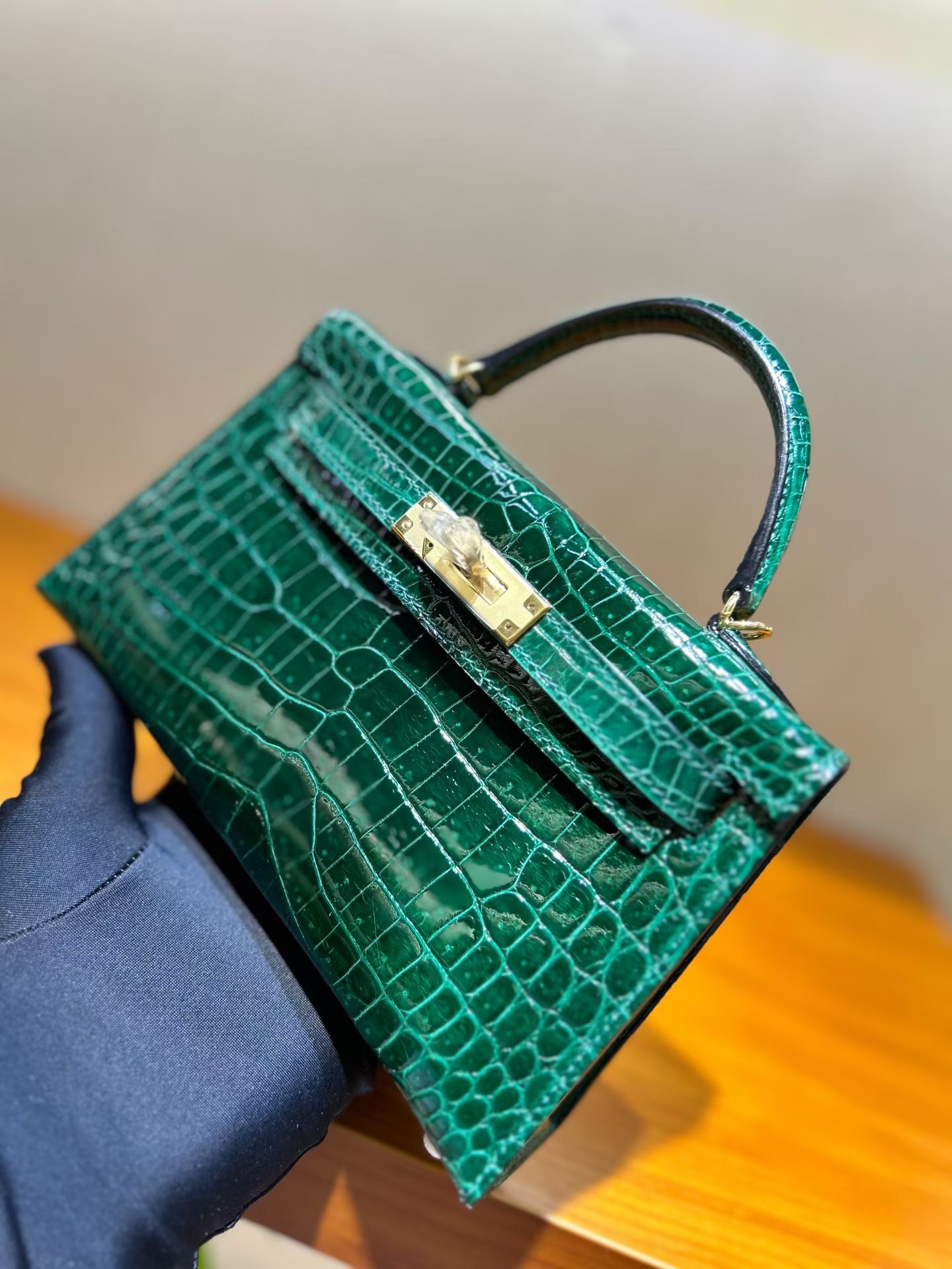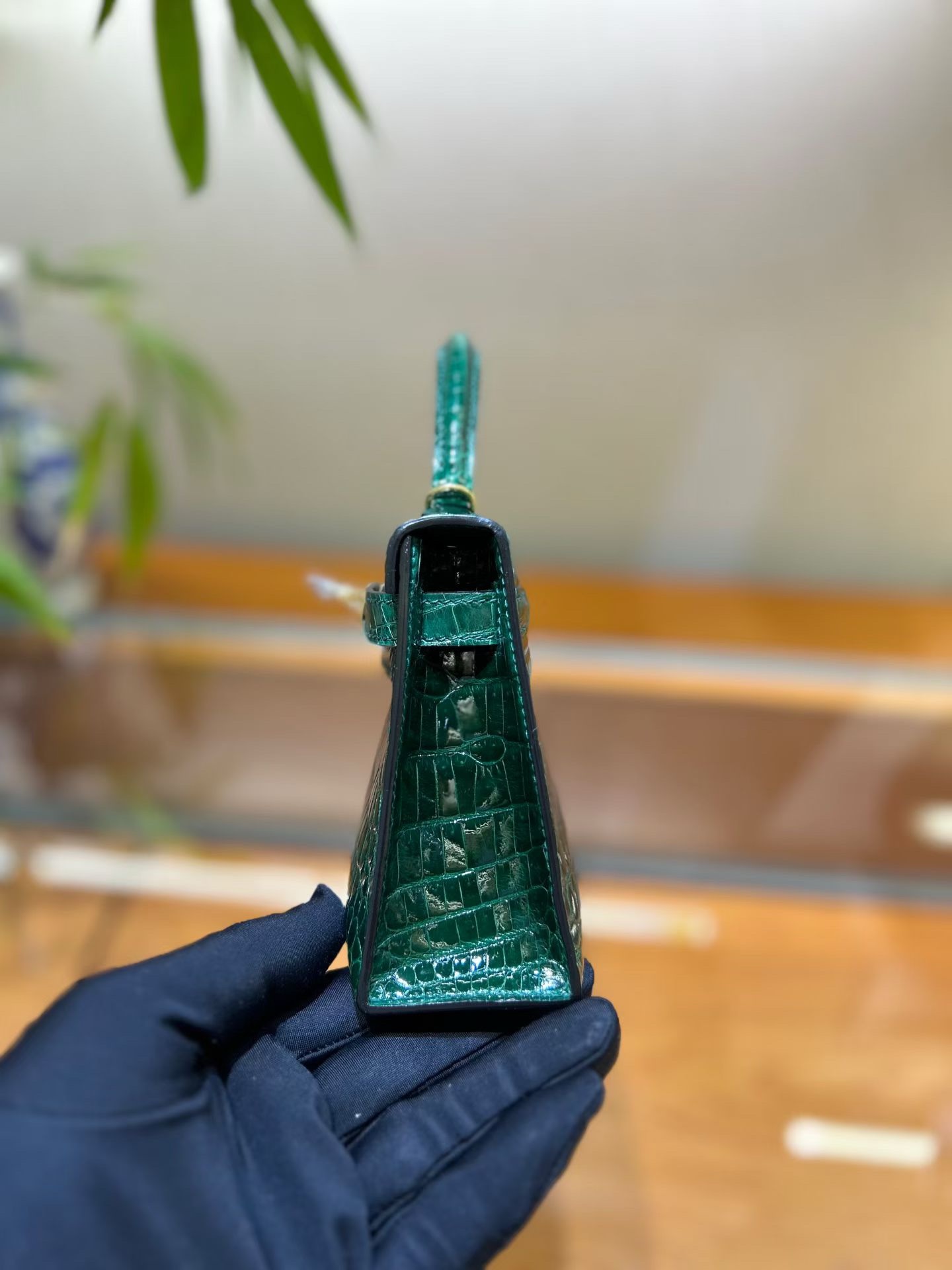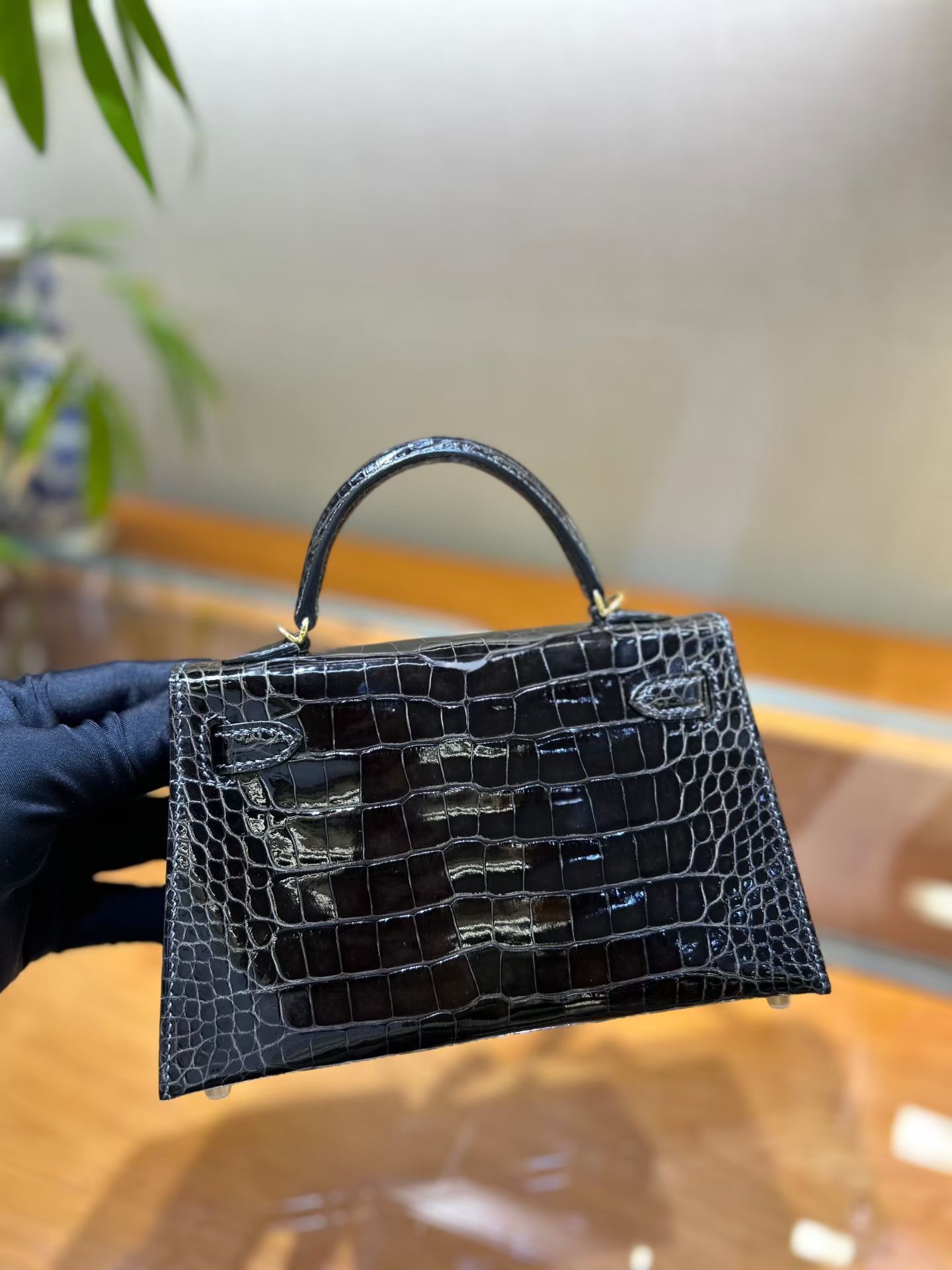 Материал и отделка: Сумка выполнена из материала с выраженной глянцевой текстурой, из кожи аллигатора.  Дизайн: Это миниатюрная сумка-тоут (или клатч с ручкой) с жестким каркасом и клапаном.  Фурнитура: Металлическая застежка и детали выполнены в золотистом цвете.  Ручка: Сумка оснащена одной короткой верхней ручкой для ношения в руке или на предплечье.  Форма: Изделие имеет четкую, структурированную форму