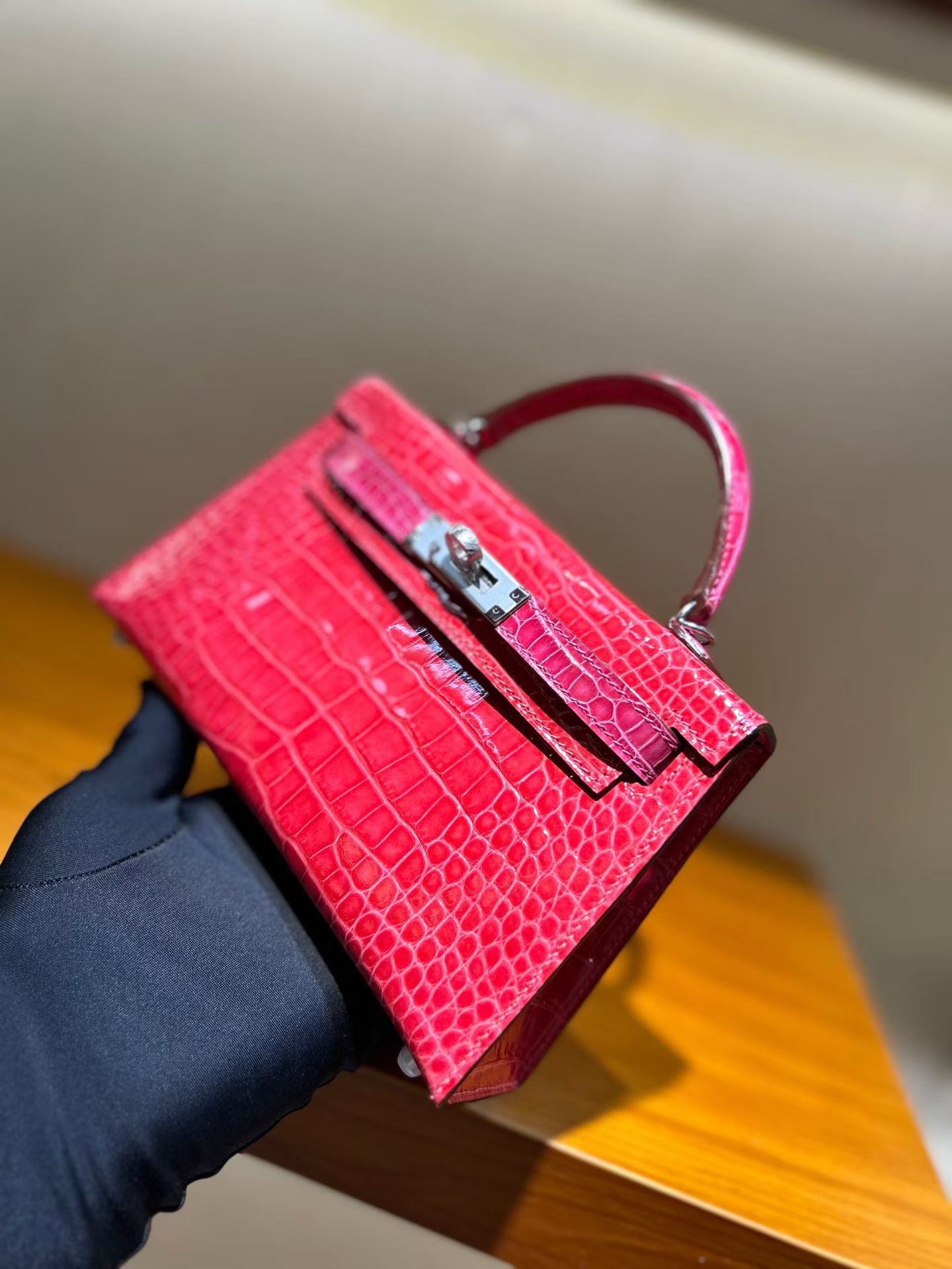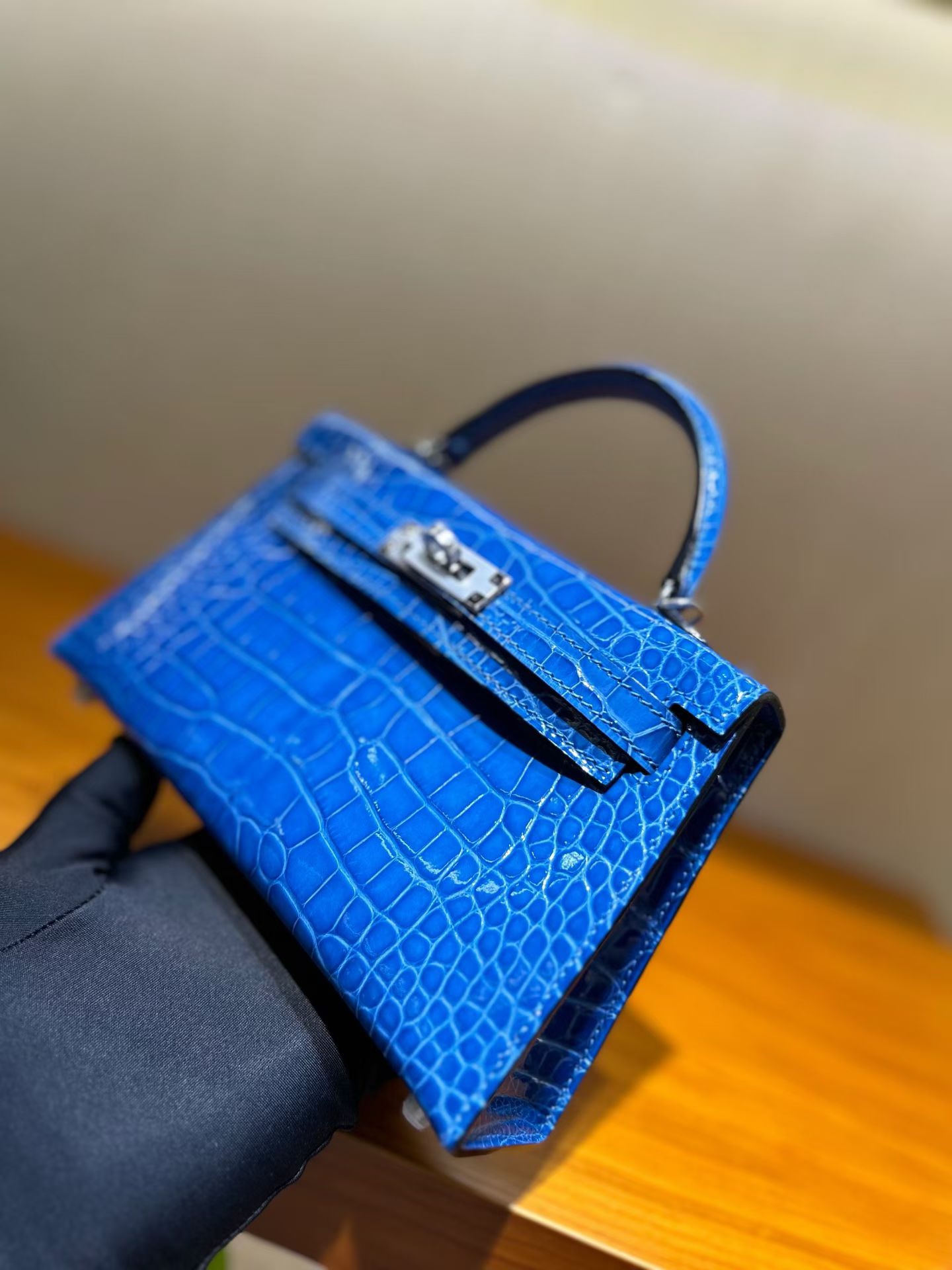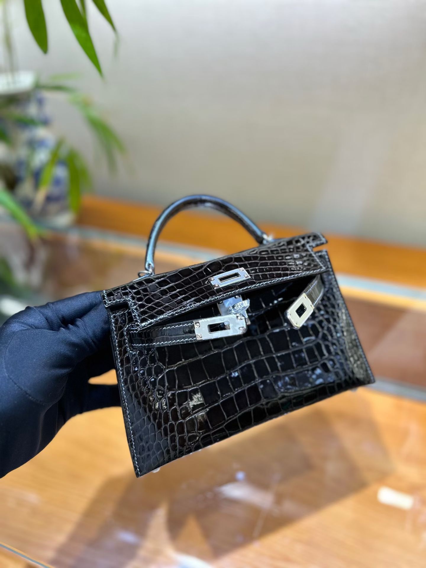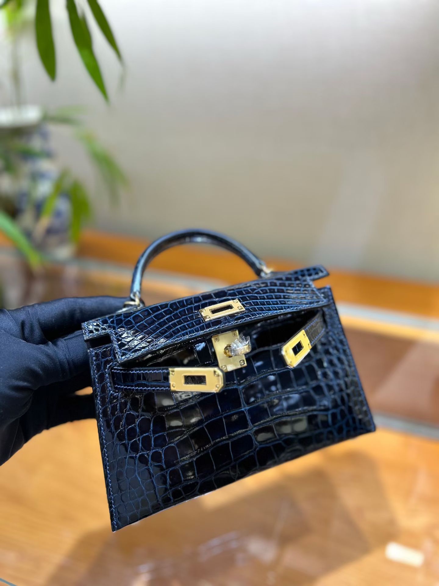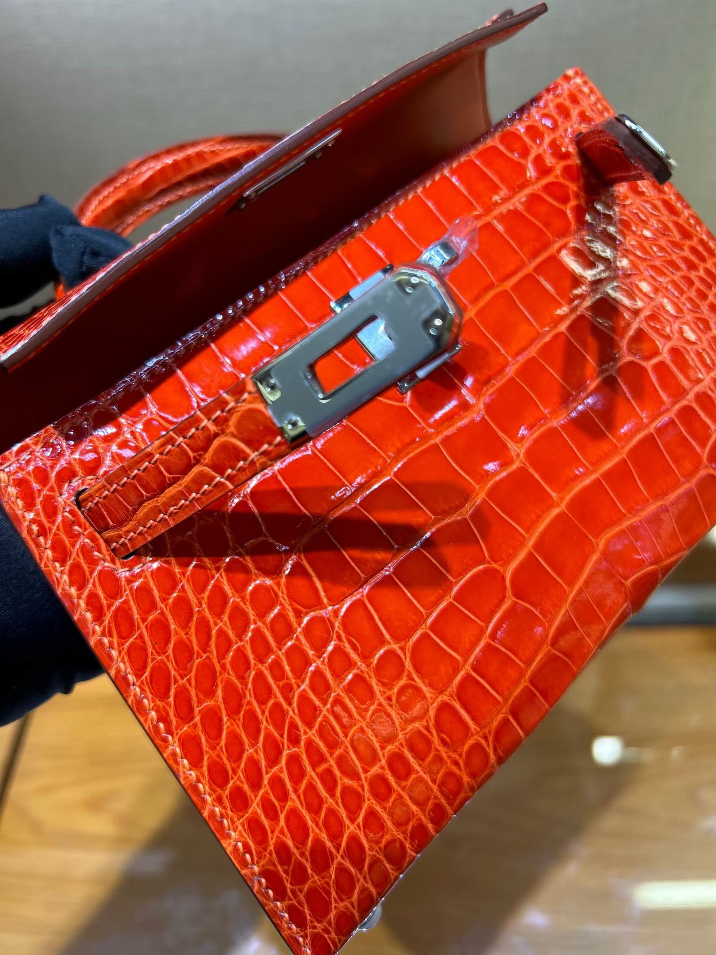 Материал и отделка: Сумка выполнена из материала с выраженной глянцевой текстурой, из кожи аллигатора.  Дизайн: Это миниатюрная сумка-тоут (или клатч с ручкой) с жестким каркасом и клапаном.  Фурнитура: Металлическая застежка и детали выполнены в золотистом цвете.  Ручка: Сумка оснащена одной короткой верхней ручкой для ношения в руке или на предплечье.  Форма: Изделие имеет четкую, структурированную форму