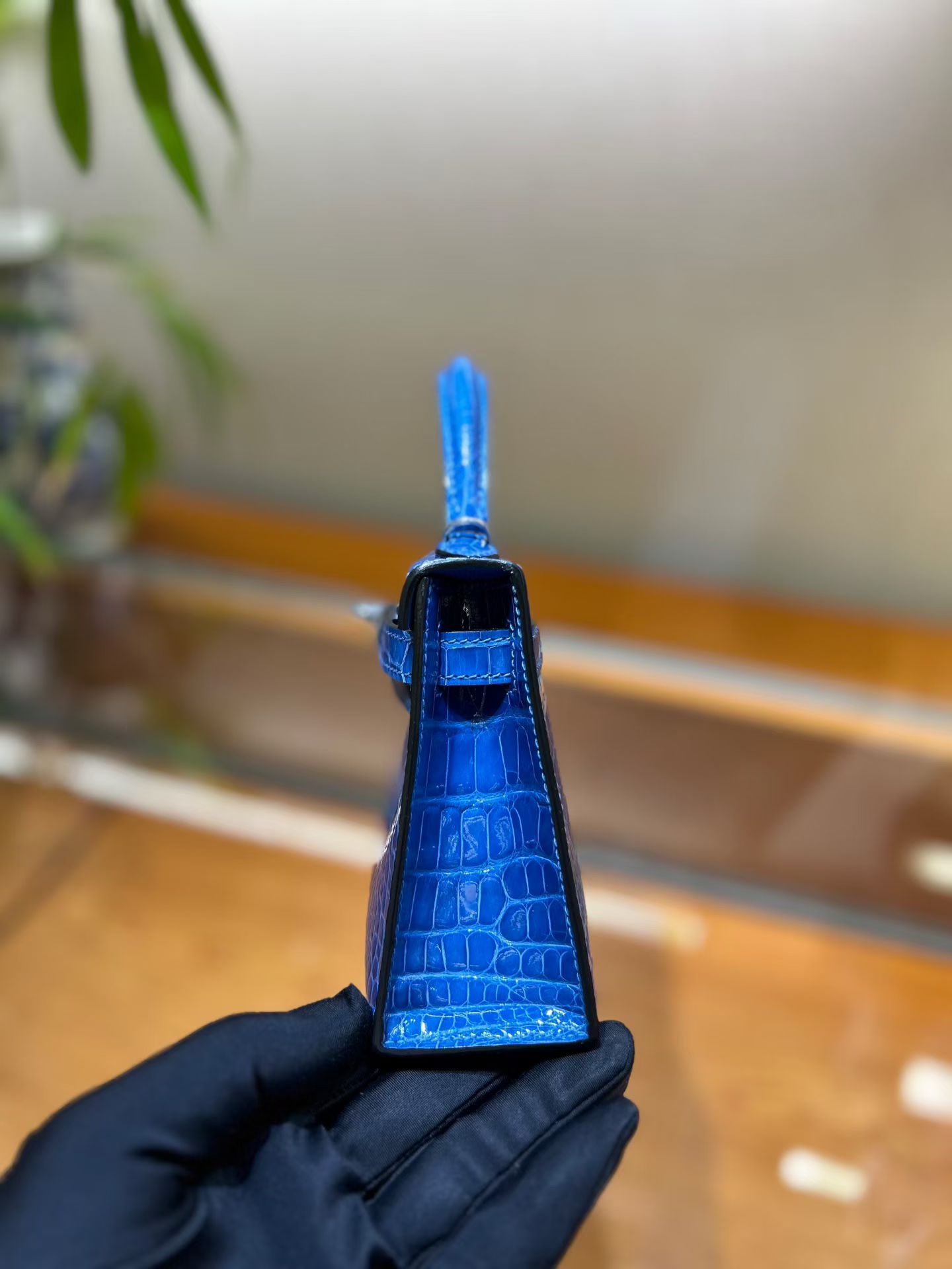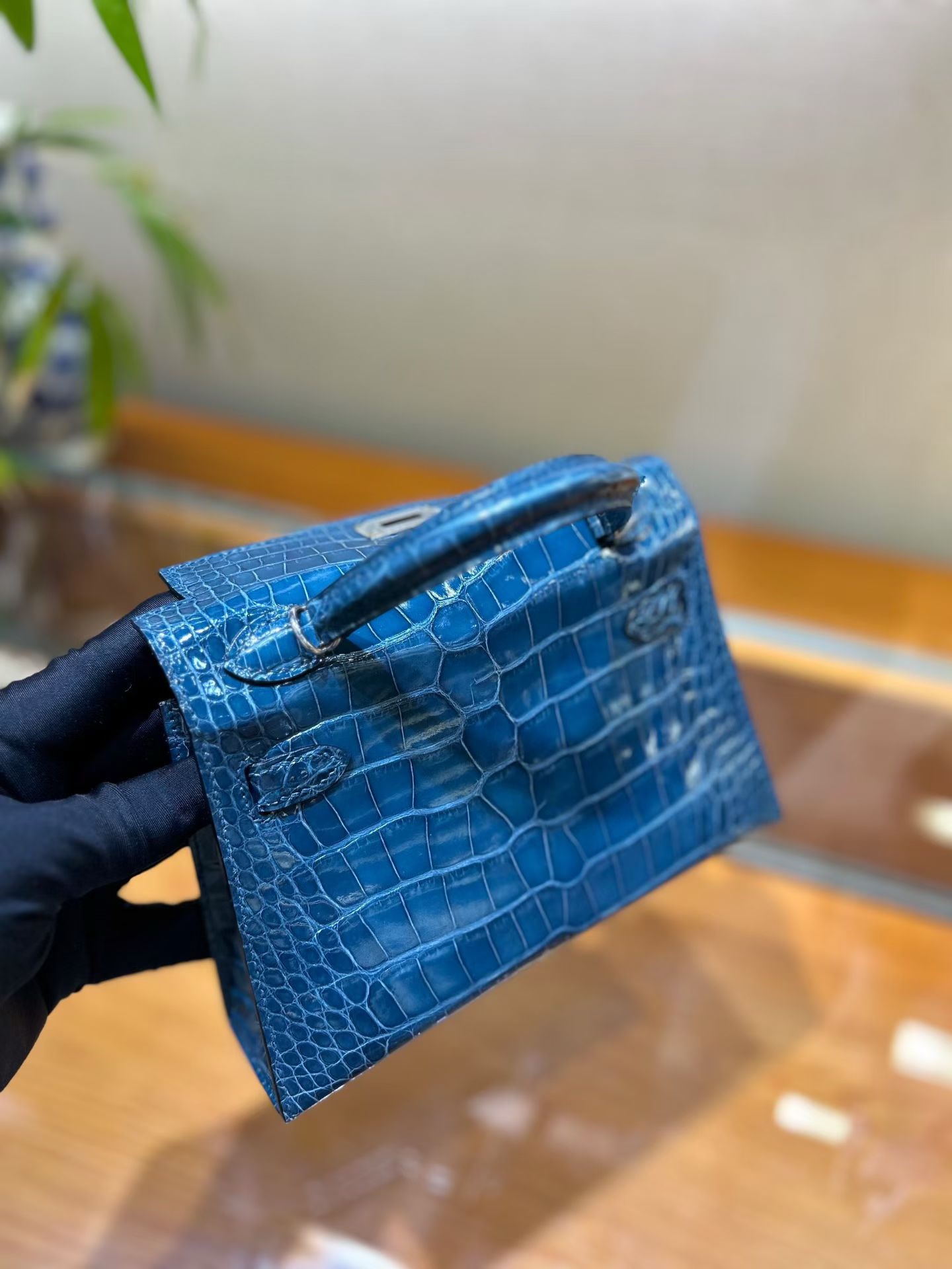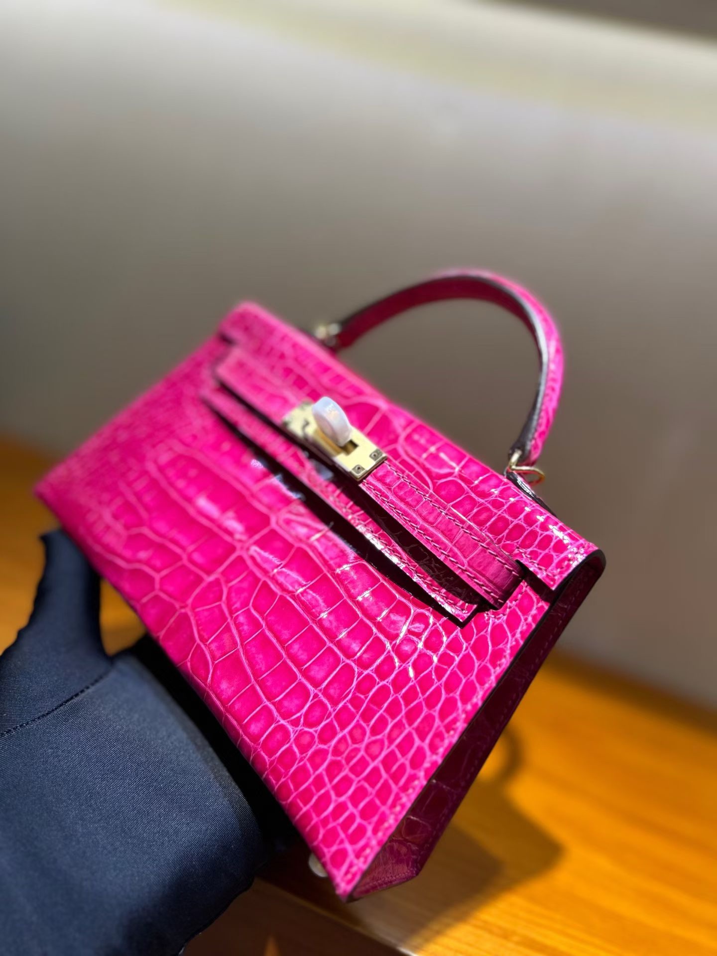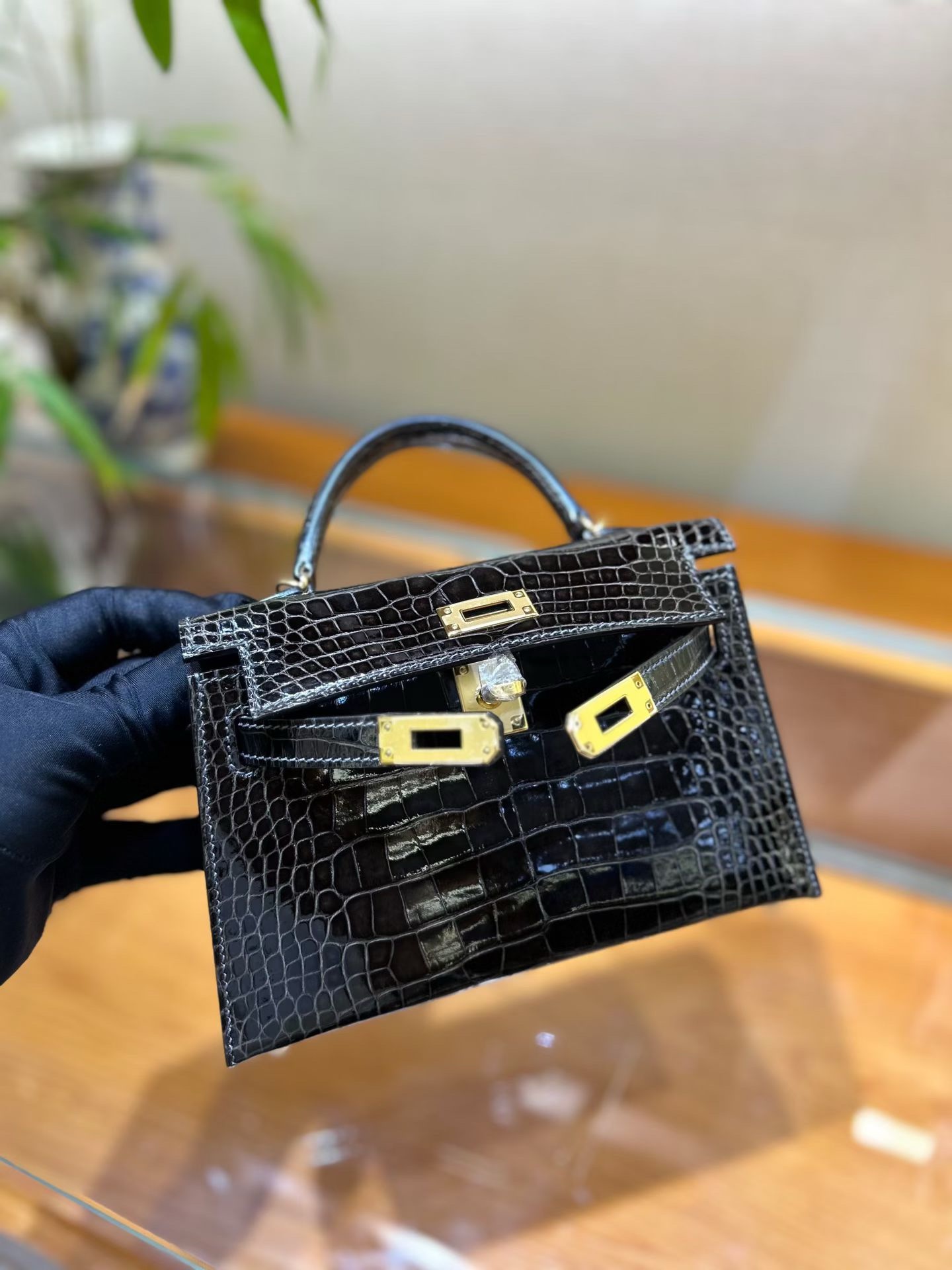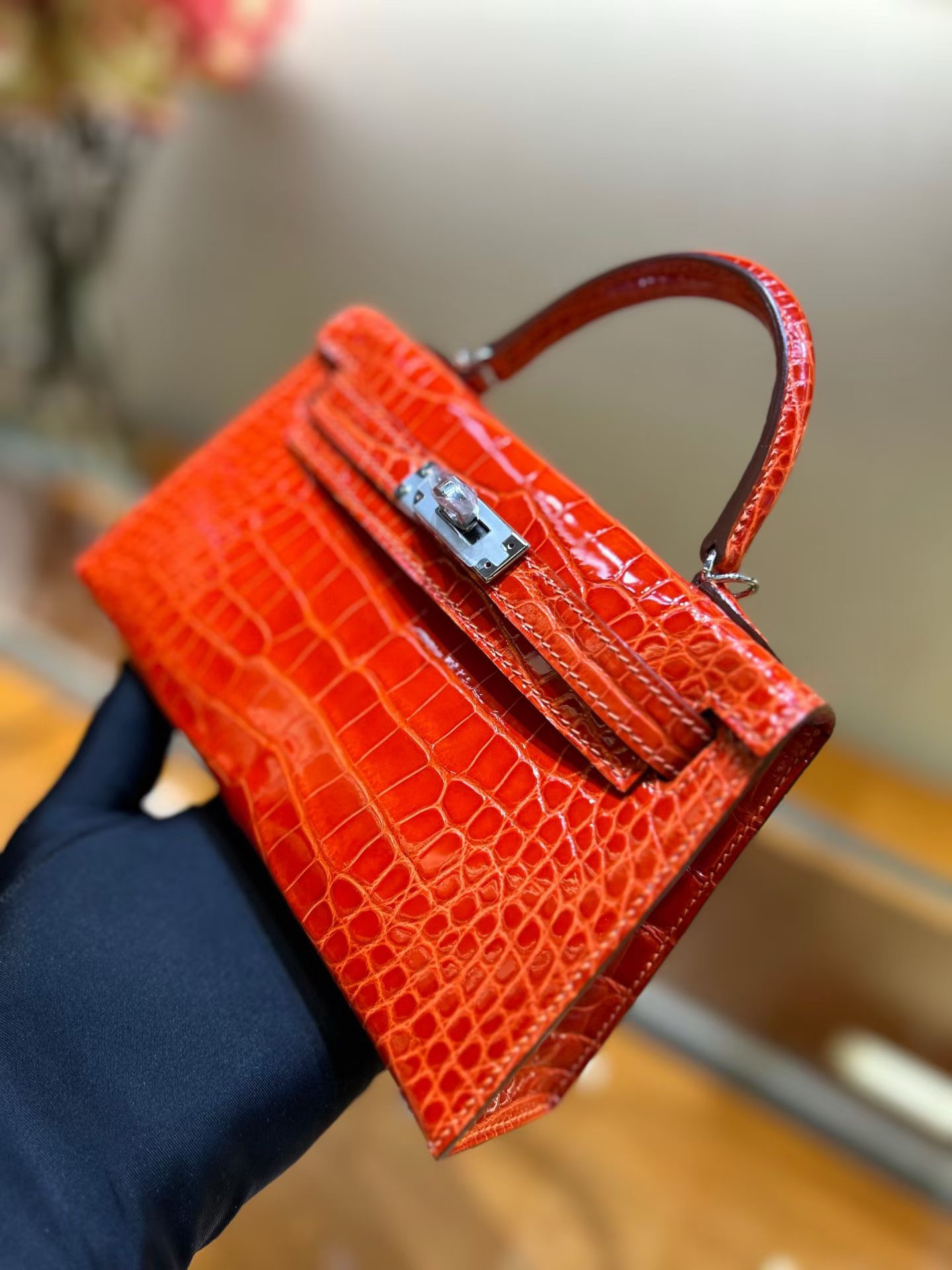 Материал и отделка: Сумка выполнена из материала с выраженной глянцевой текстурой, из кожи аллигатора.  Дизайн: Это миниатюрная сумка-тоут (или клатч с ручкой) с жестким каркасом и клапаном.  Фурнитура: Металлическая застежка и детали выполнены в золотистом цвете.  Ручка: Сумка оснащена одной короткой верхней ручкой для ношения в руке или на предплечье.  Форма: Изделие имеет четкую, структурированную форму