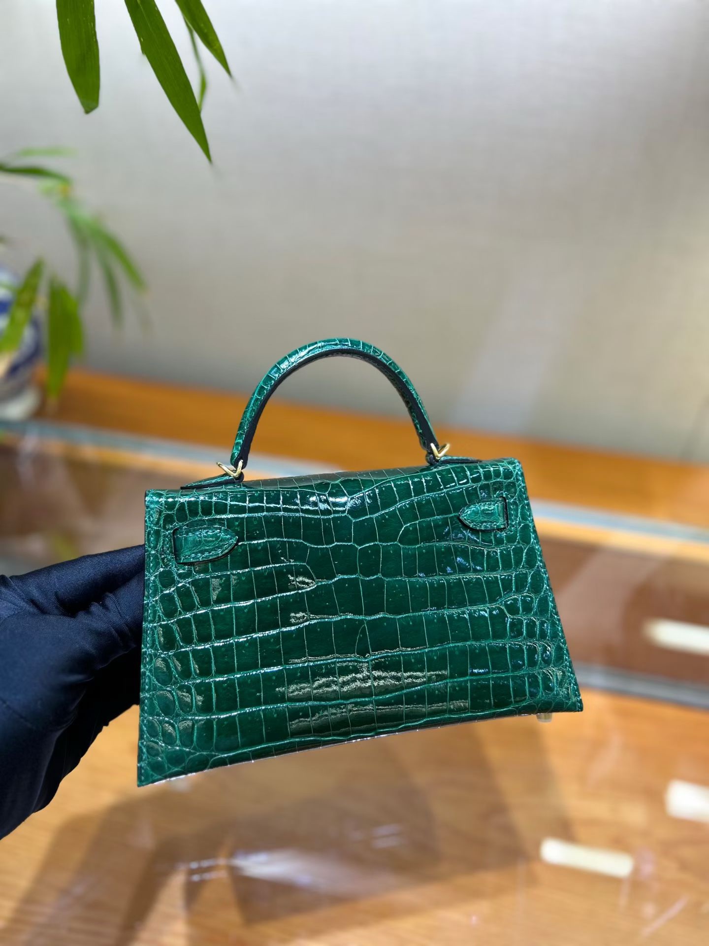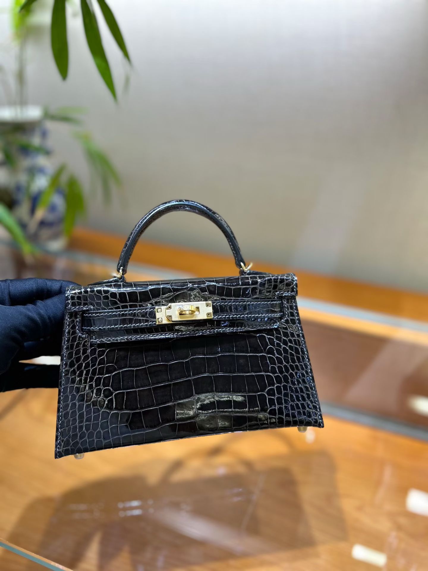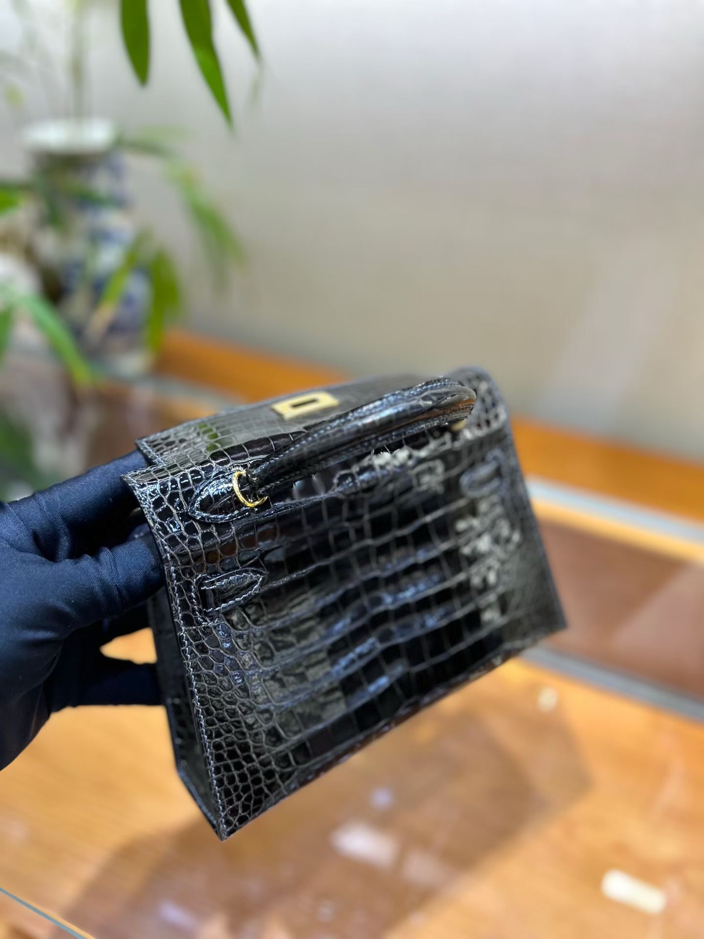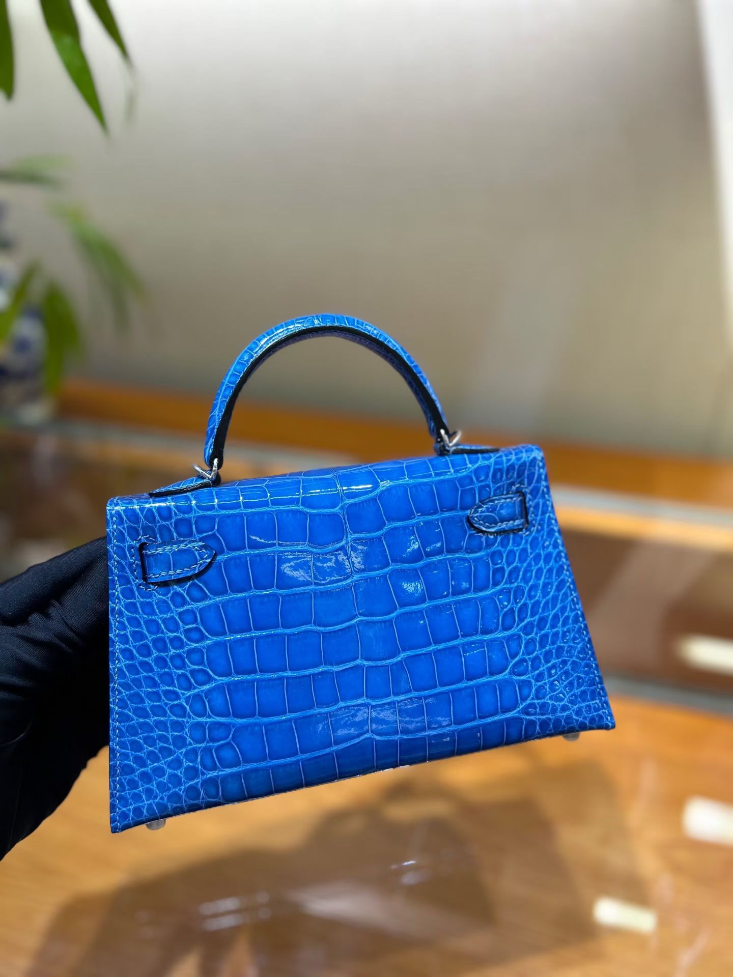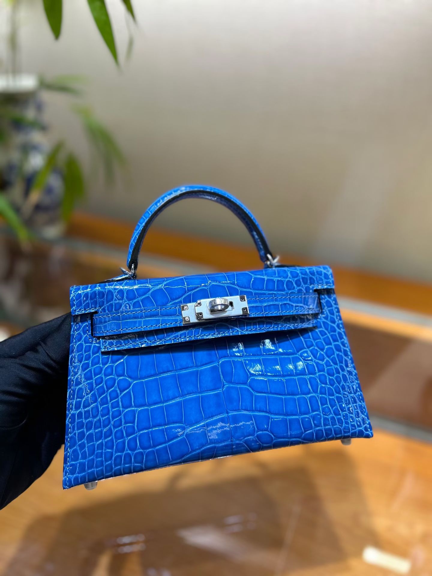 Материал и отделка: Сумка выполнена из материала с выраженной глянцевой текстурой, из кожи аллигатора.  Дизайн: Это миниатюрная сумка-тоут (или клатч с ручкой) с жестким каркасом и клапаном.  Фурнитура: Металлическая застежка и детали выполнены в золотистом цвете.  Ручка: Сумка оснащена одной короткой верхней ручкой для ношения в руке или на предплечье.  Форма: Изделие имеет четкую, структурированную форму
