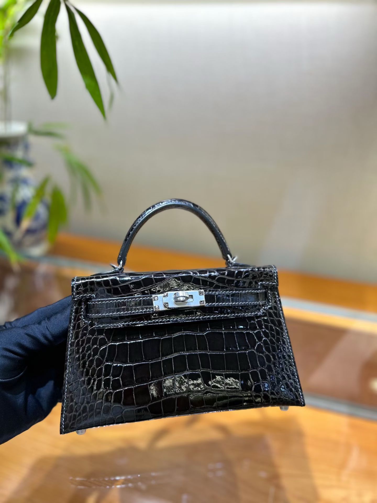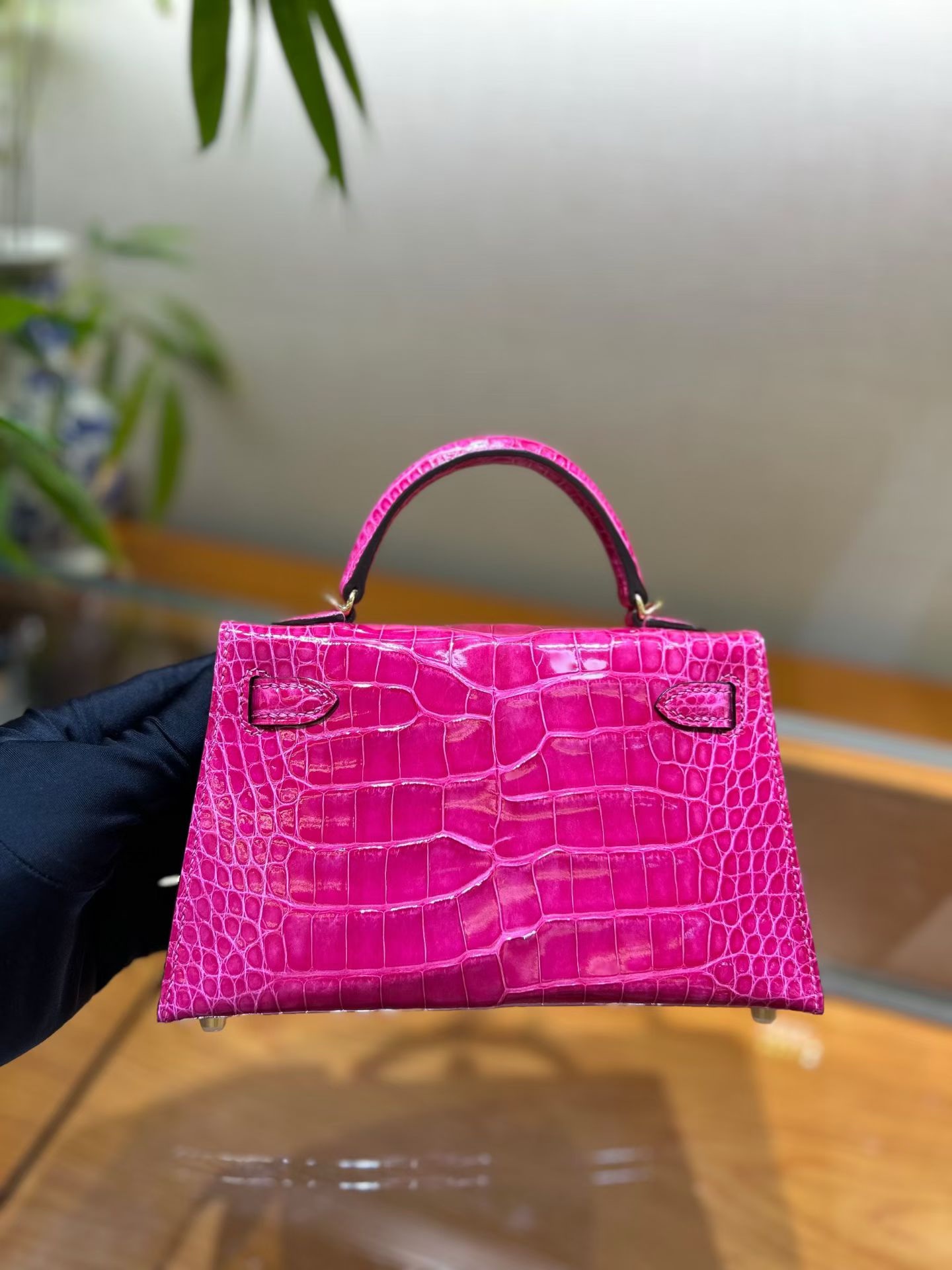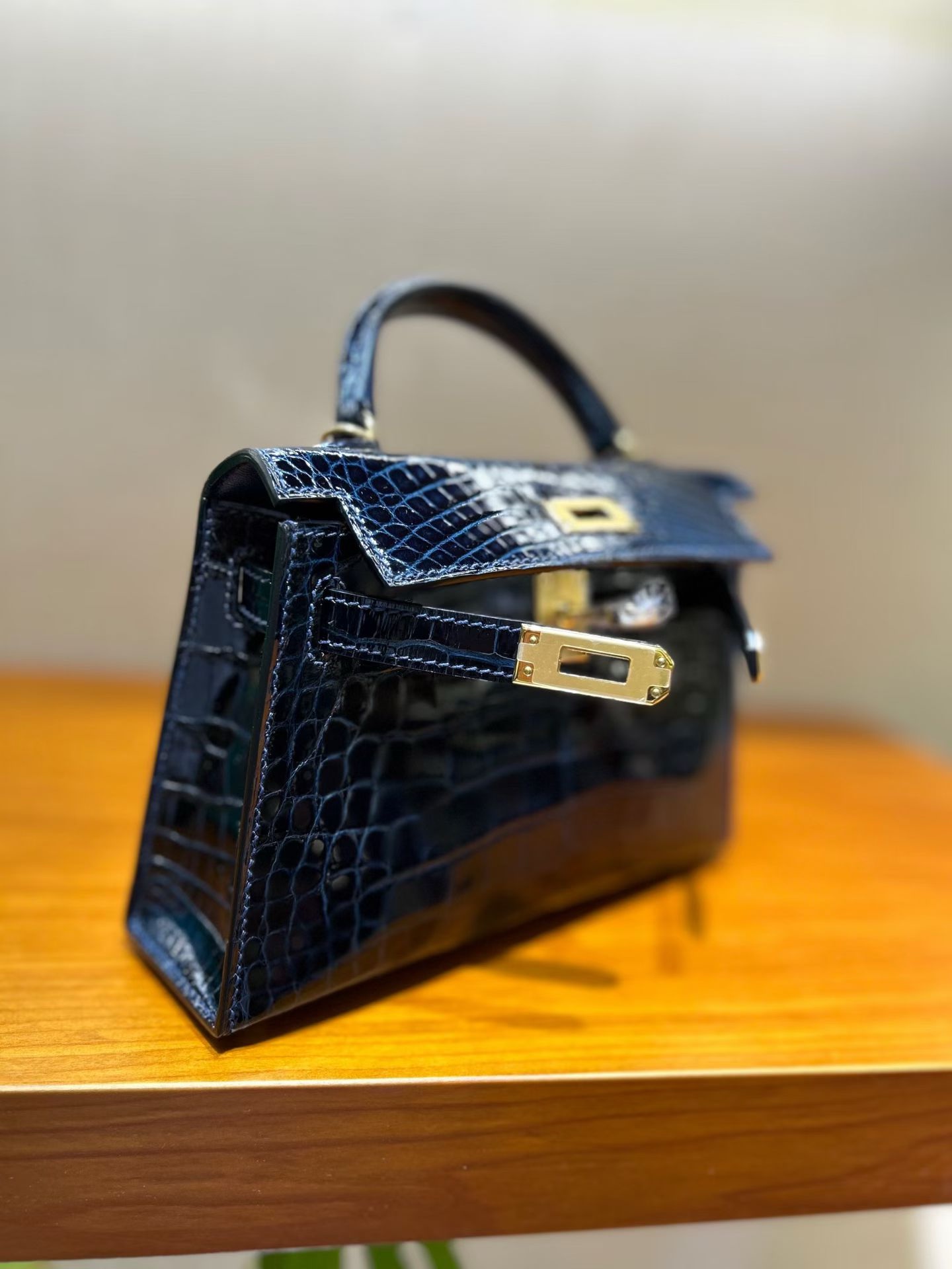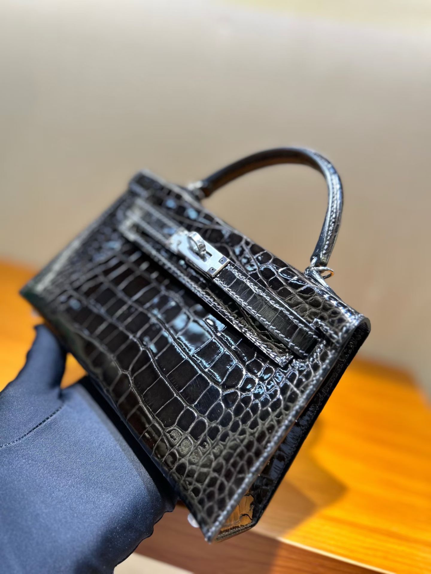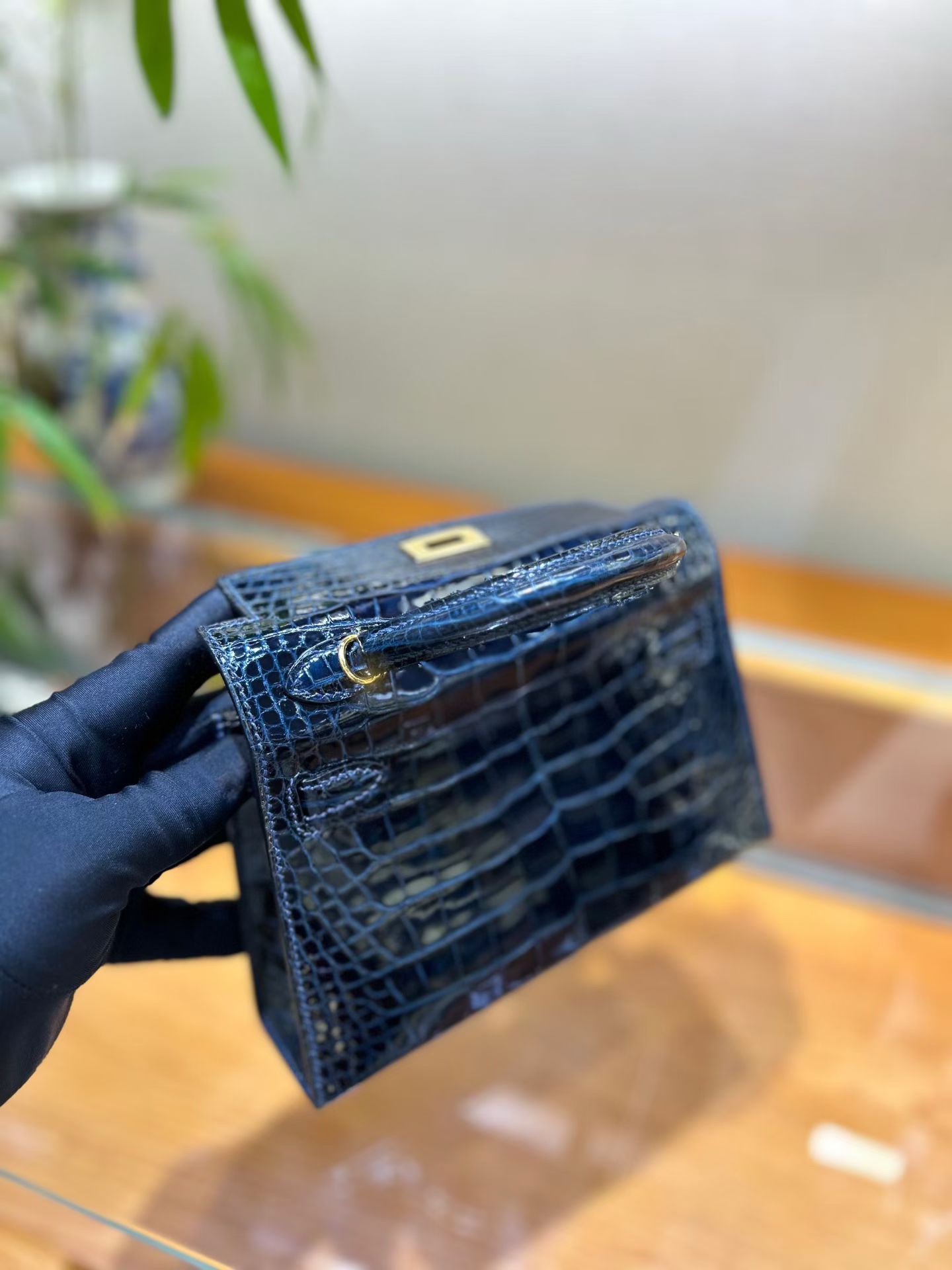 Материал и отделка: Сумка выполнена из материала с выраженной глянцевой текстурой, из кожи аллигатора.  Дизайн: Это миниатюрная сумка-тоут (или клатч с ручкой) с жестким каркасом и клапаном.  Фурнитура: Металлическая застежка и детали выполнены в золотистом цвете.  Ручка: Сумка оснащена одной короткой верхней ручкой для ношения в руке или на предплечье.  Форма: Изделие имеет четкую, структурированную форму