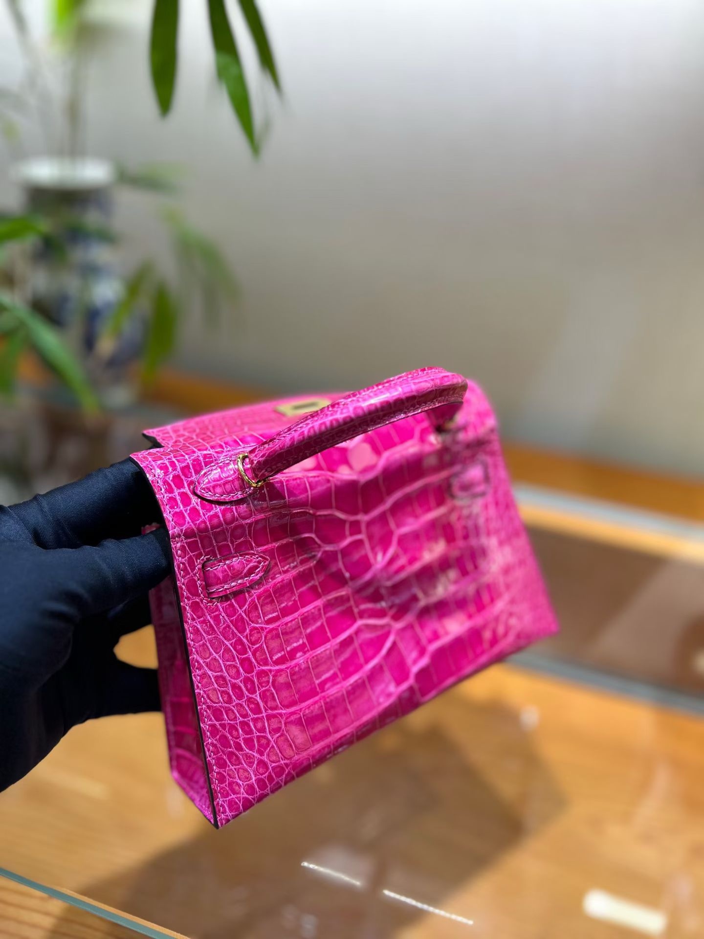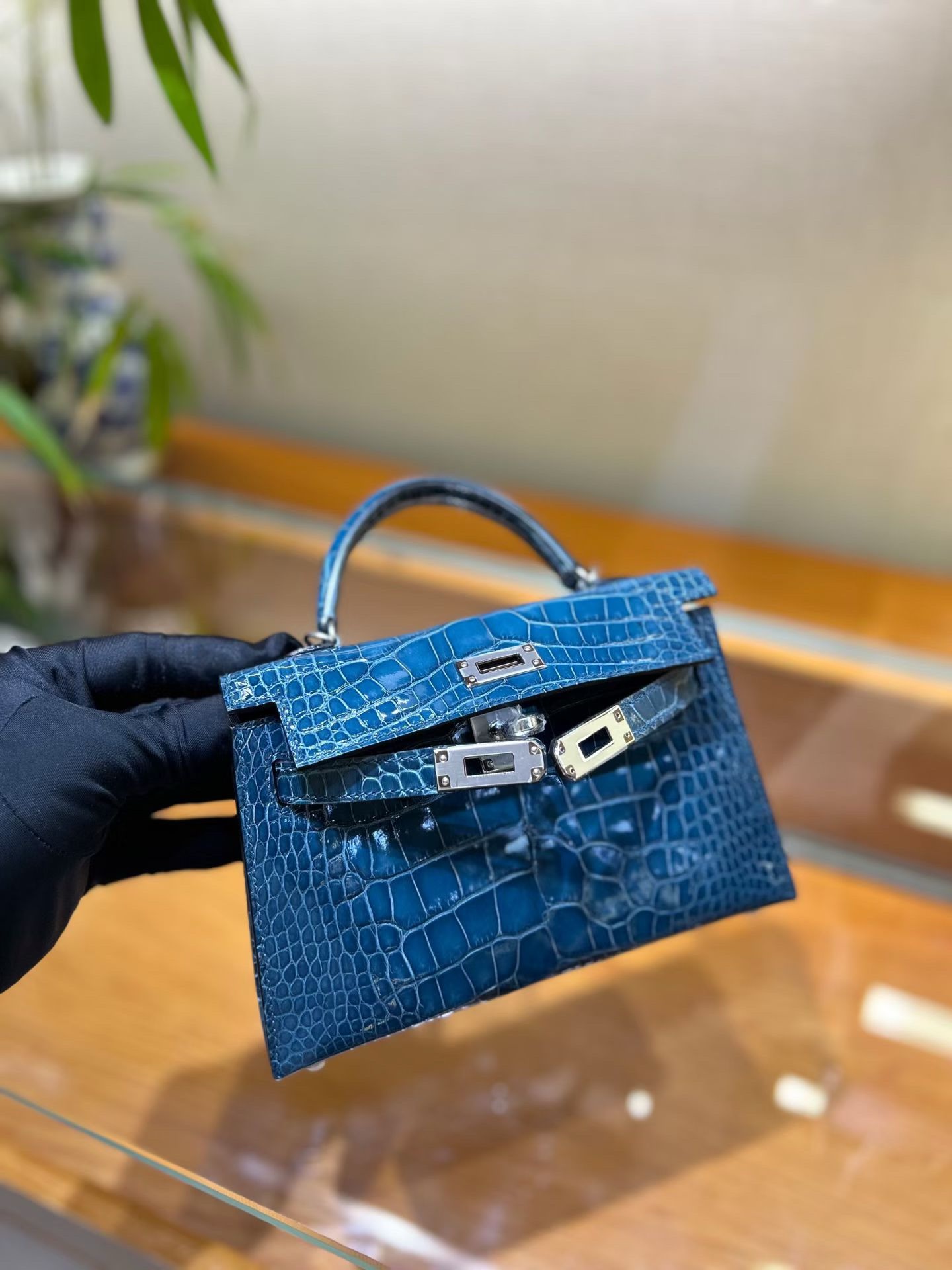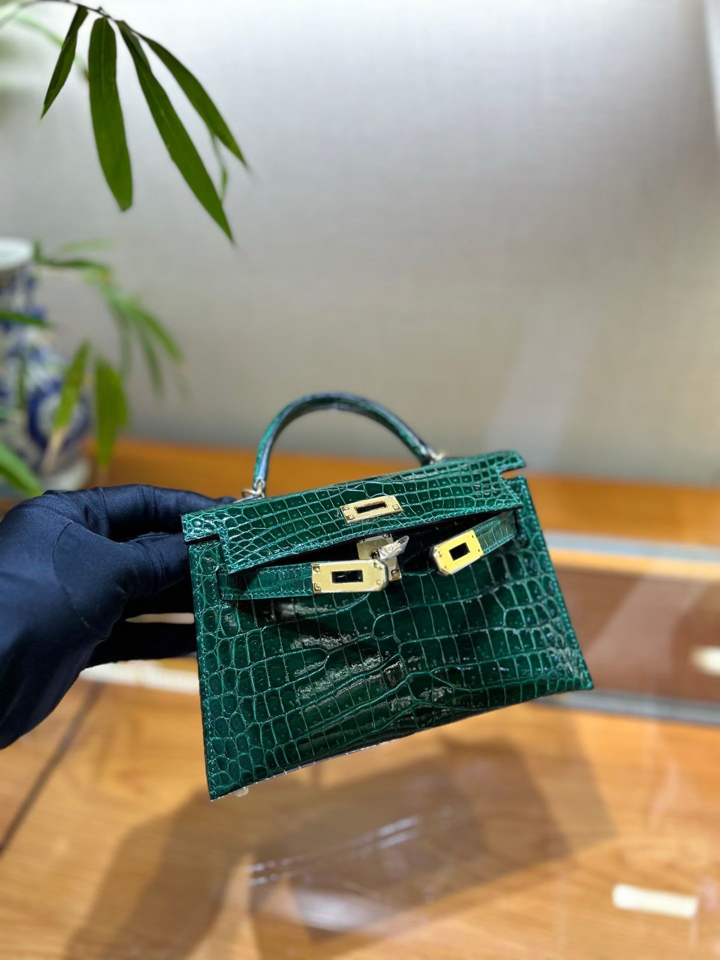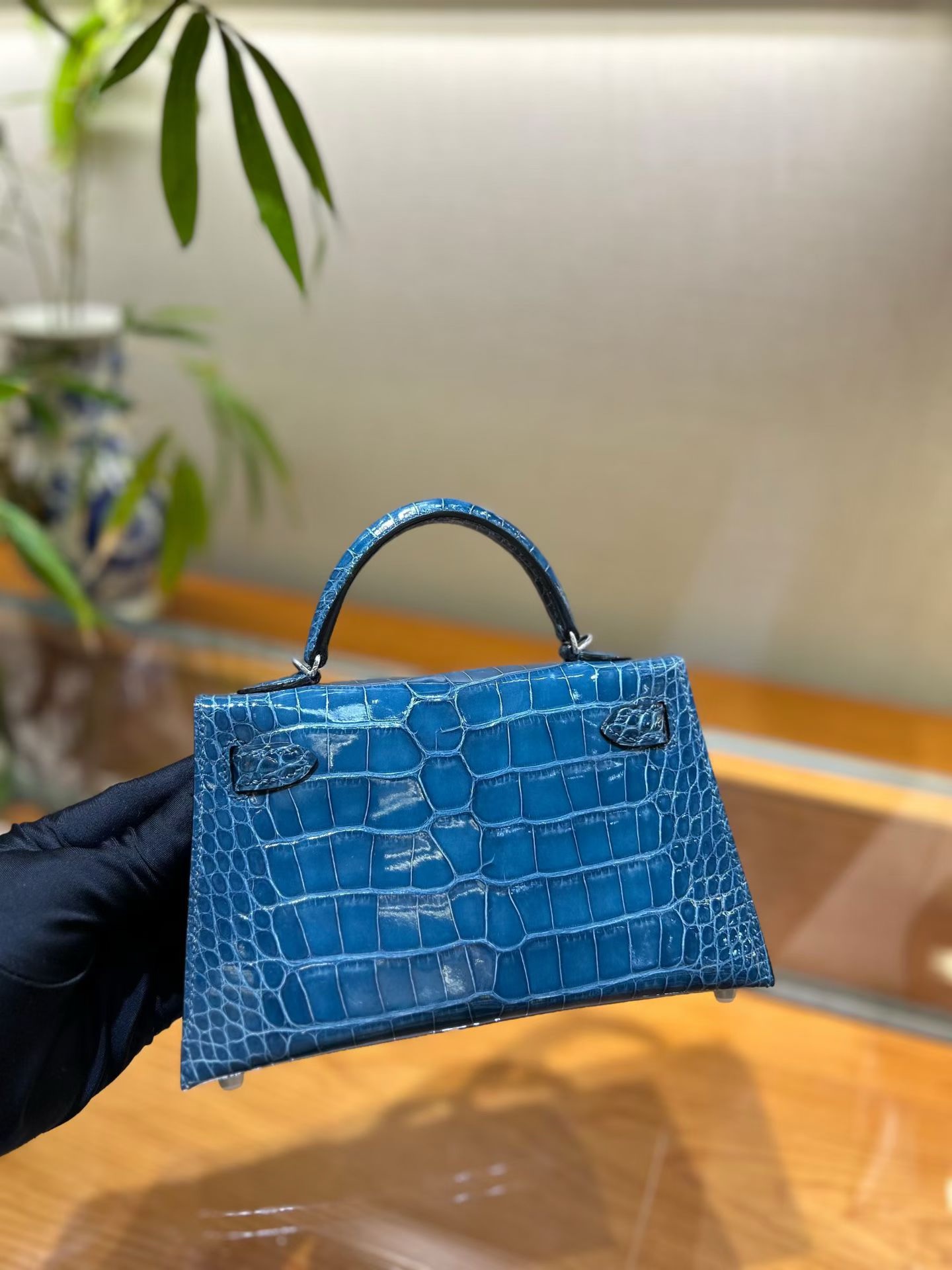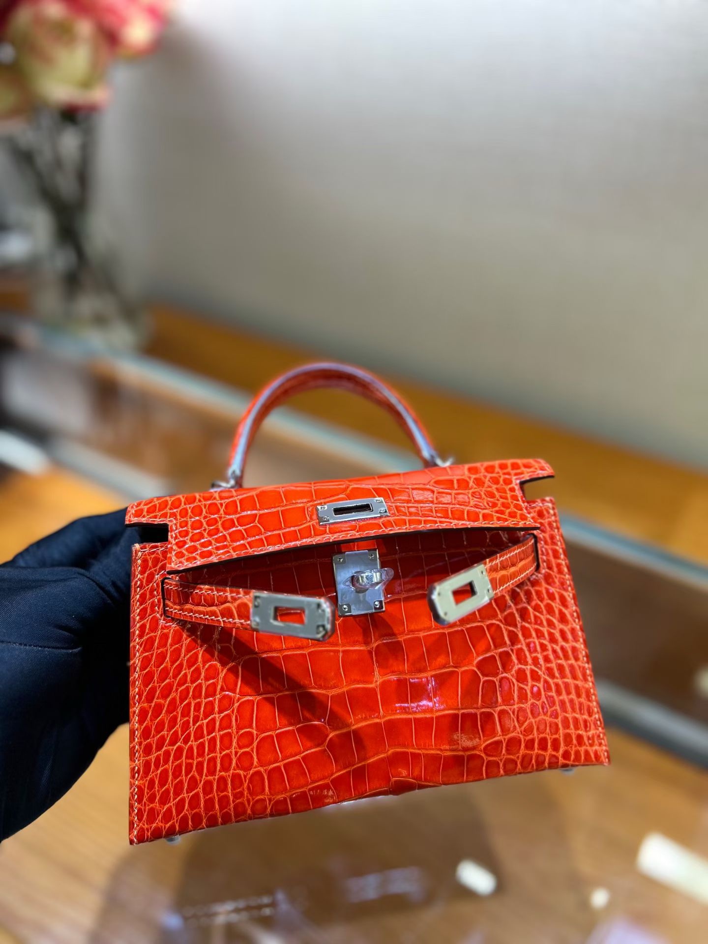 Материал и отделка: Сумка выполнена из материала с выраженной глянцевой текстурой, из кожи аллигатора.  Дизайн: Это миниатюрная сумка-тоут (или клатч с ручкой) с жестким каркасом и клапаном.  Фурнитура: Металлическая застежка и детали выполнены в золотистом цвете.  Ручка: Сумка оснащена одной короткой верхней ручкой для ношения в руке или на предплечье.  Форма: Изделие имеет четкую, структурированную форму