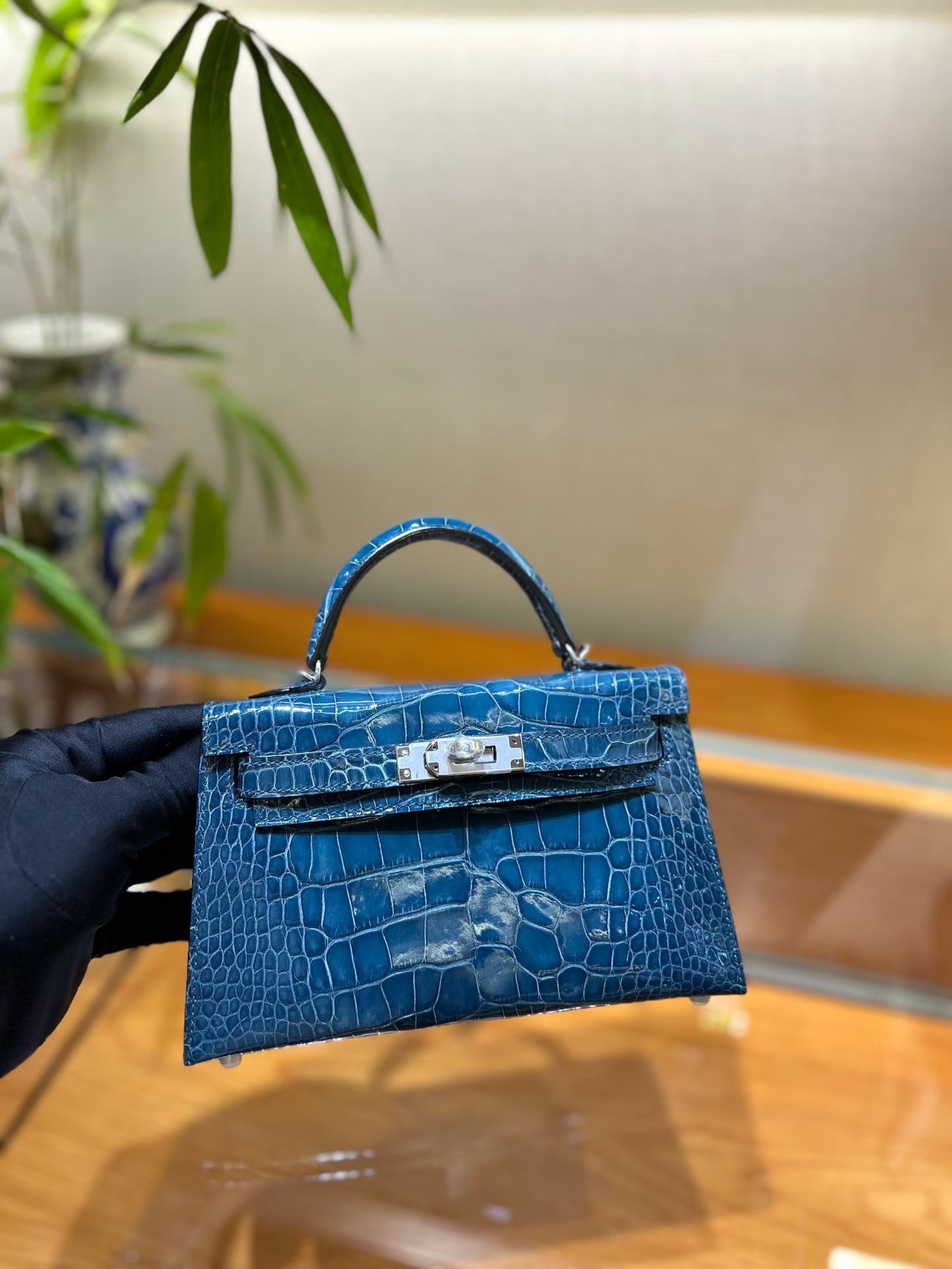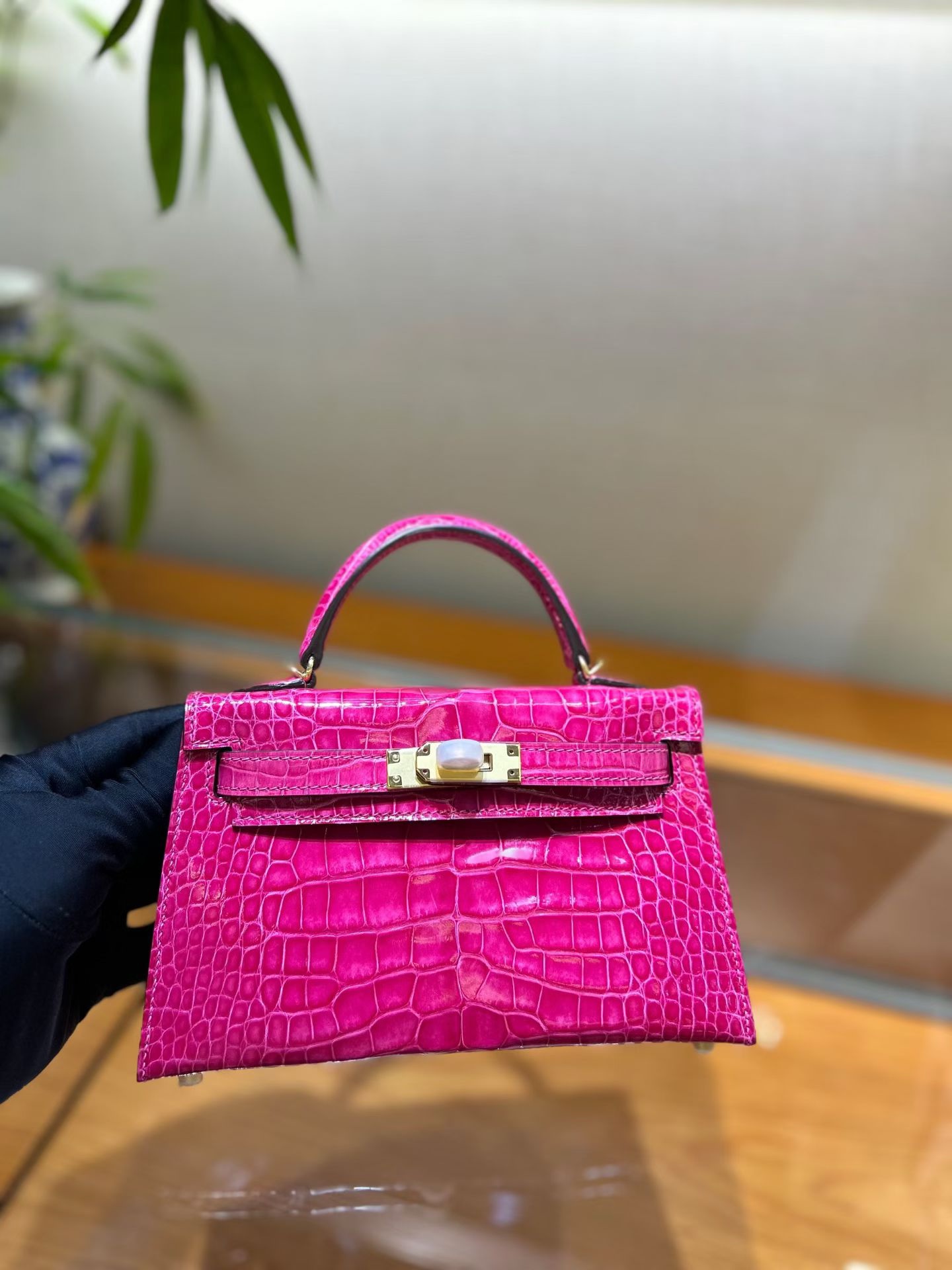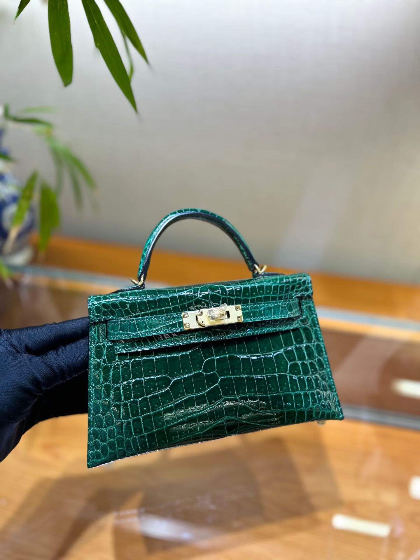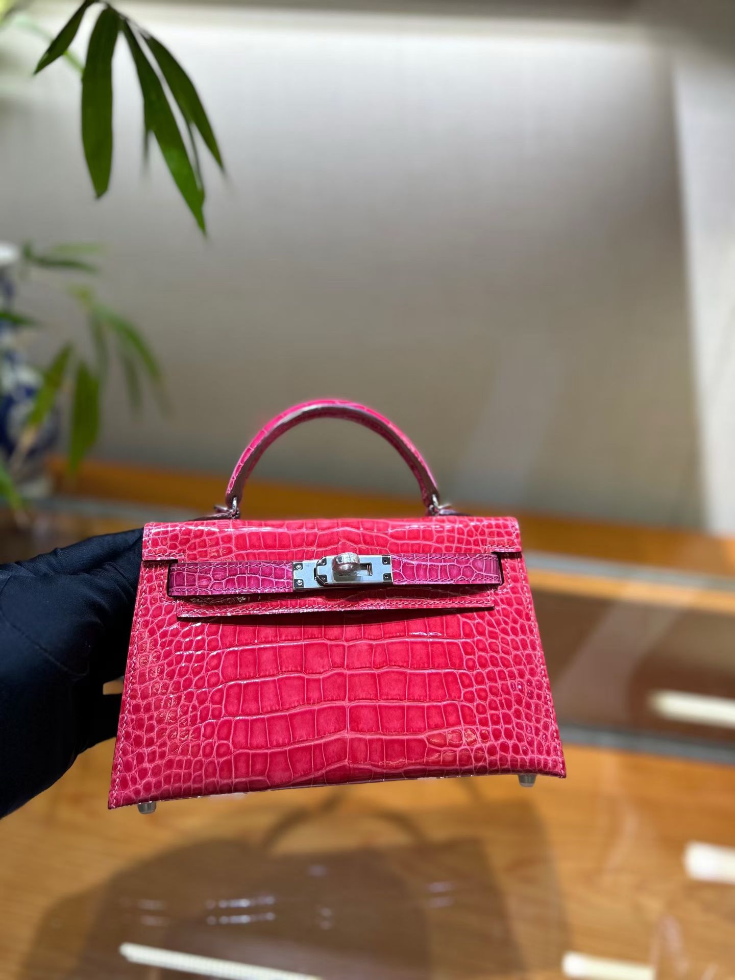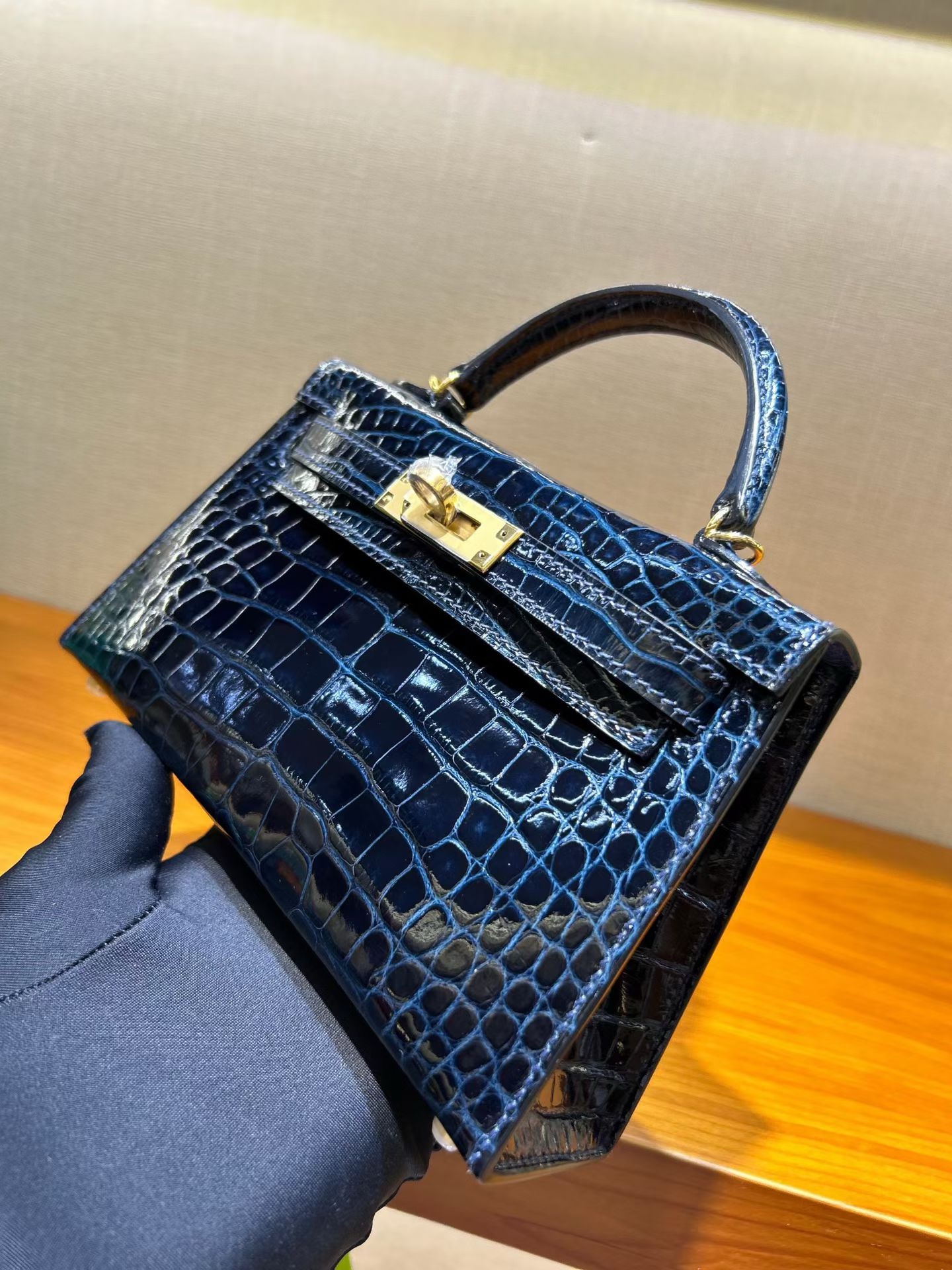Материал и отделка: Сумка выполнена из материала с выраженной глянцевой текстурой, из кожи аллигатора.  Дизайн: Это миниатюрная сумка-тоут (или клатч с ручкой) с жестким каркасом и клапаном.  Фурнитура: Металлическая застежка и детали выполнены в золотистом цвете.  Ручка: Сумка оснащена одной короткой верхней ручкой для ношения в руке или на предплечье.  Форма: Изделие имеет четкую, структурированную форму