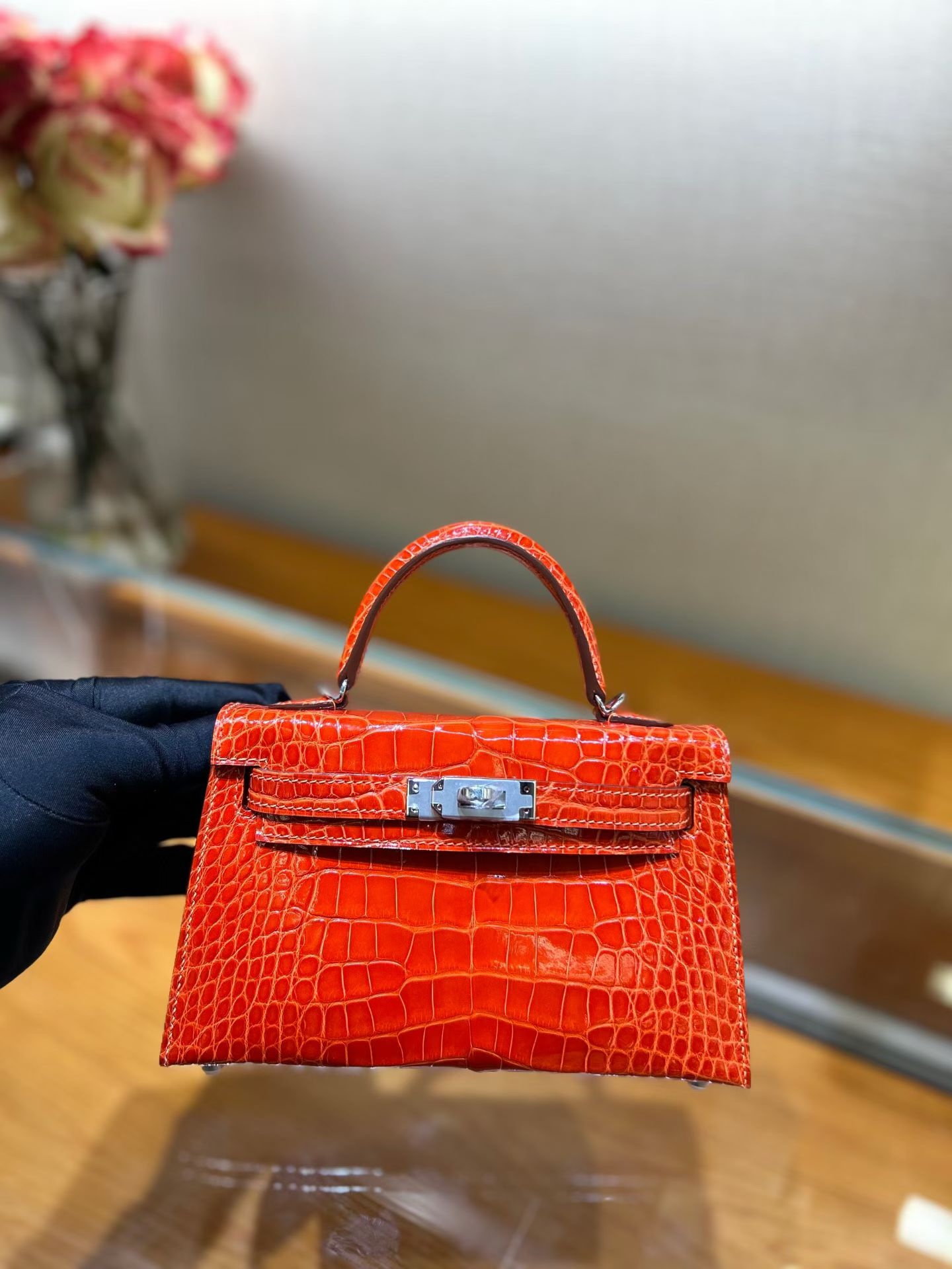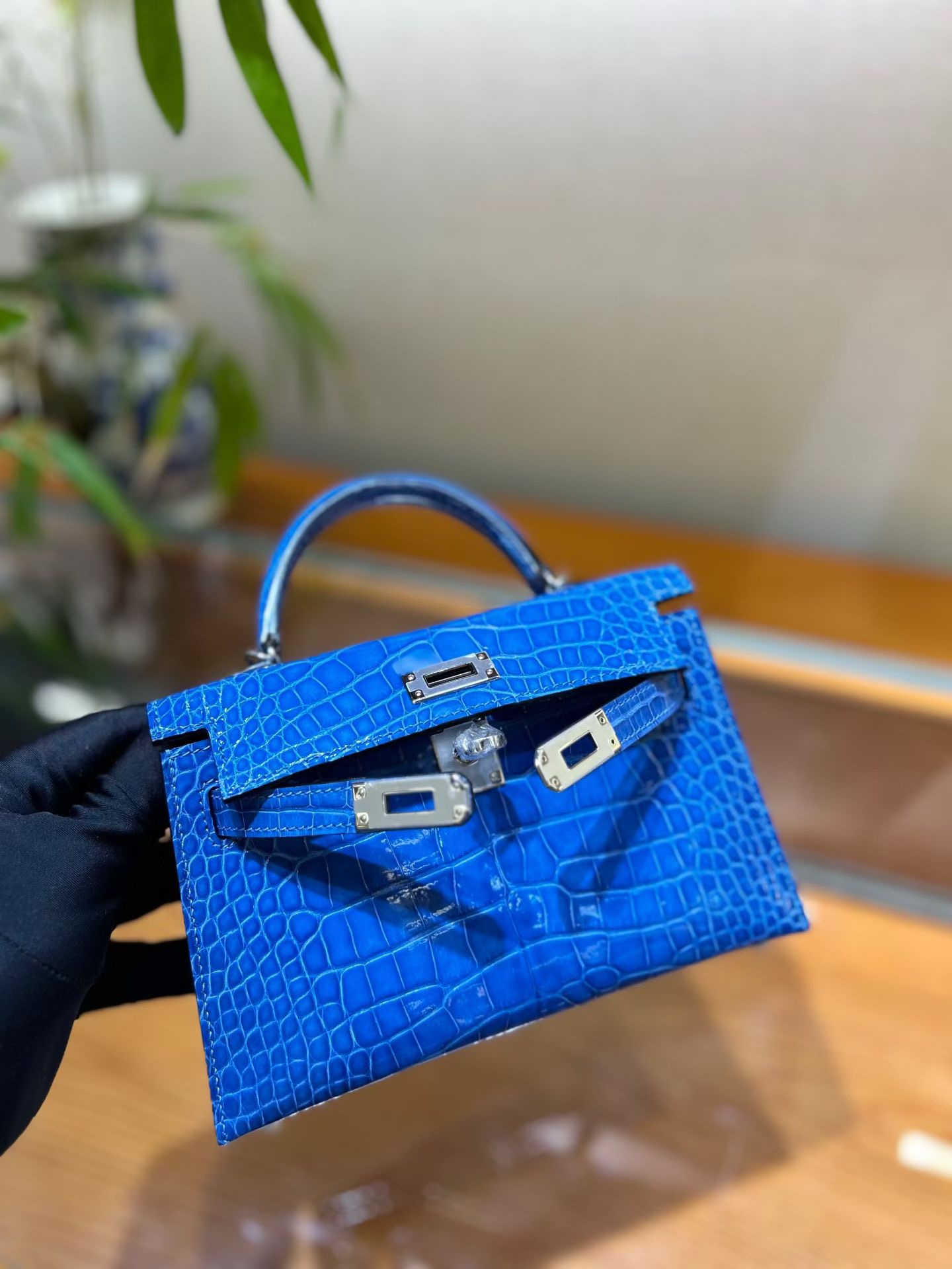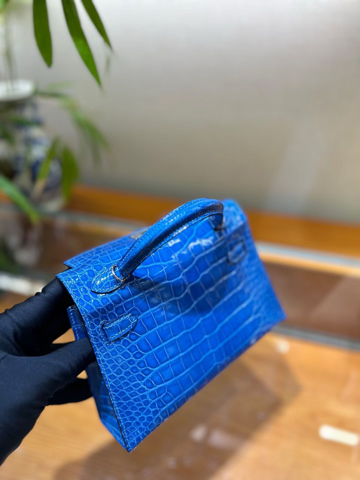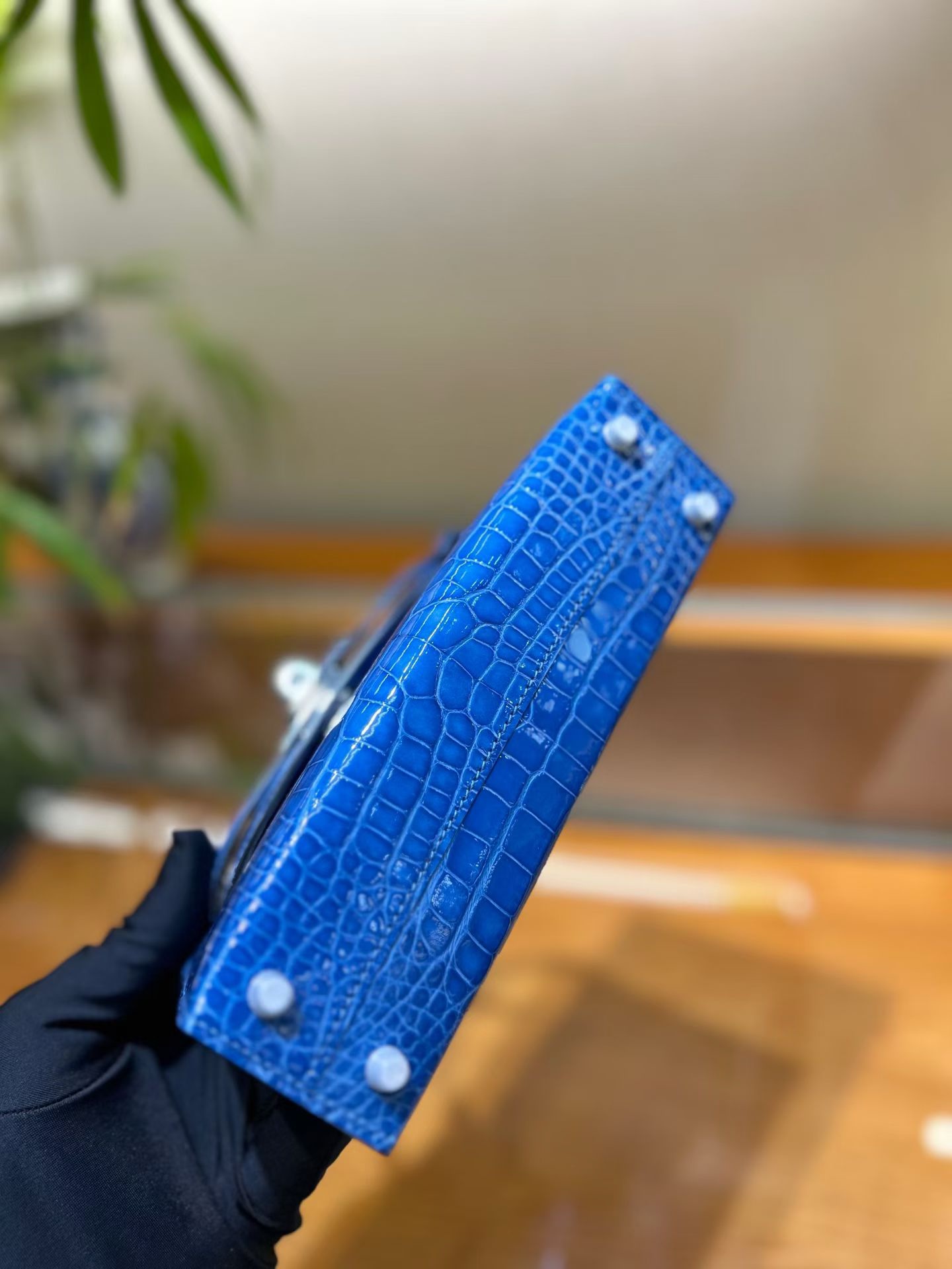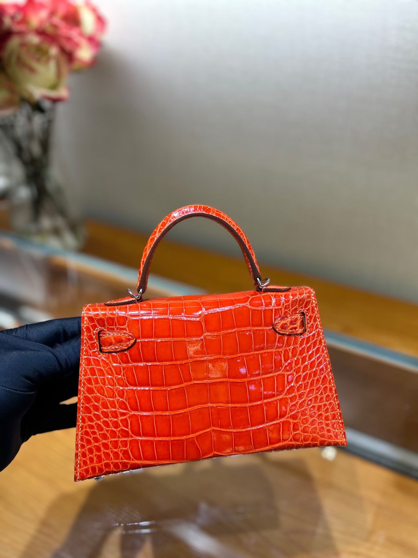 Материал и отделка: Сумка выполнена из материала с выраженной глянцевой текстурой, из кожи аллигатора.  Дизайн: Это миниатюрная сумка-тоут (или клатч с ручкой) с жестким каркасом и клапаном.  Фурнитура: Металлическая застежка и детали выполнены в золотистом цвете.  Ручка: Сумка оснащена одной короткой верхней ручкой для ношения в руке или на предплечье.  Форма: Изделие имеет четкую, структурированную форму