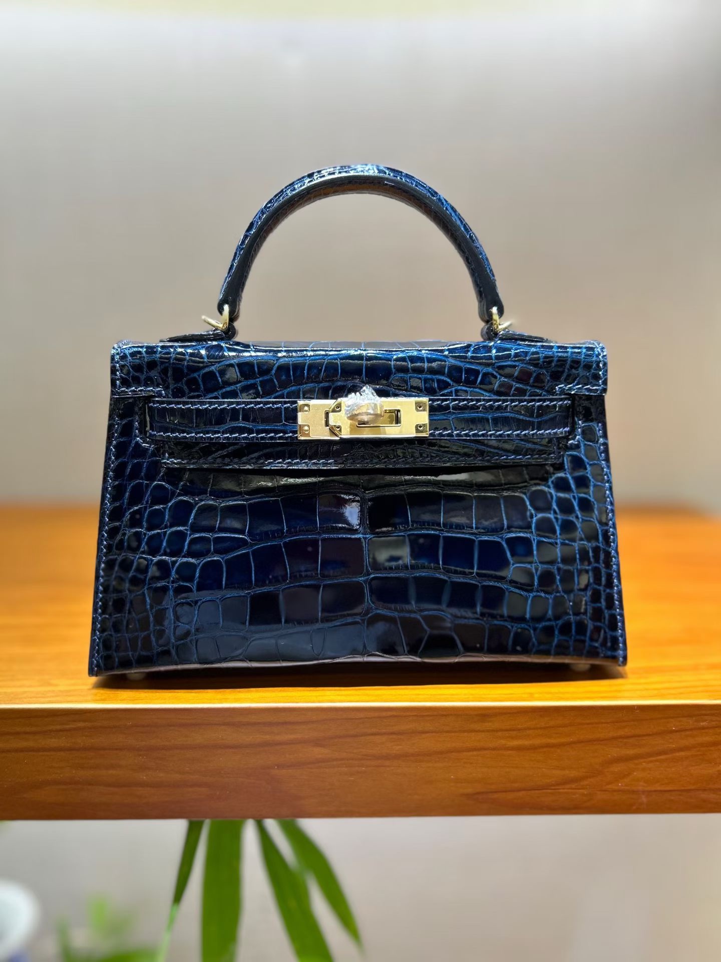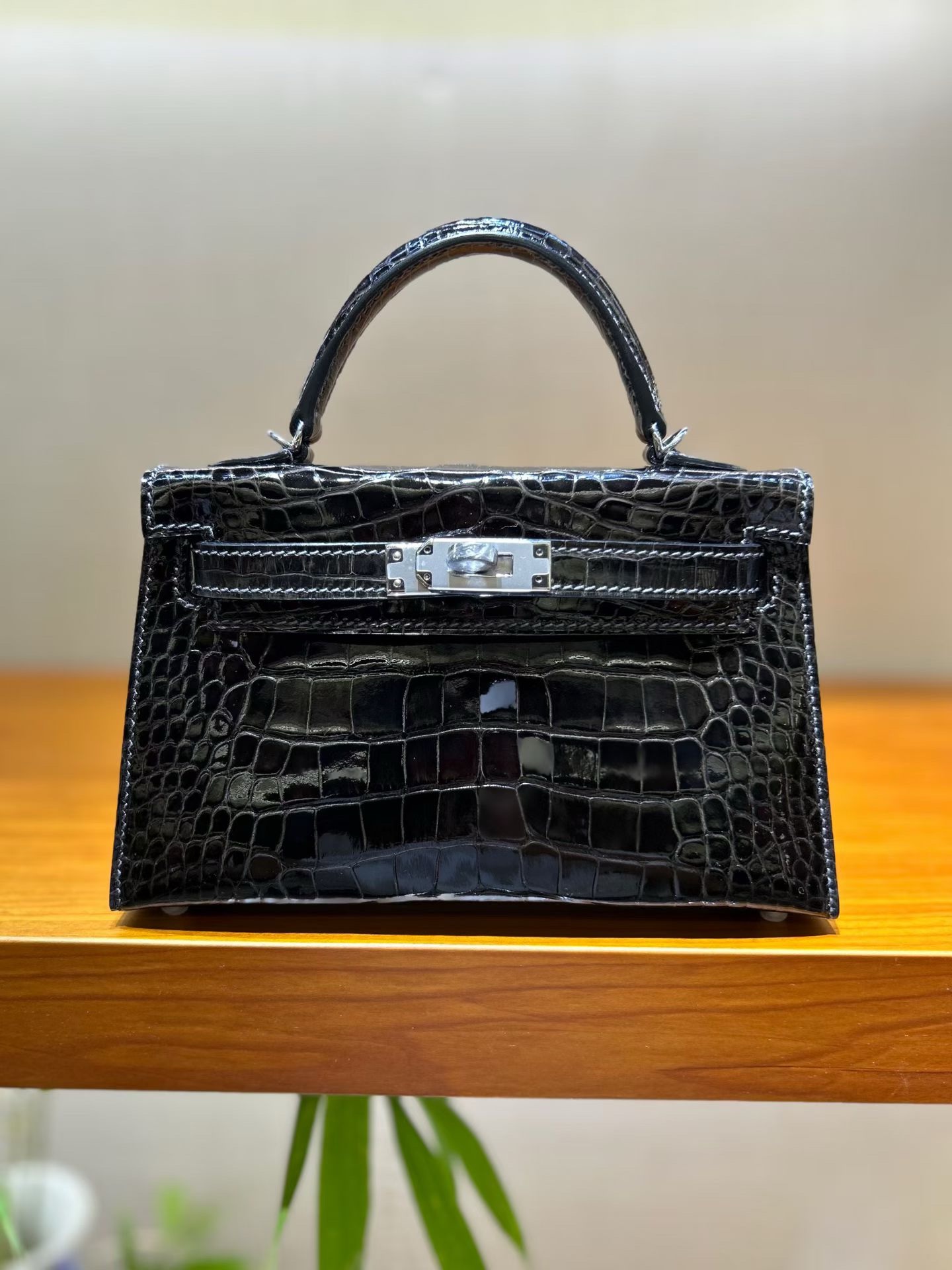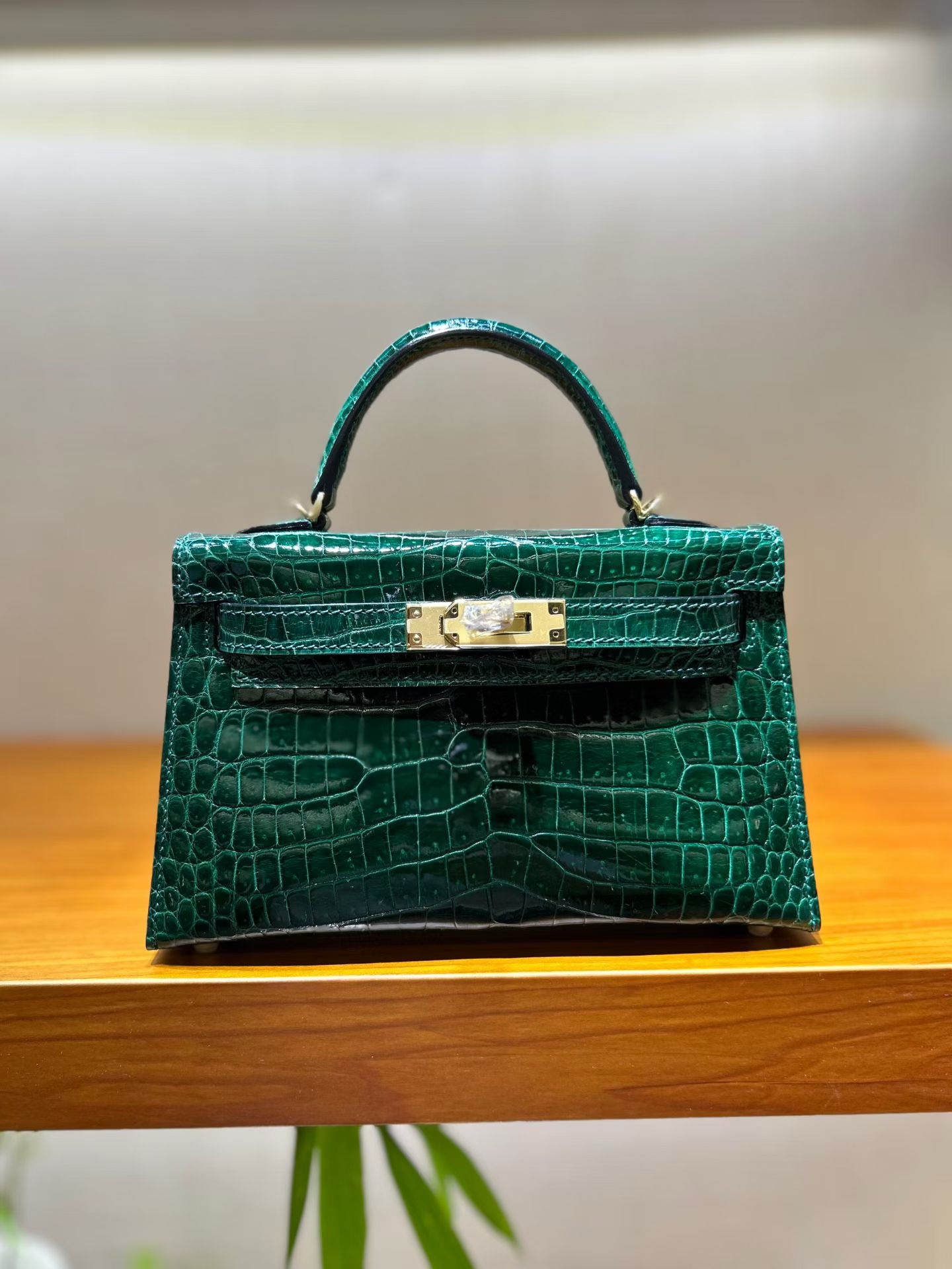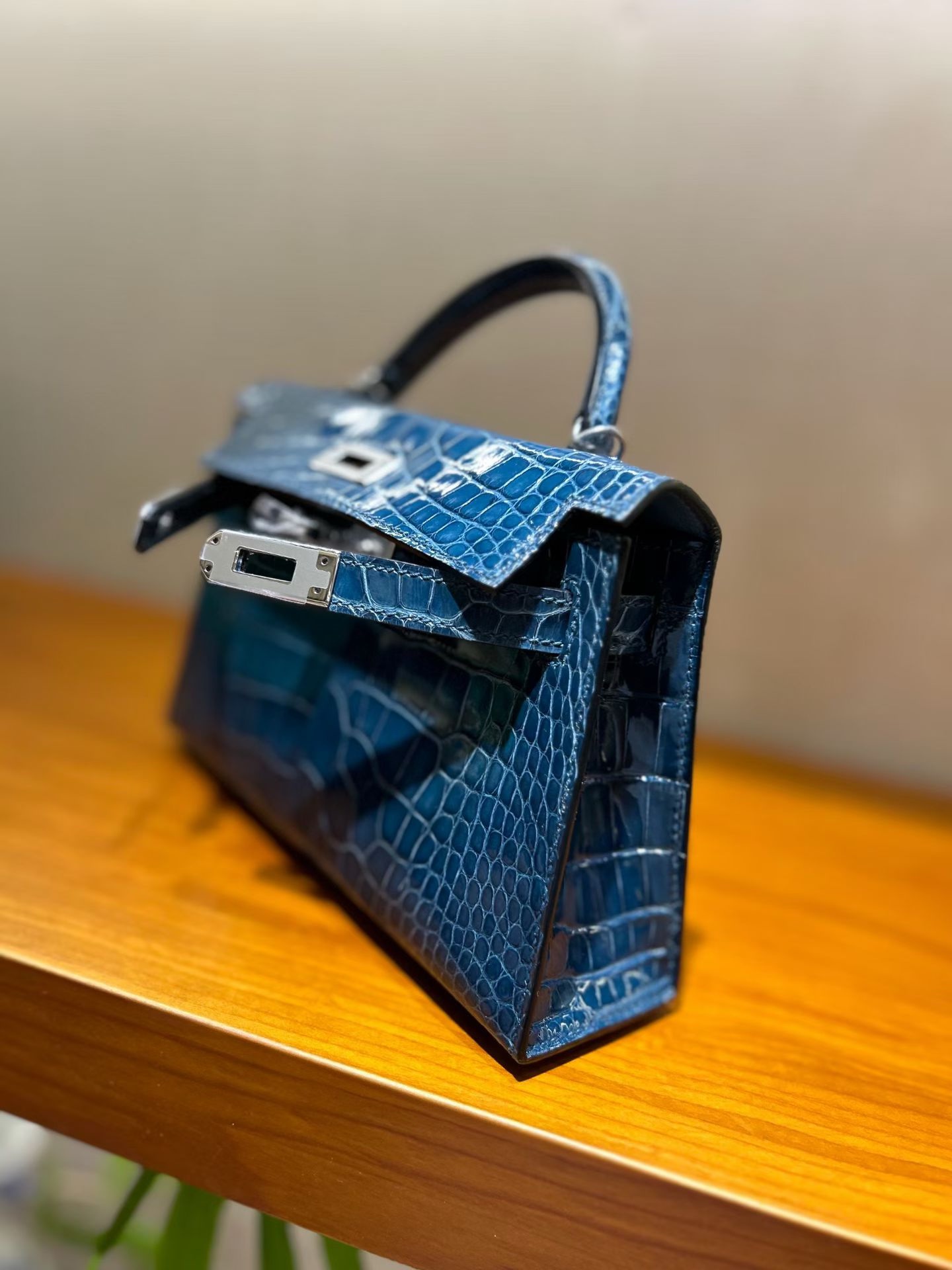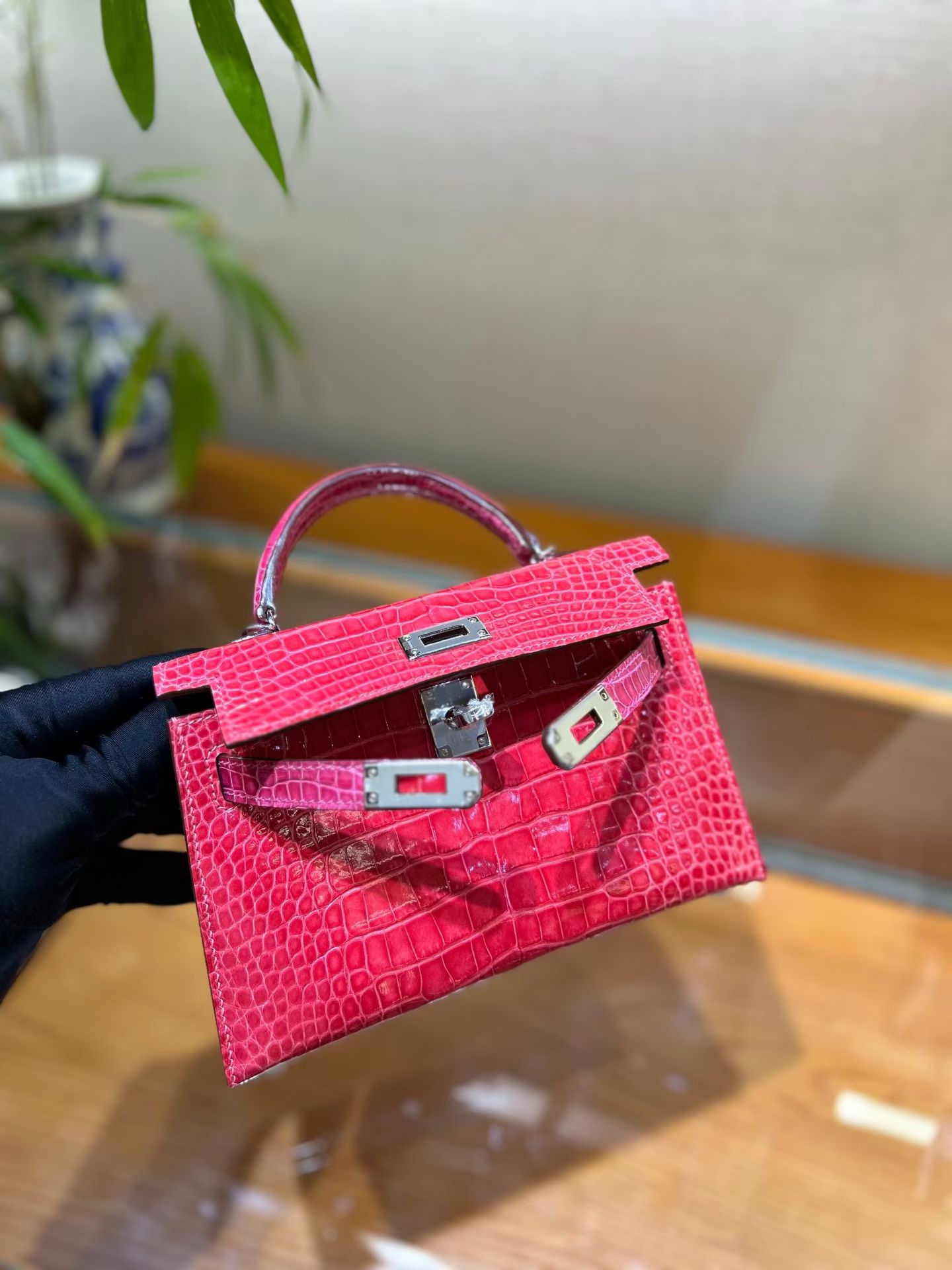 Материал и отделка: Сумка выполнена из материала с выраженной глянцевой текстурой, из кожи аллигатора.  Дизайн: Это миниатюрная сумка-тоут (или клатч с ручкой) с жестким каркасом и клапаном.  Фурнитура: Металлическая застежка и детали выполнены в золотистом цвете.  Ручка: Сумка оснащена одной короткой верхней ручкой для ношения в руке или на предплечье.  Форма: Изделие имеет четкую, структурированную форму