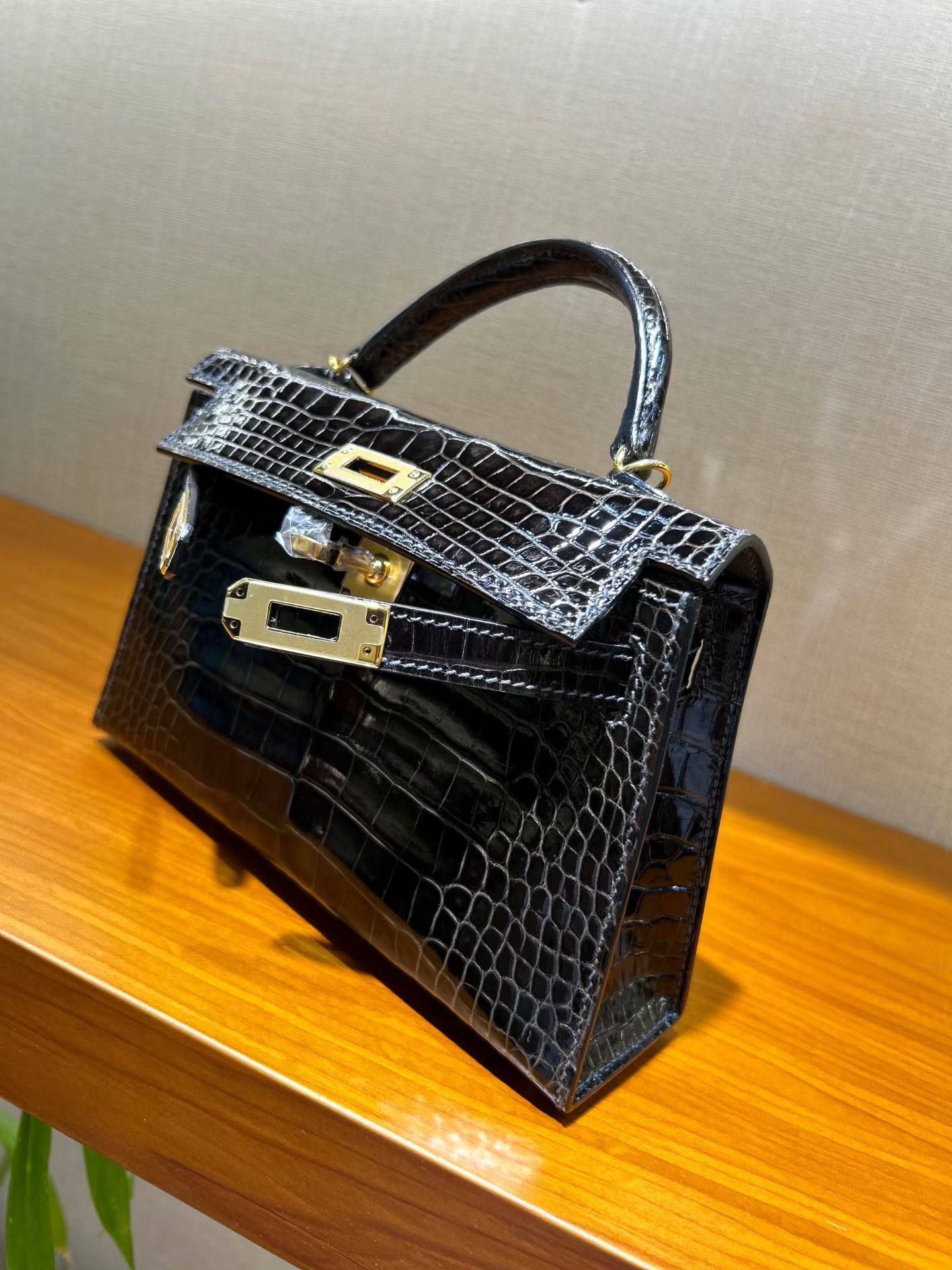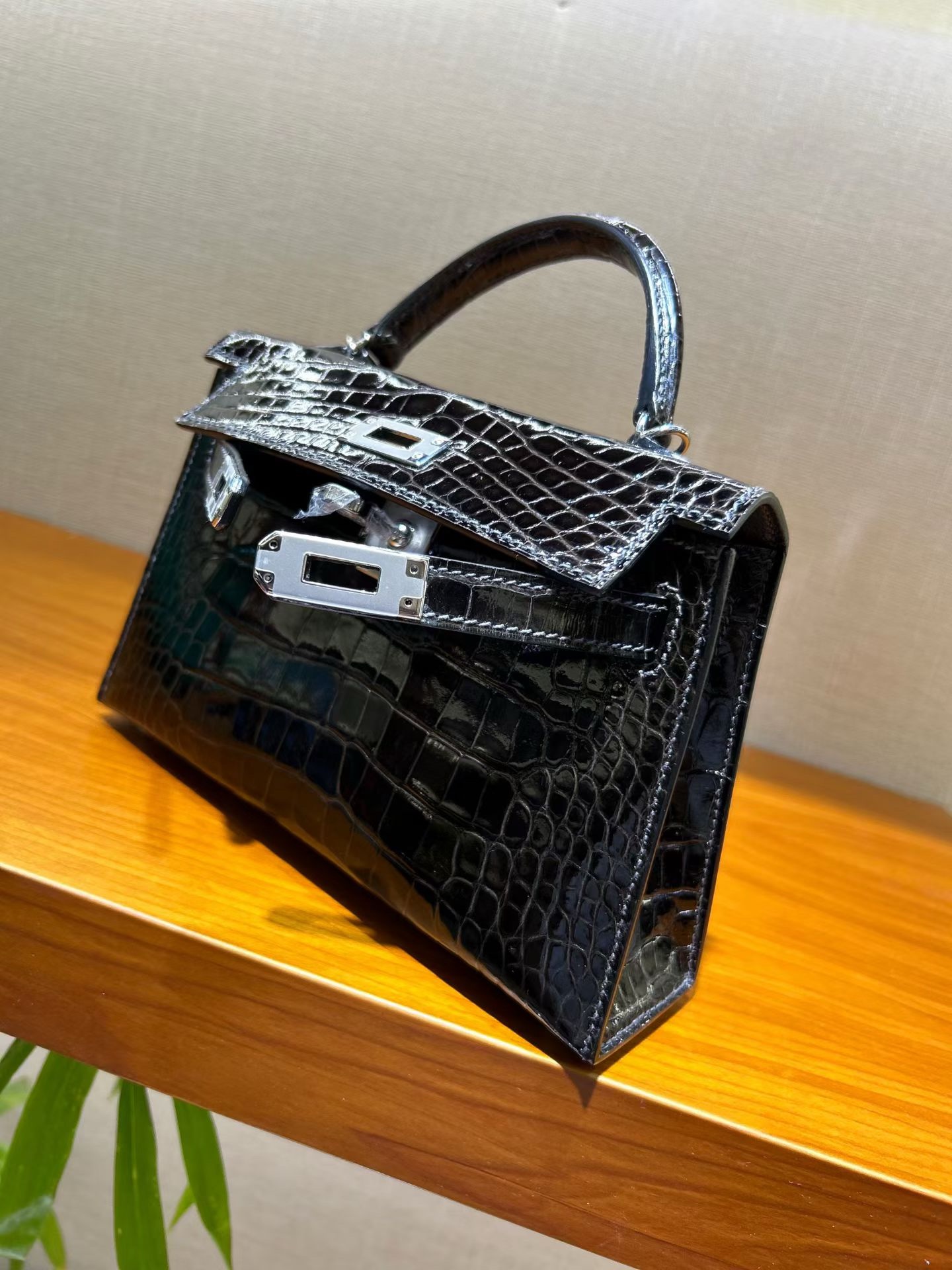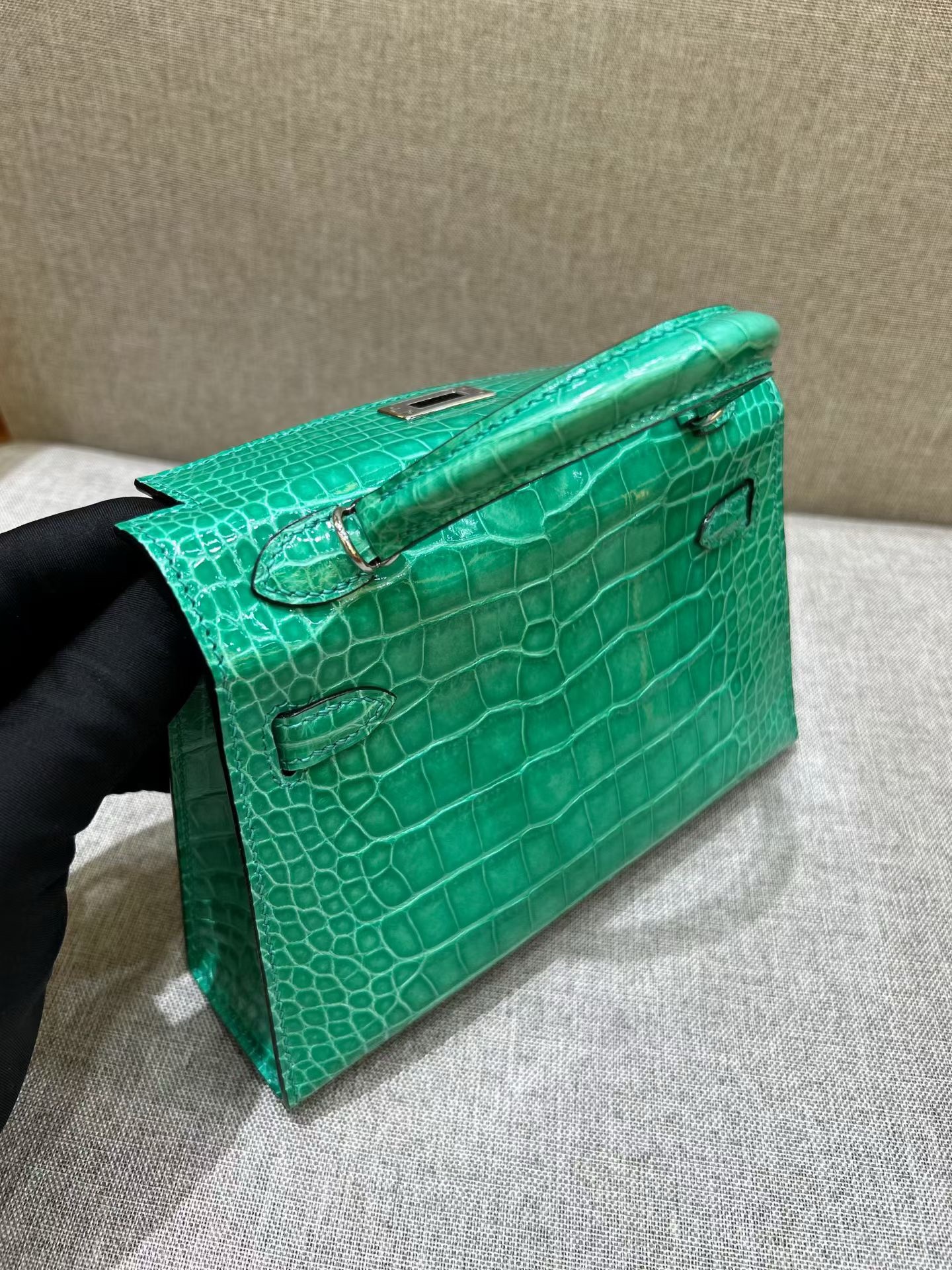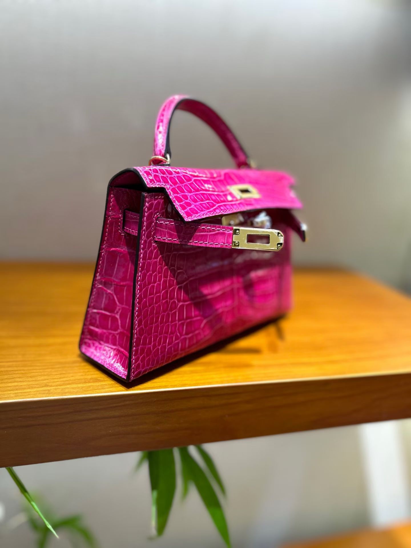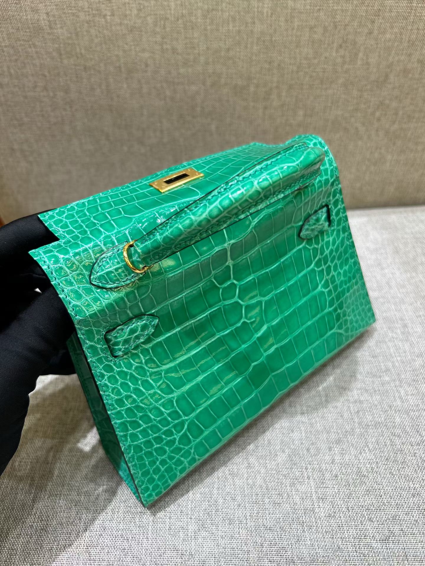Материал и отделка: Сумка выполнена из материала с выраженной глянцевой текстурой, из кожи аллигатора.  Дизайн: Это миниатюрная сумка-тоут (или клатч с ручкой) с жестким каркасом и клапаном.  Фурнитура: Металлическая застежка и детали выполнены в золотистом цвете.  Ручка: Сумка оснащена одной короткой верхней ручкой для ношения в руке или на предплечье.  Форма: Изделие имеет четкую, структурированную форму