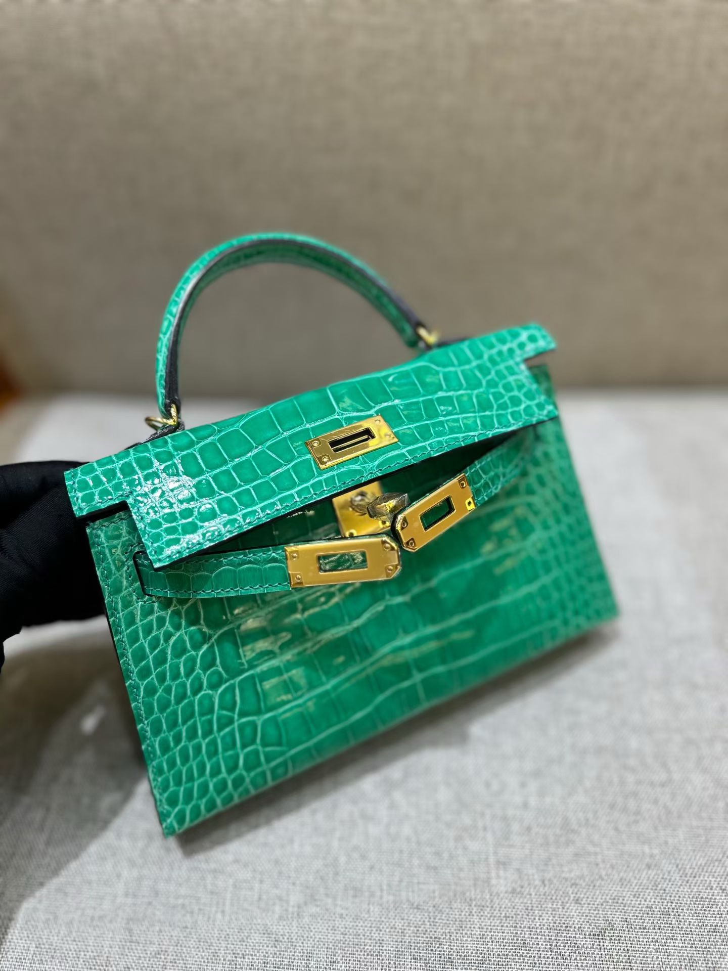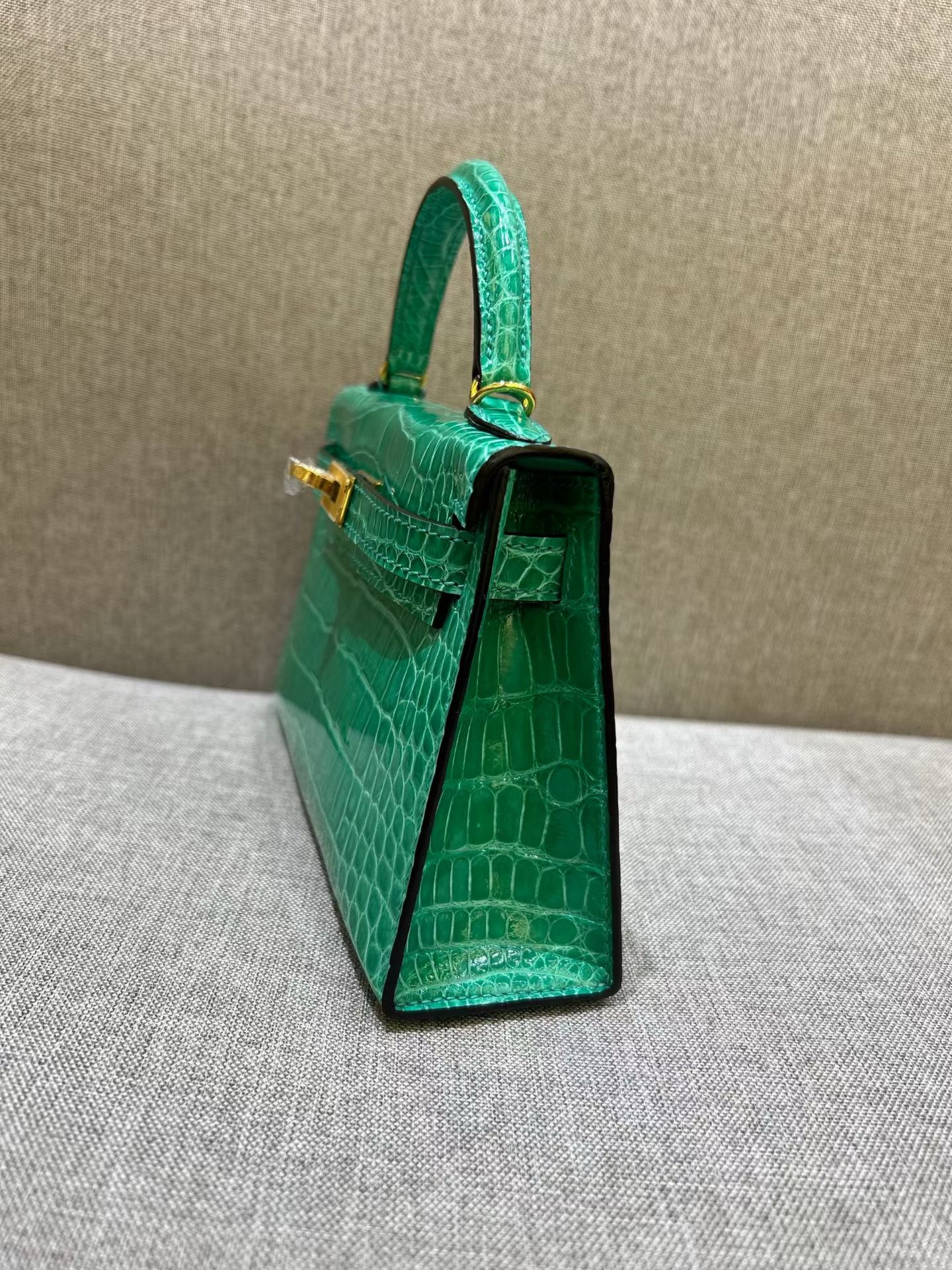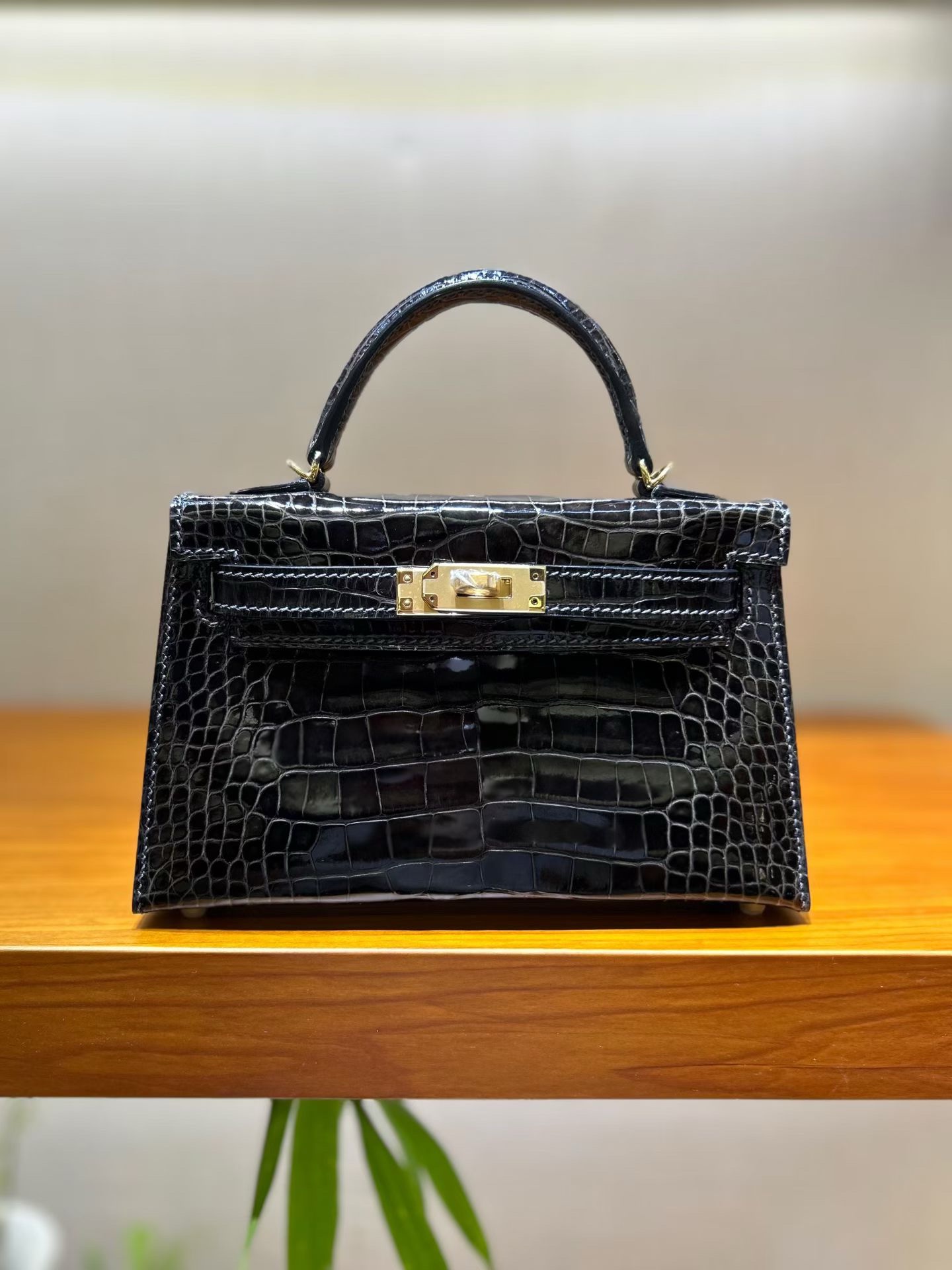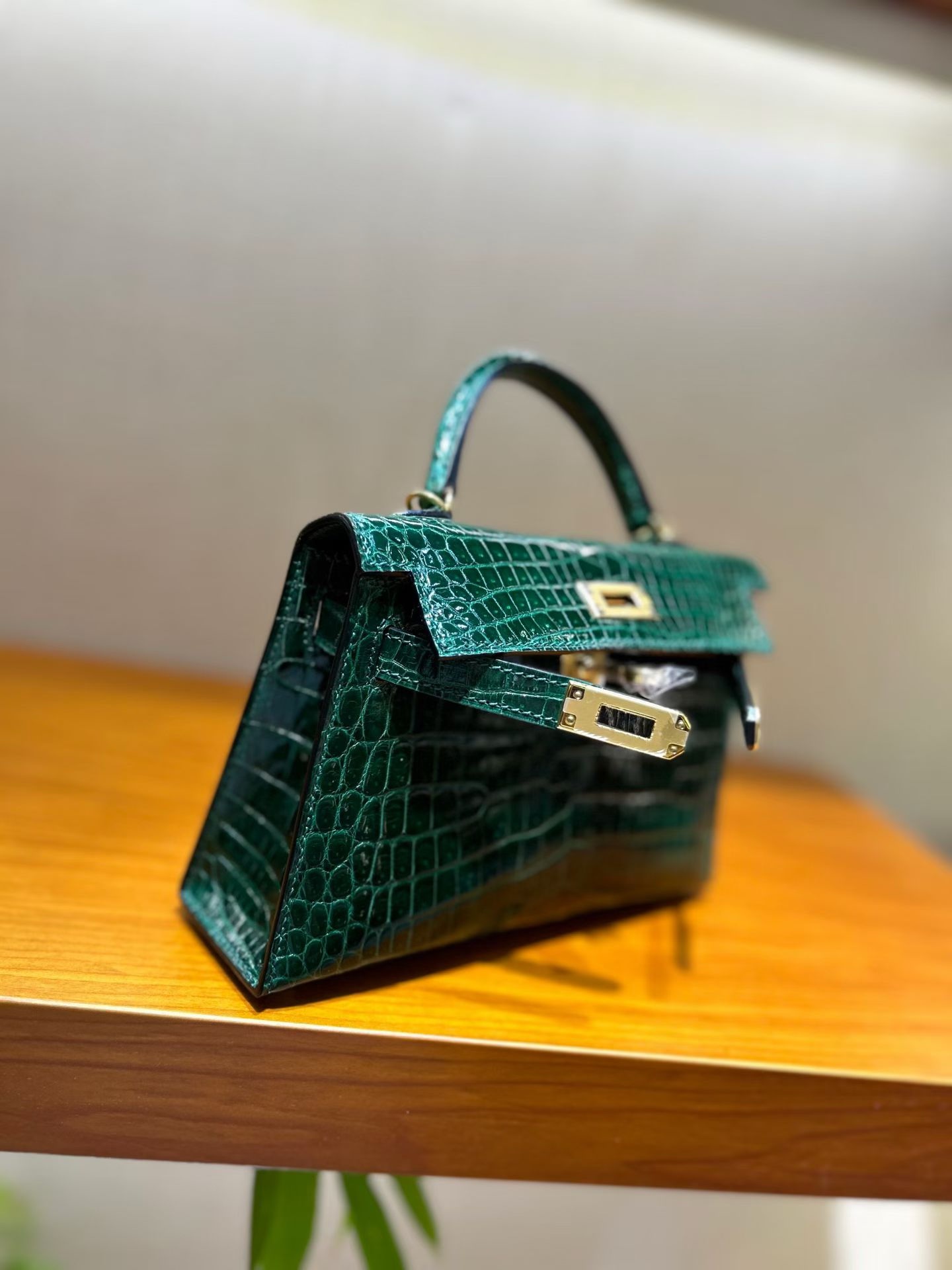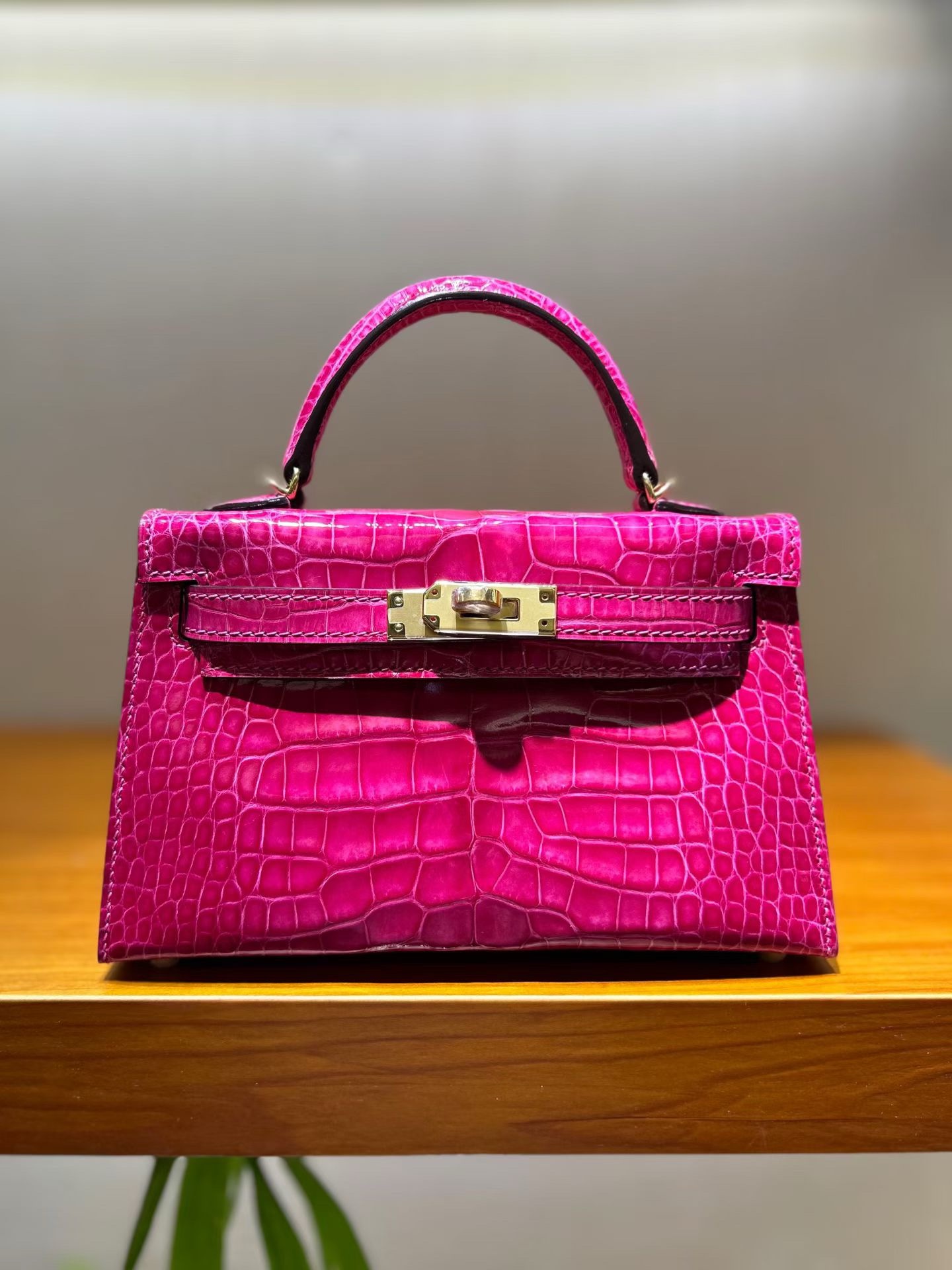 Материал и отделка: Сумка выполнена из материала с выраженной глянцевой текстурой, из кожи аллигатора.  Дизайн: Это миниатюрная сумка-тоут (или клатч с ручкой) с жестким каркасом и клапаном.  Фурнитура: Металлическая застежка и детали выполнены в золотистом цвете.  Ручка: Сумка оснащена одной короткой верхней ручкой для ношения в руке или на предплечье.  Форма: Изделие имеет четкую, структурированную форму