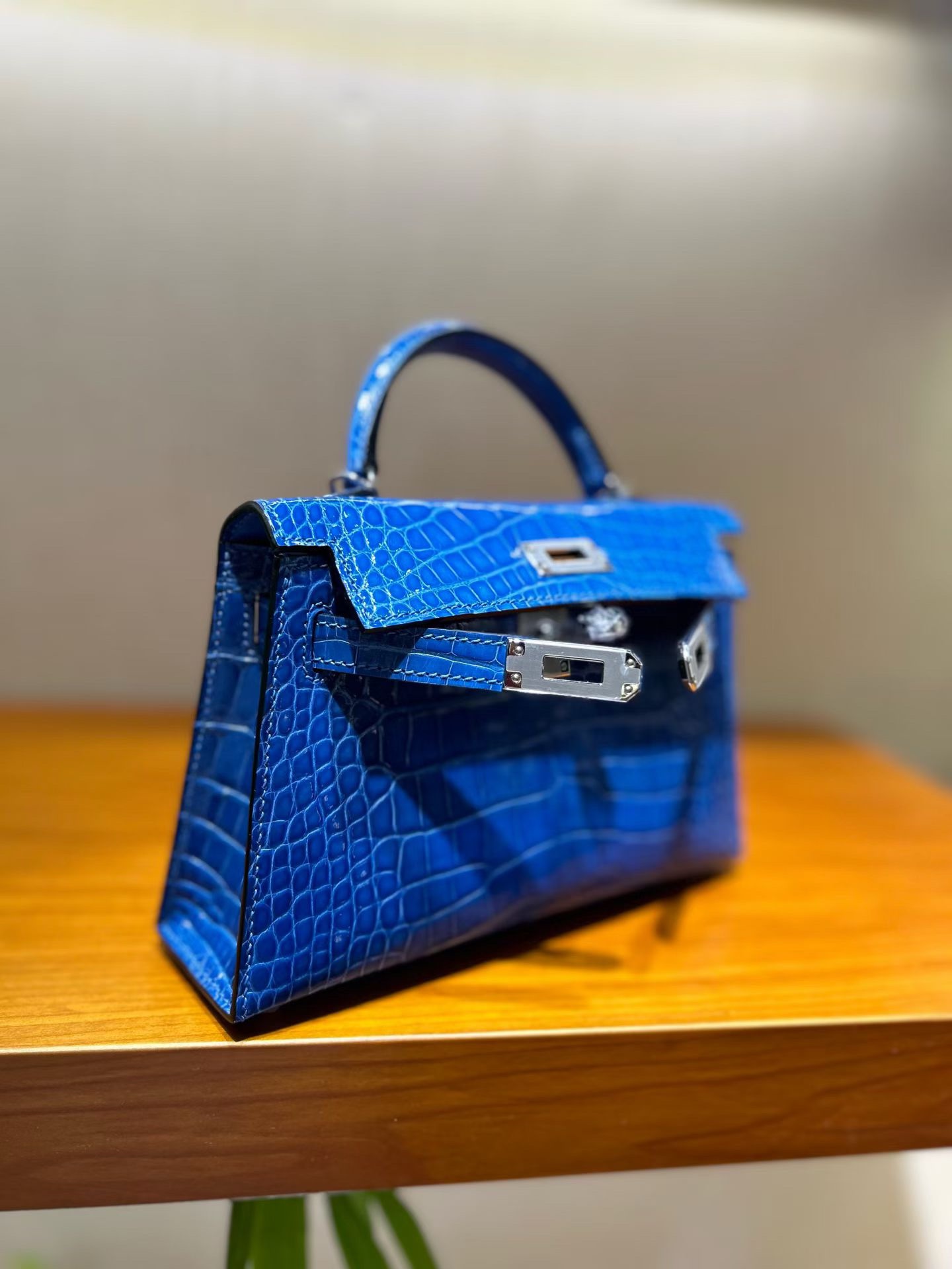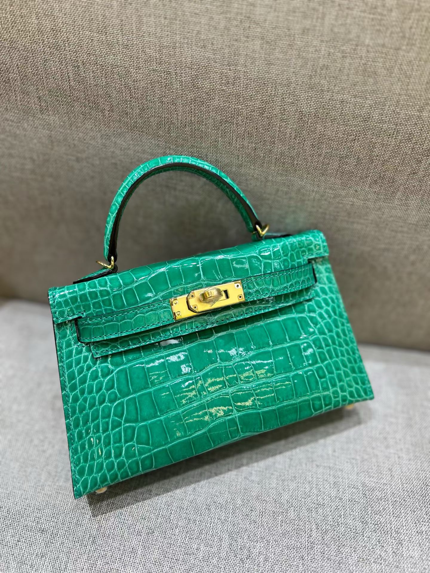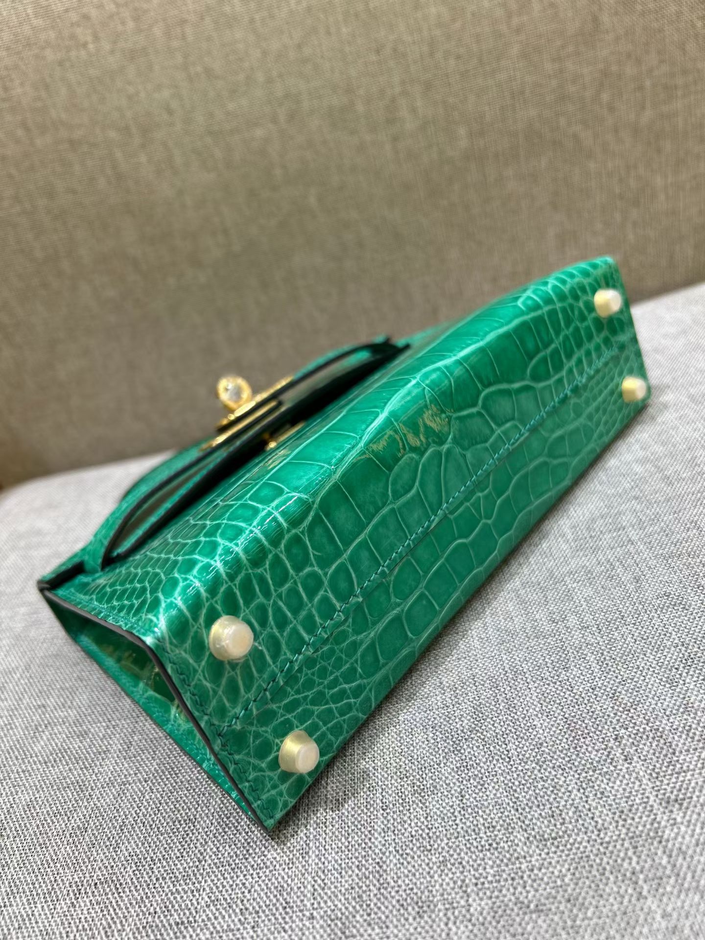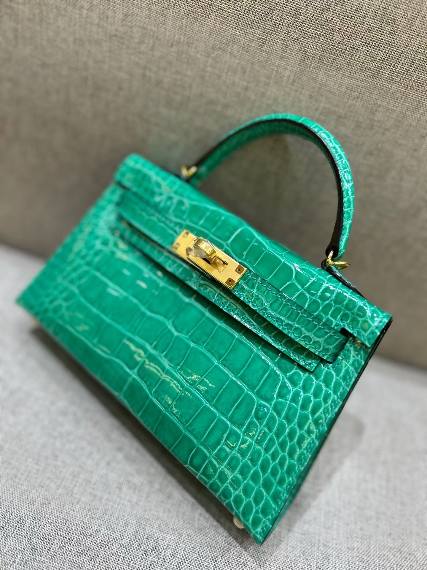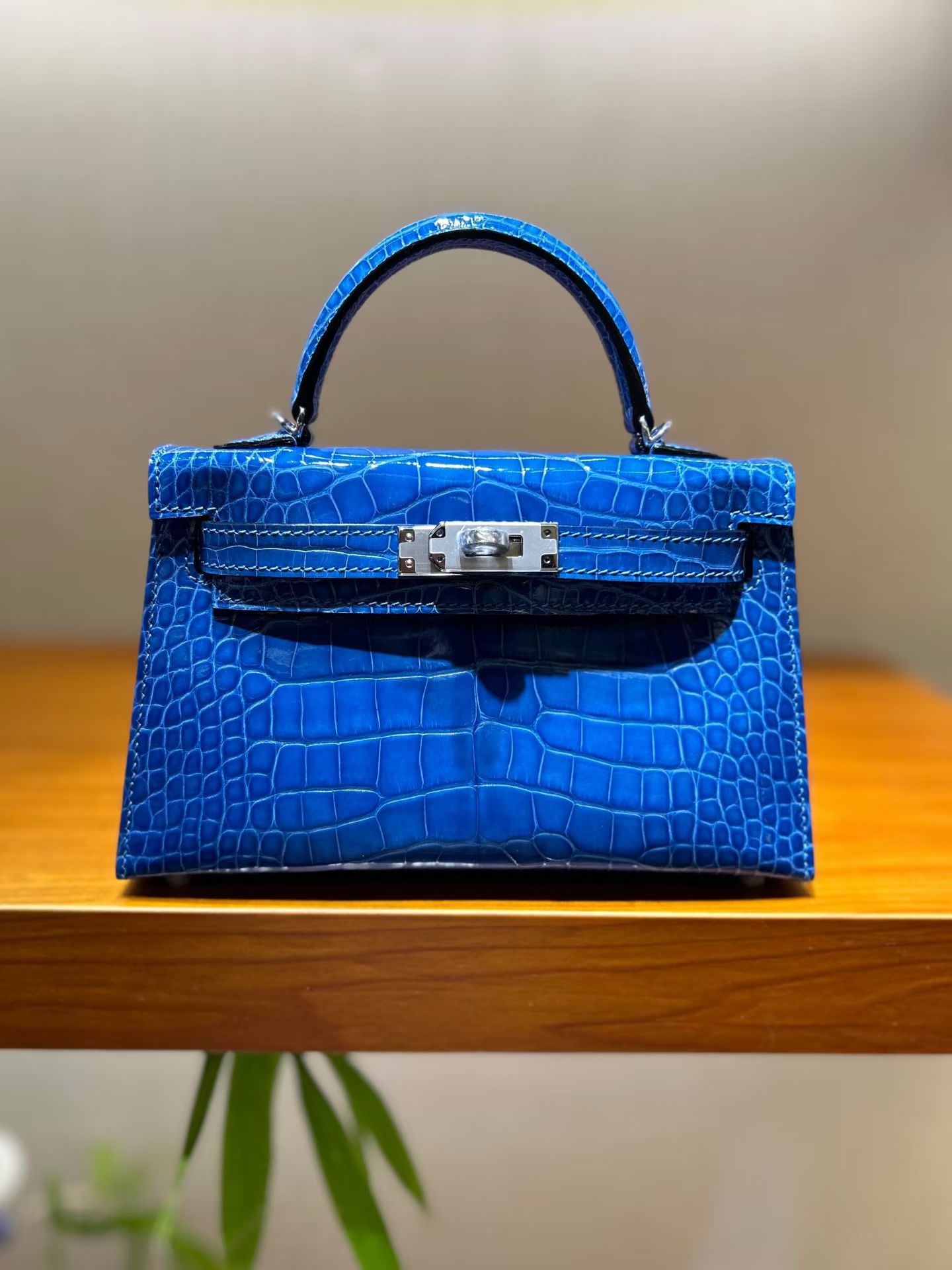 Материал и отделка: Сумка выполнена из материала с выраженной глянцевой текстурой, из кожи аллигатора.  Дизайн: Это миниатюрная сумка-тоут (или клатч с ручкой) с жестким каркасом и клапаном.  Фурнитура: Металлическая застежка и детали выполнены в золотистом цвете.  Ручка: Сумка оснащена одной короткой верхней ручкой для ношения в руке или на предплечье.  Форма: Изделие имеет четкую, структурированную форму