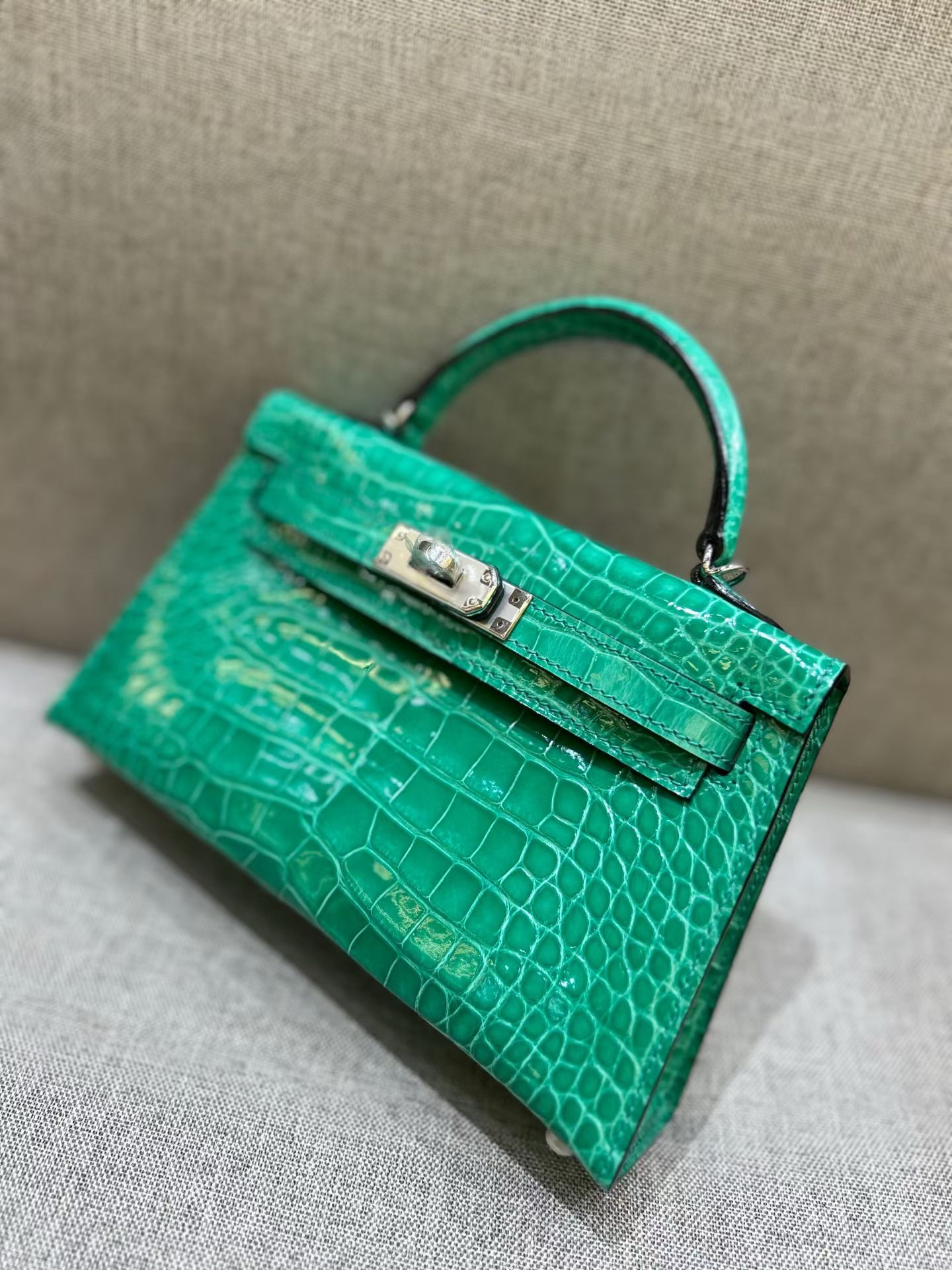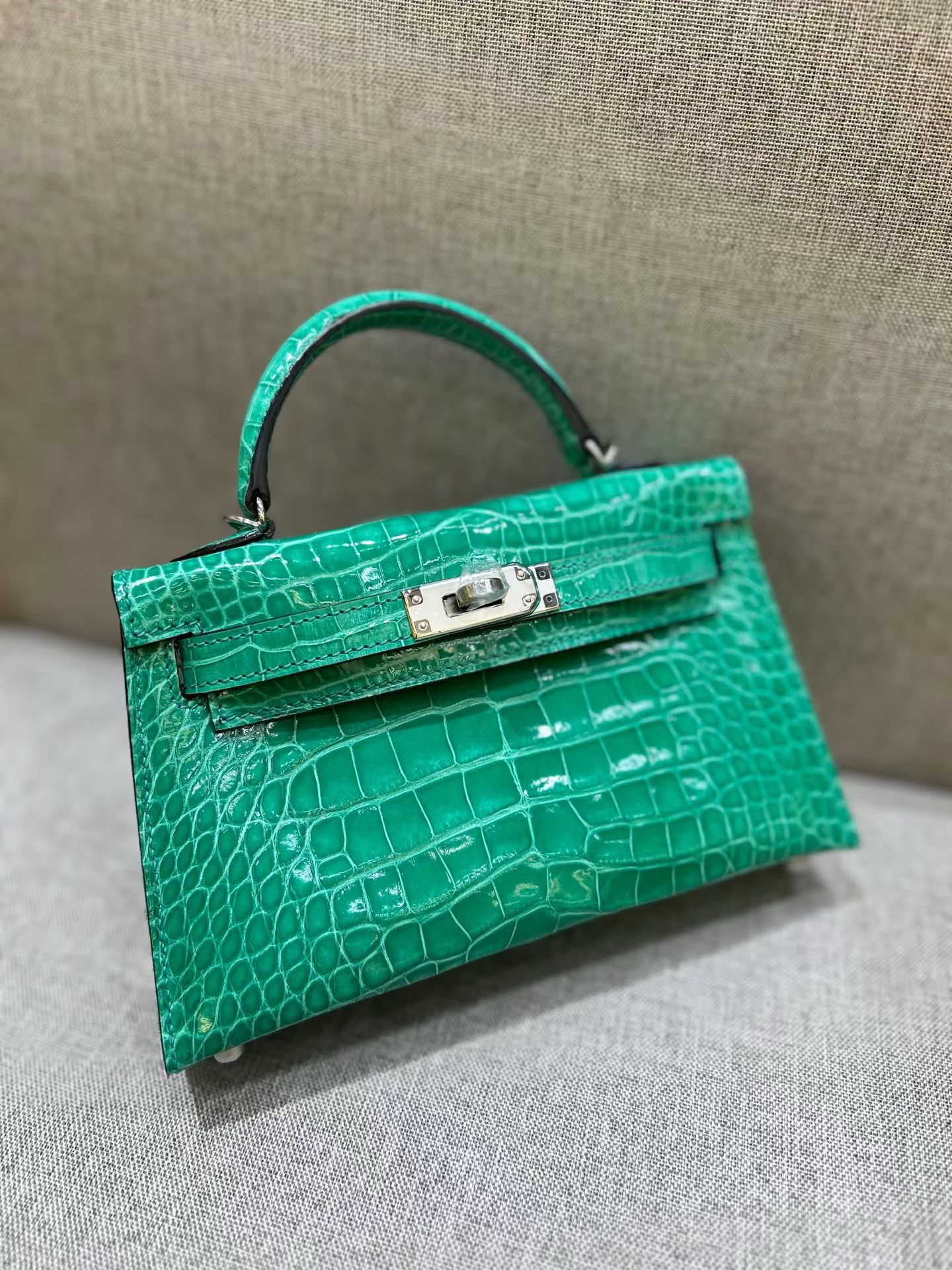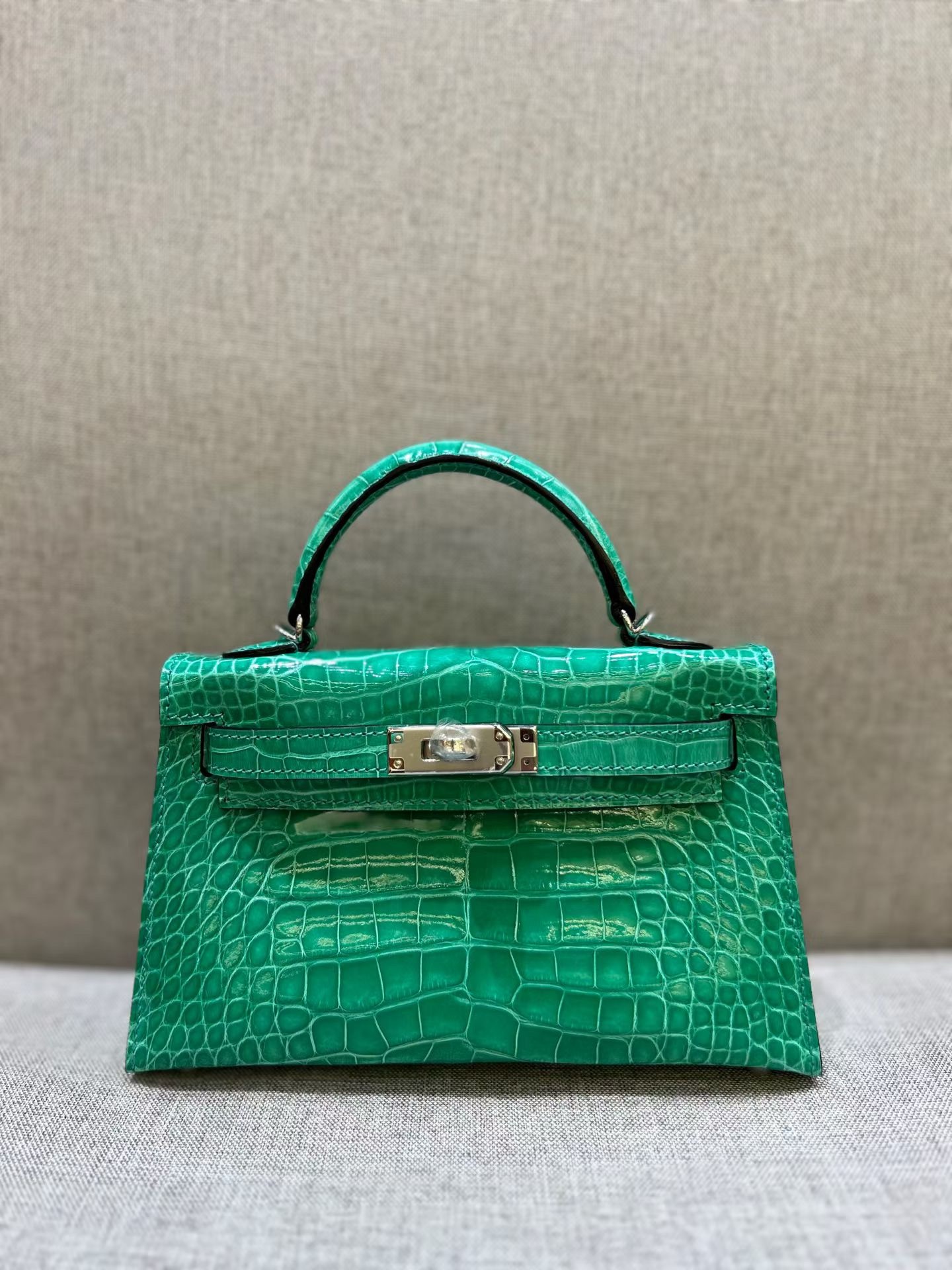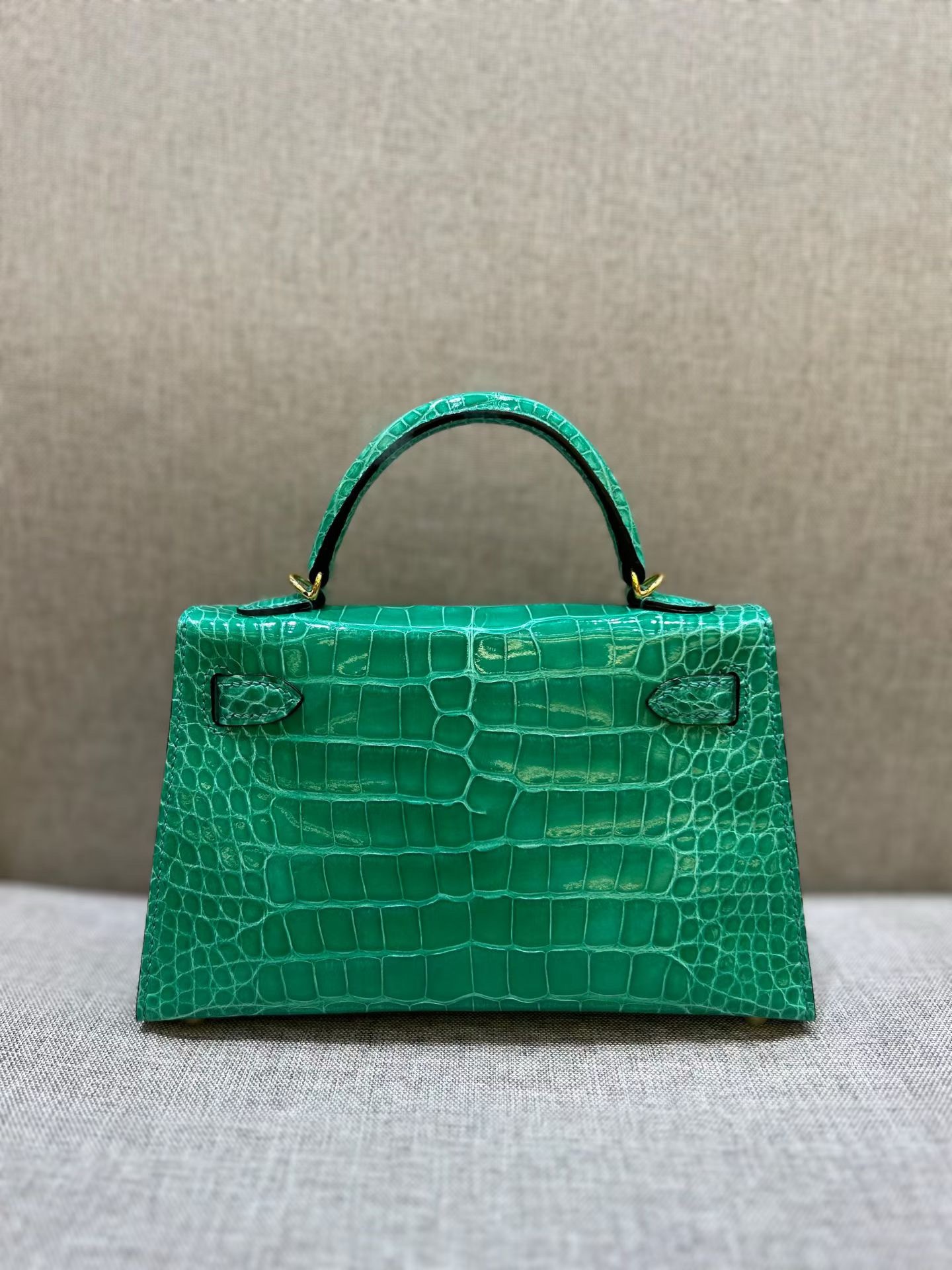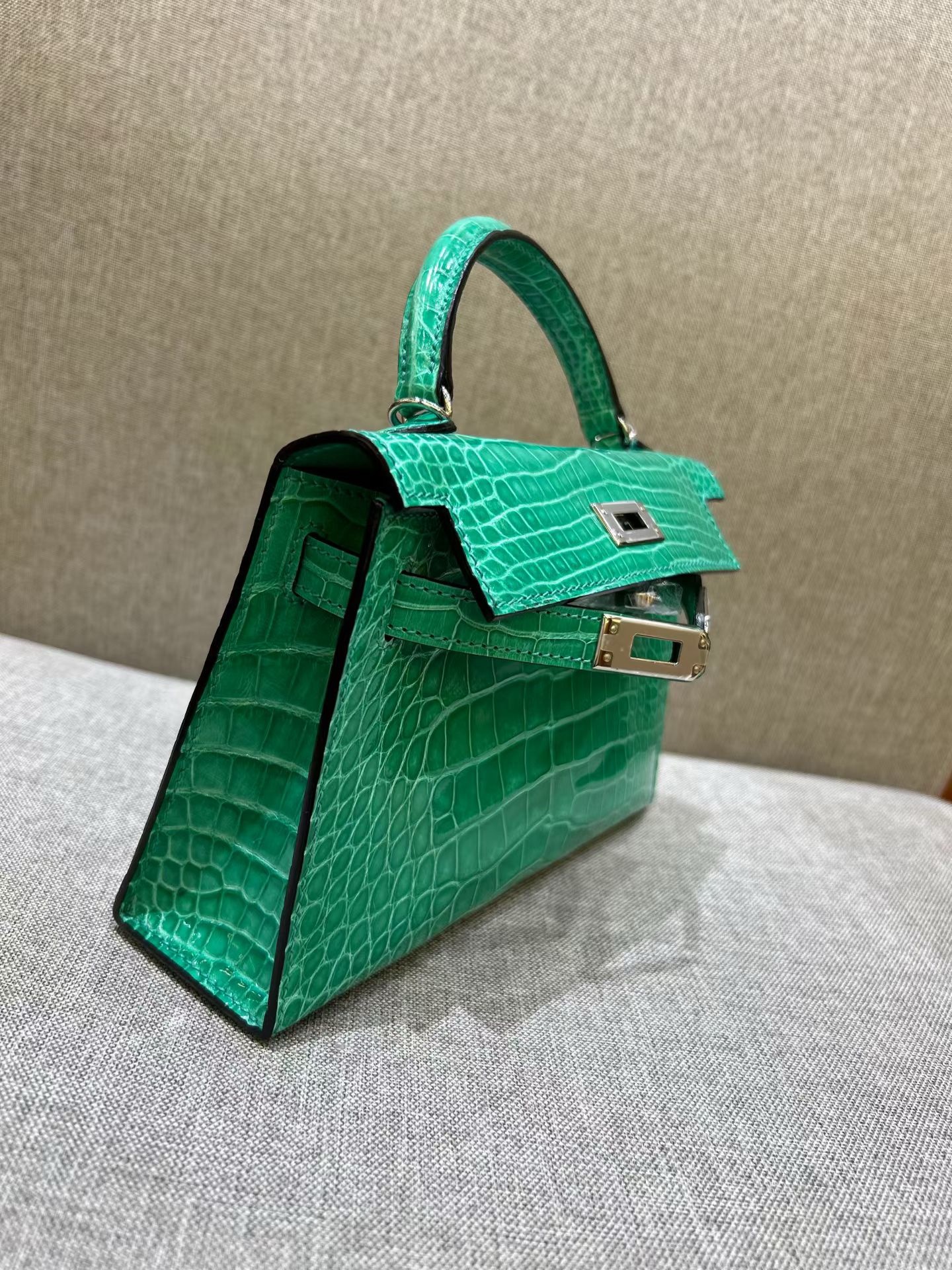 Материал и отделка: Сумка выполнена из материала с выраженной глянцевой текстурой, из кожи аллигатора.  Дизайн: Это миниатюрная сумка-тоут (или клатч с ручкой) с жестким каркасом и клапаном.  Фурнитура: Металлическая застежка и детали выполнены в золотистом цвете.  Ручка: Сумка оснащена одной короткой верхней ручкой для ношения в руке или на предплечье.  Форма: Изделие имеет четкую, структурированную форму