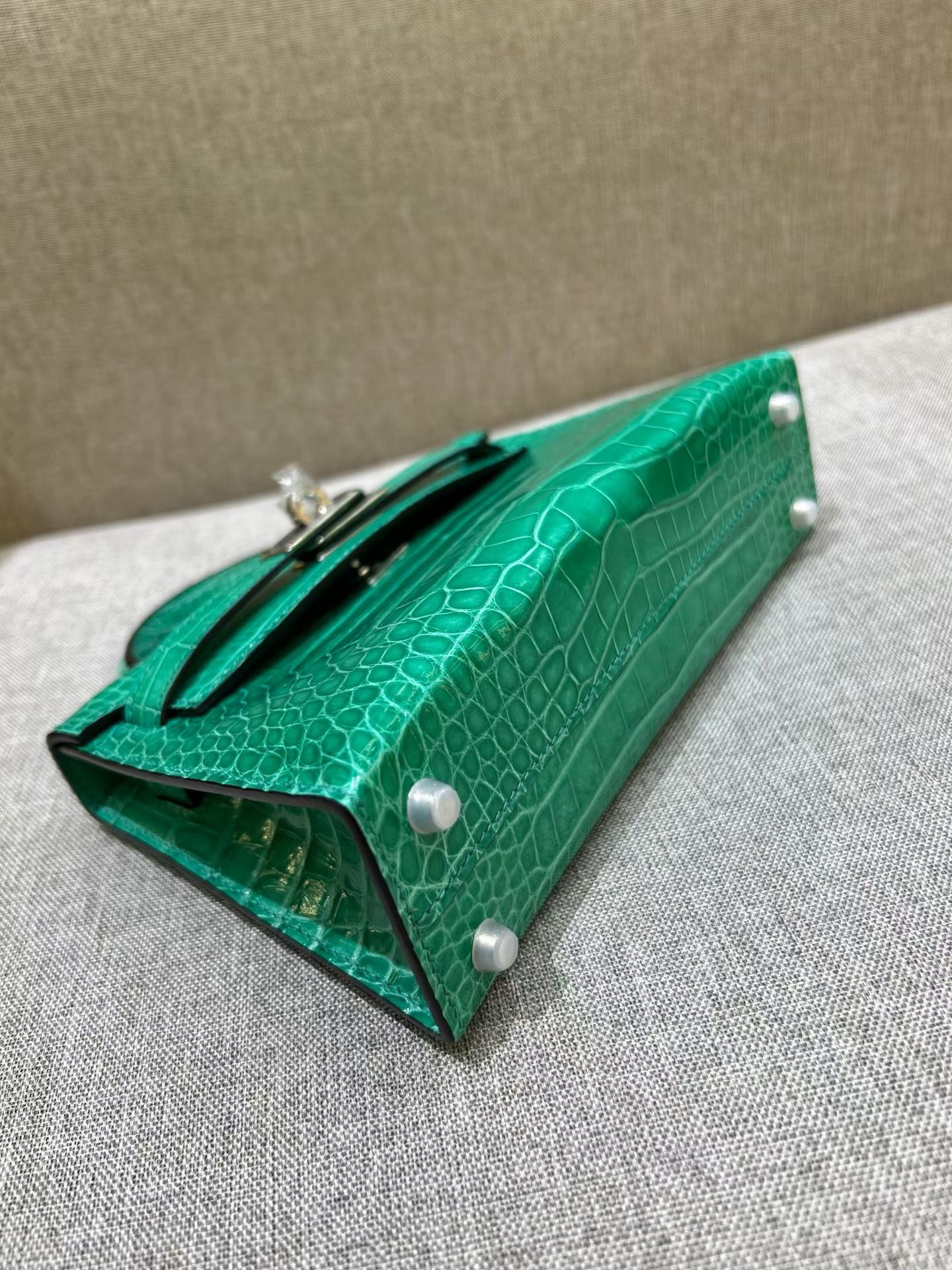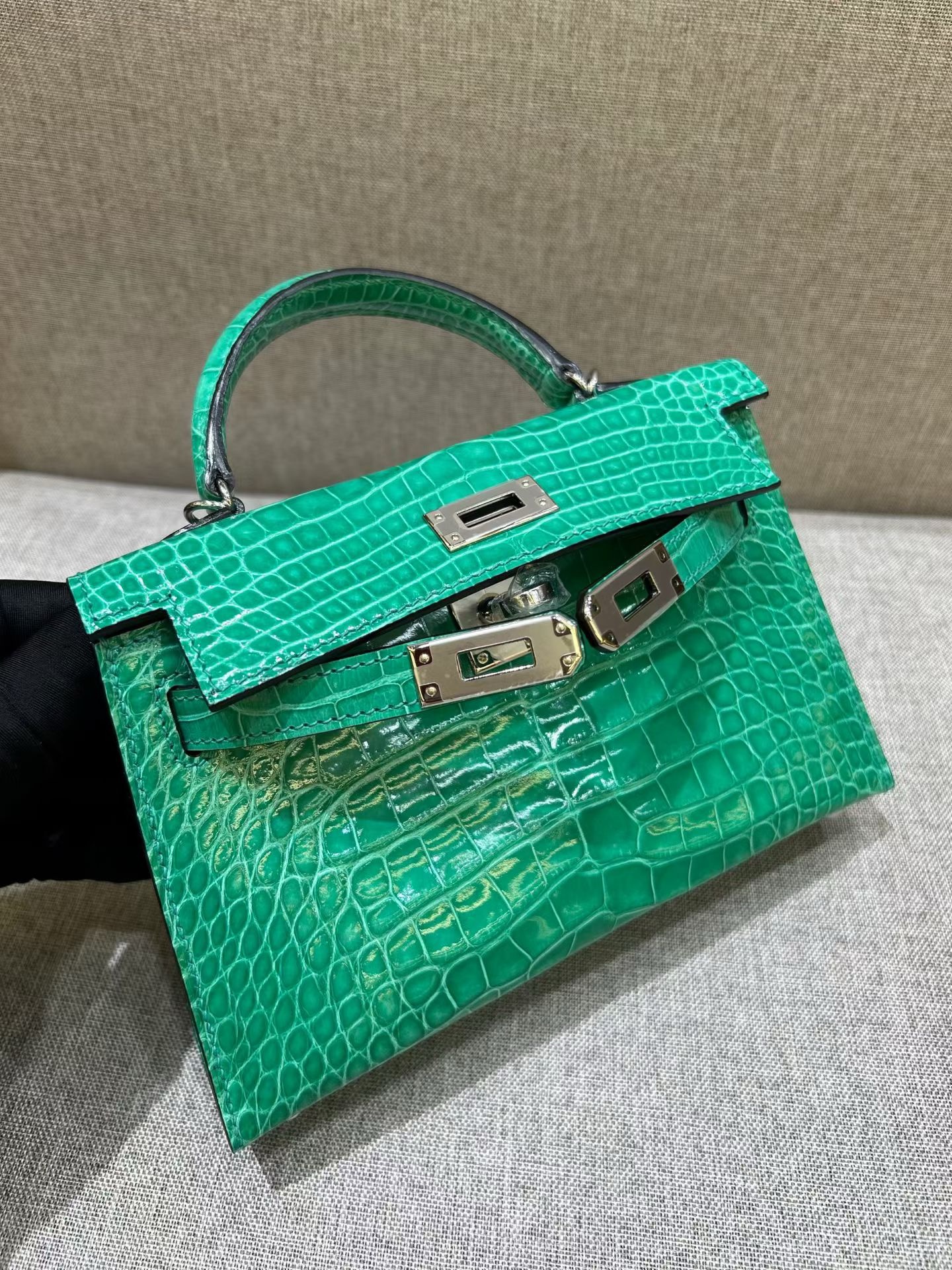 • Дизайн: Это миниатюрная сумка-тоут (или клатч с ручкой) с жестким каркасом и клапаном.