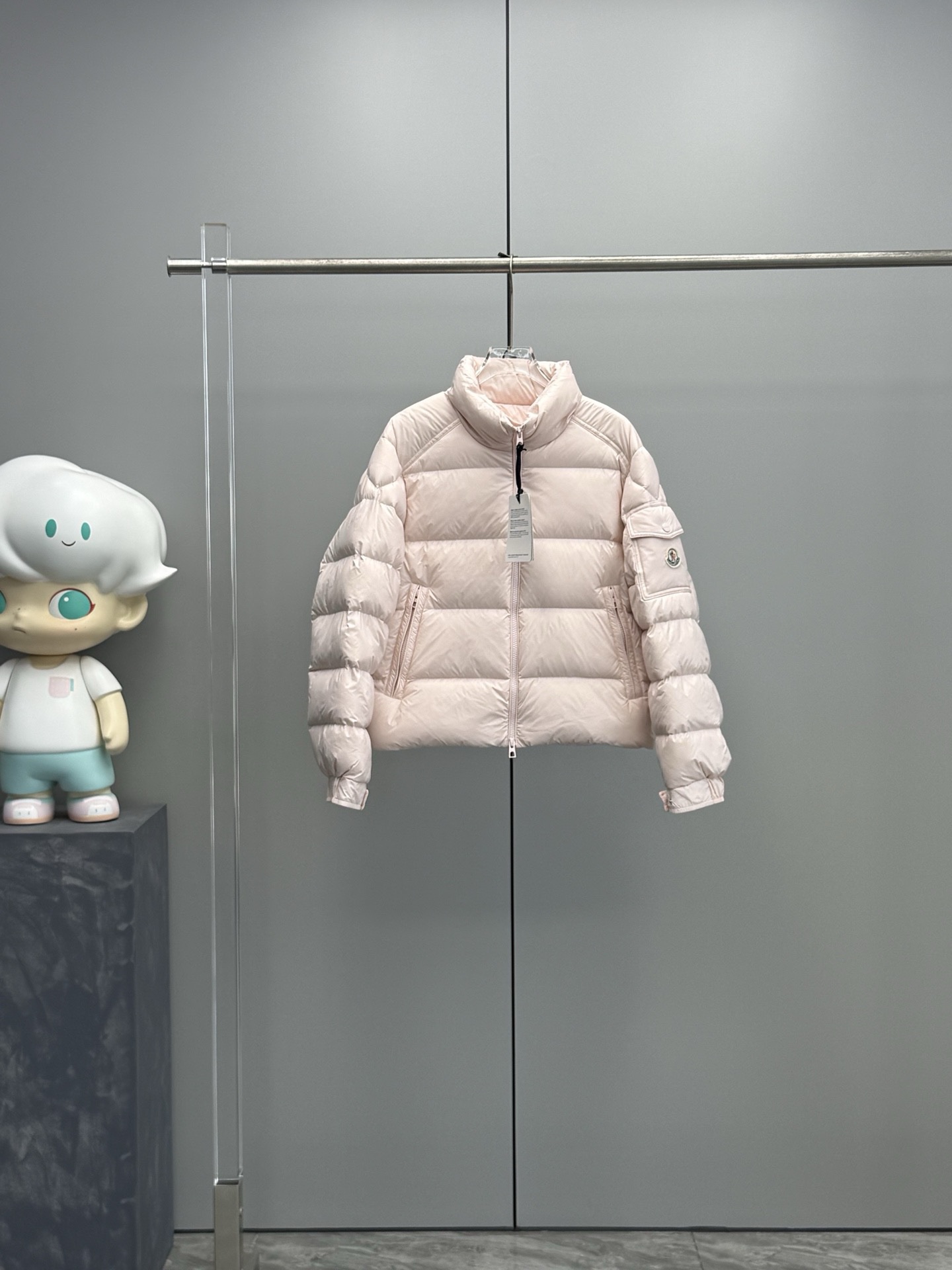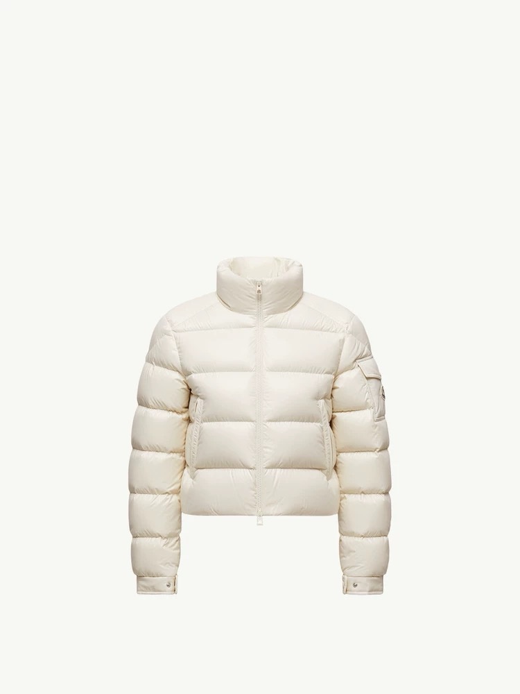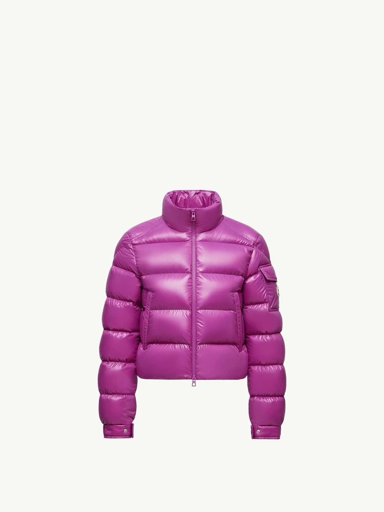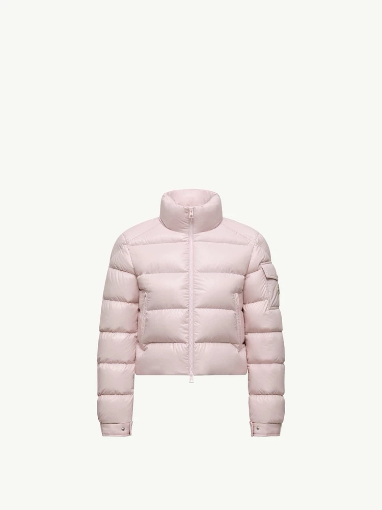 Куртка выполнена из водоотталкивающего нейлона super laqué, который отличается роскошным блеском и легким весом. Она имеет стеганый дизайн с горизонтальными строчками. Модель выполнена в приталенном (slim fit) и укороченном силуэте, что придает ей женственный вид. Изделие оснащено двусторонней молнией, боковыми карманами, эластичными манжетами и воротником-стойкой. В качестве наполнителя используется высококачественный легкий гусиный пух