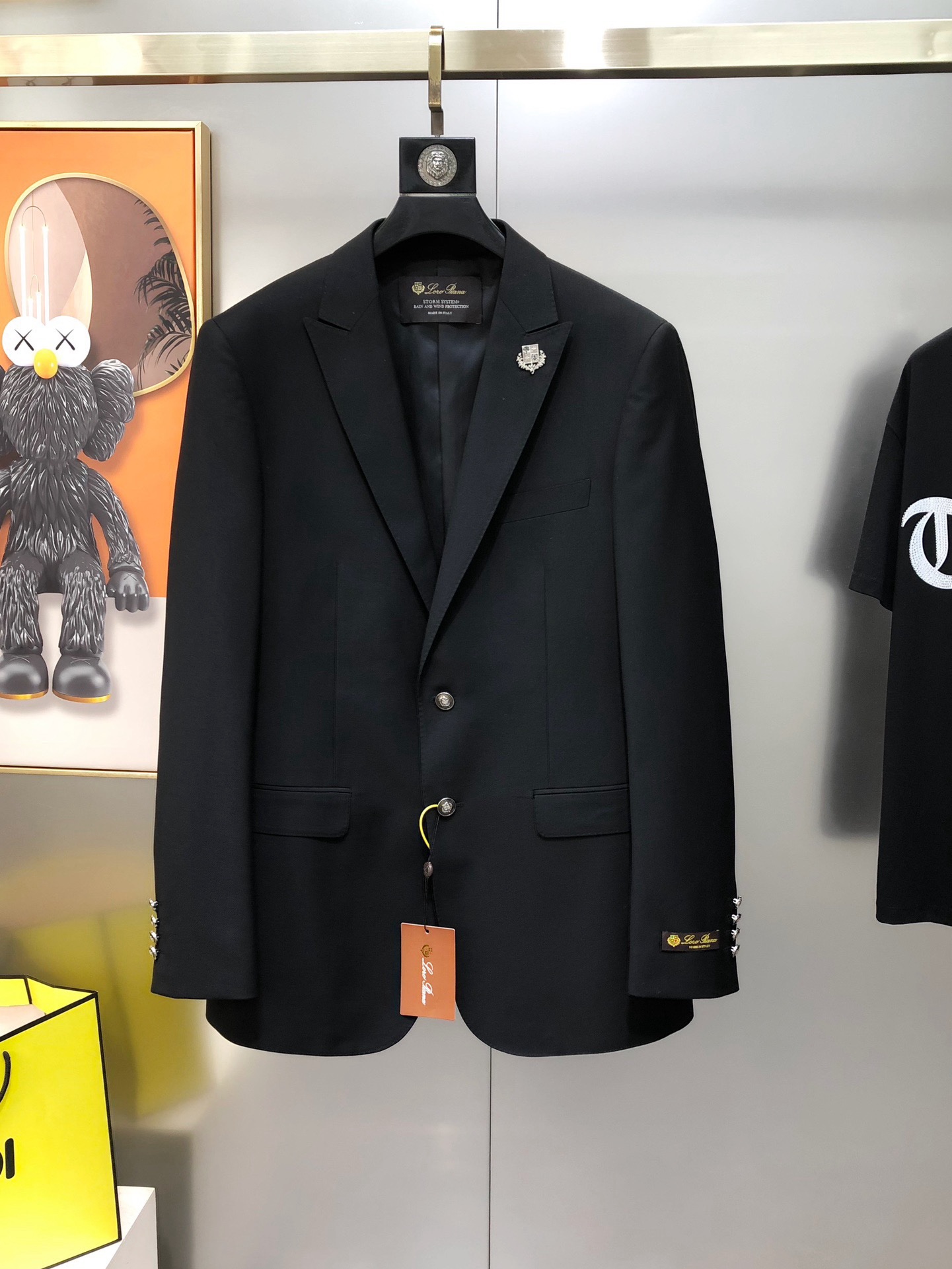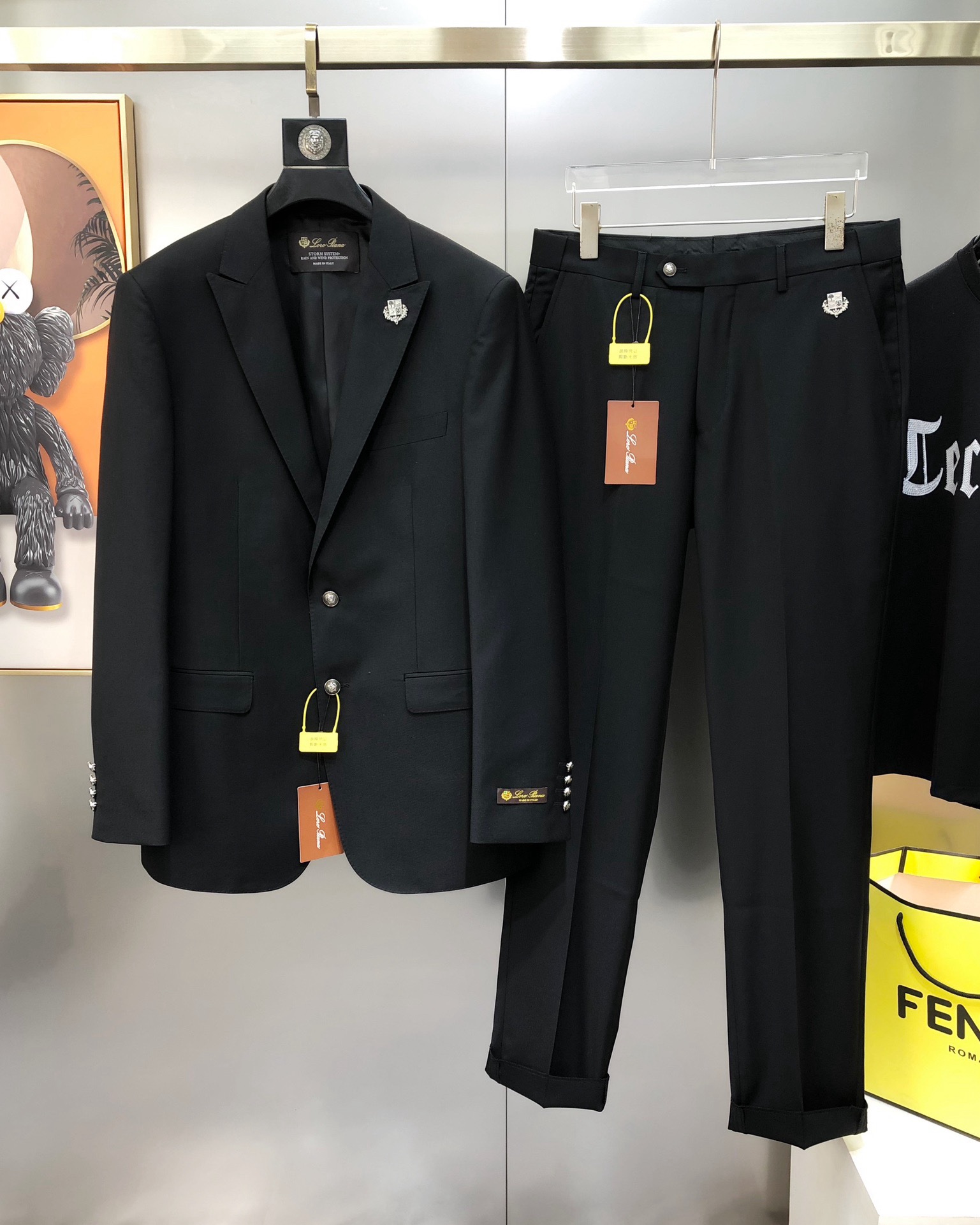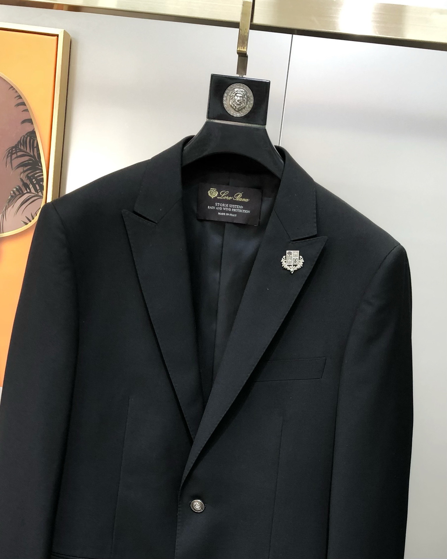 Костюм итальянского бренда класса люкс Loro Piana. Бренд известен производством одежды из высококачественной шерсти. Изготовлен по технологии Storm System. Это запатентованная технология Loro Piana, которая делает натуральные ткани полностью водонепроницаемыми и ветрозащитными. Технология состоит из двух частей: системы Rain System® (обработка, отталкивающая воду от поверхности ткани) и эксклюзивной гидрофильной мембраны. Ткань становится устойчивой к воздействию воды, ветронепроницаемой и при этом «дышащей», что обеспечивает комфорт при носке в различных погодных условиях.