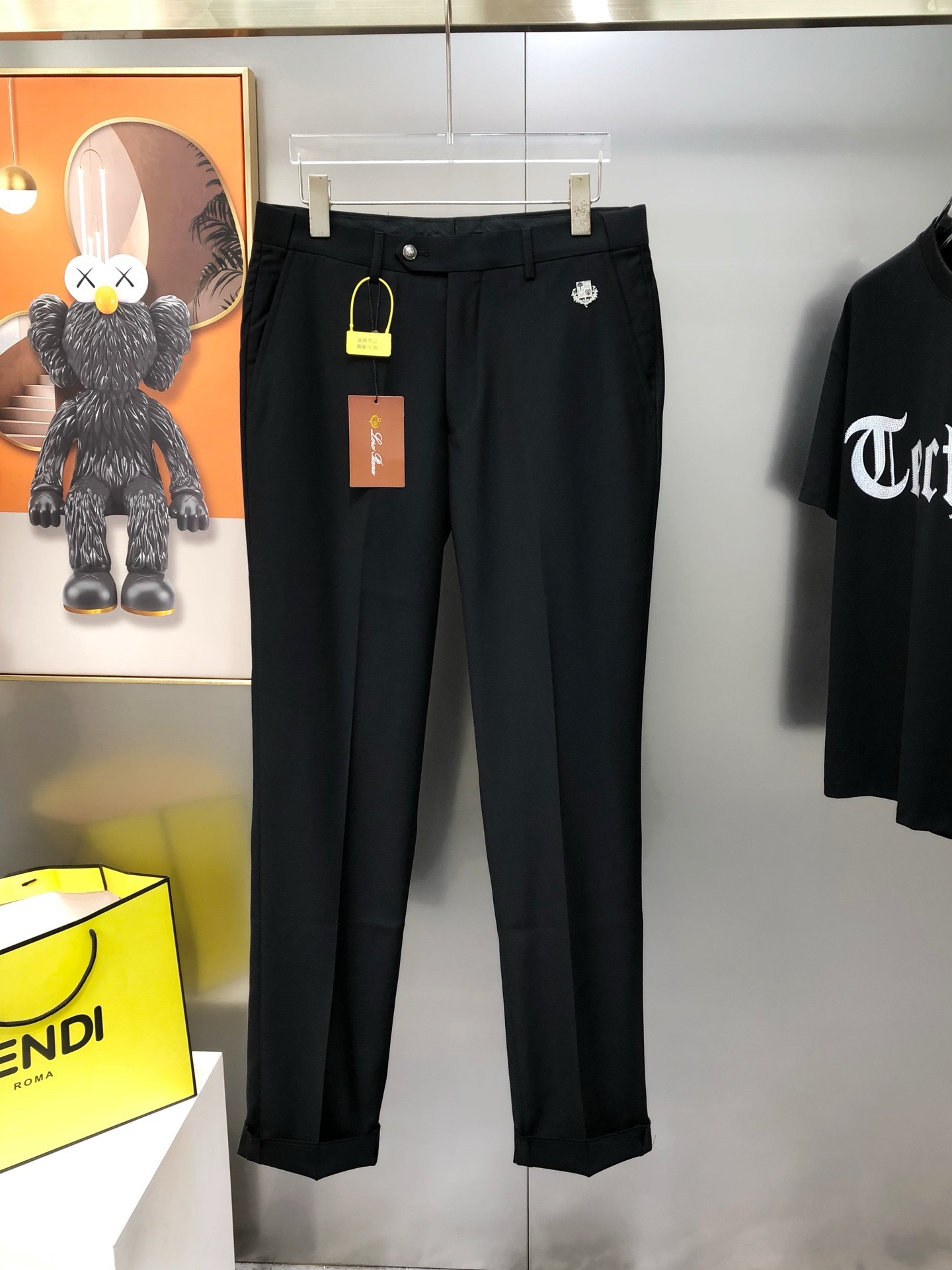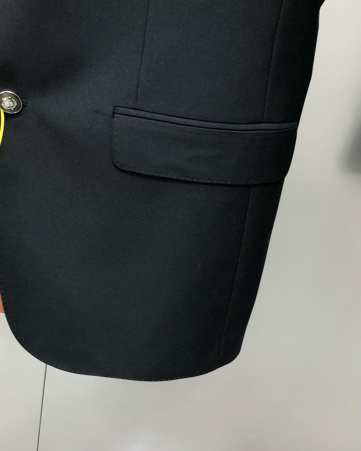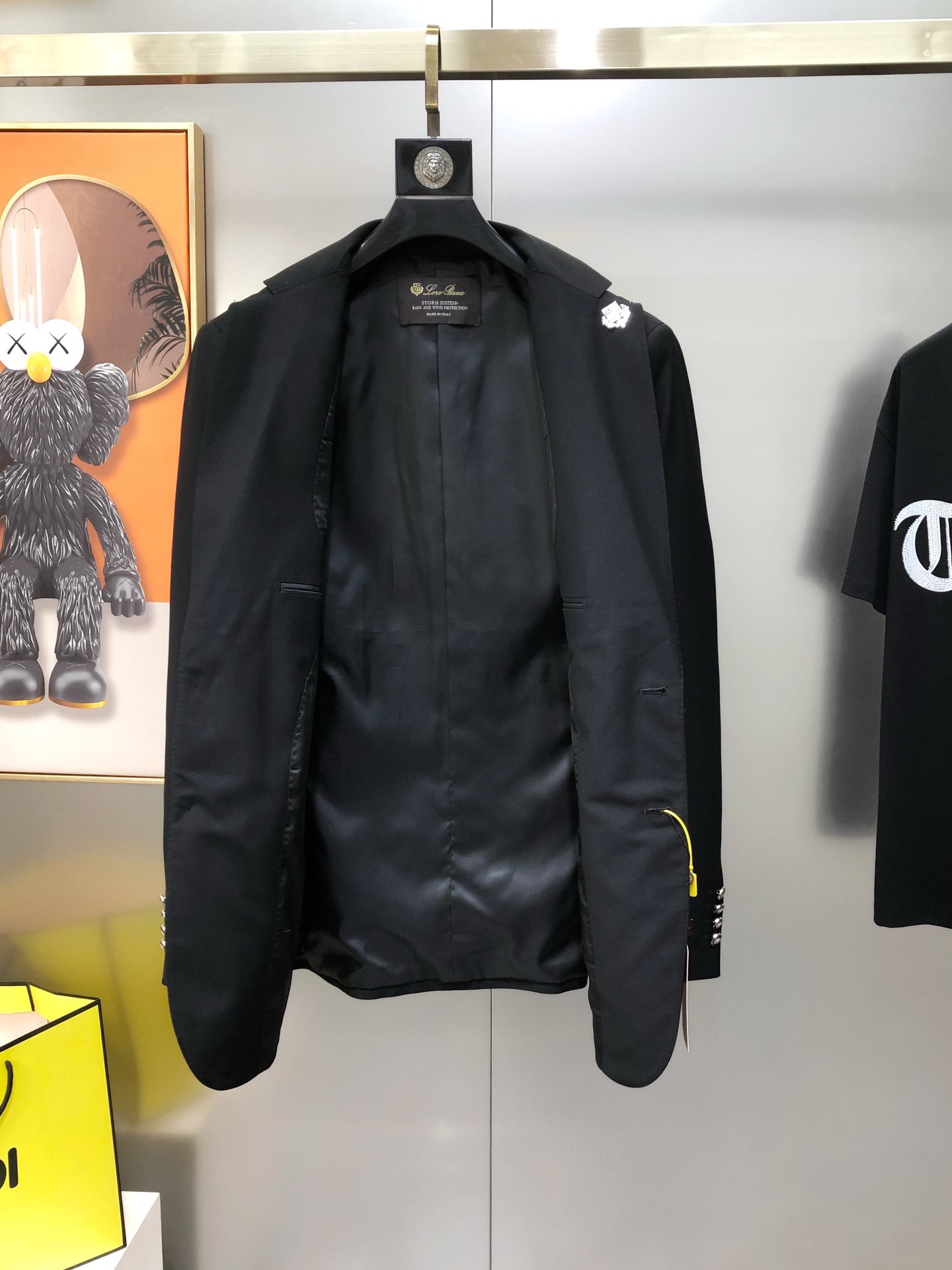 Костюм итальянского бренда класса люкс Loro Piana. Бренд известен производством одежды из высококачественной шерсти. Изготовлен по технологии Storm System. Это запатентованная технология Loro Piana, которая делает натуральные ткани полностью водонепроницаемыми и ветрозащитными. Технология состоит из двух частей: системы Rain System® (обработка, отталкивающая воду от поверхности ткани) и эксклюзивной гидрофильной мембраны. Ткань становится устойчивой к воздействию воды, ветронепроницаемой и при этом «дышащей», что обеспечивает комфорт при носке в различных погодных условиях.