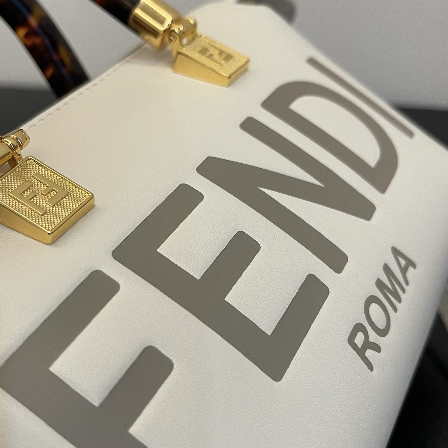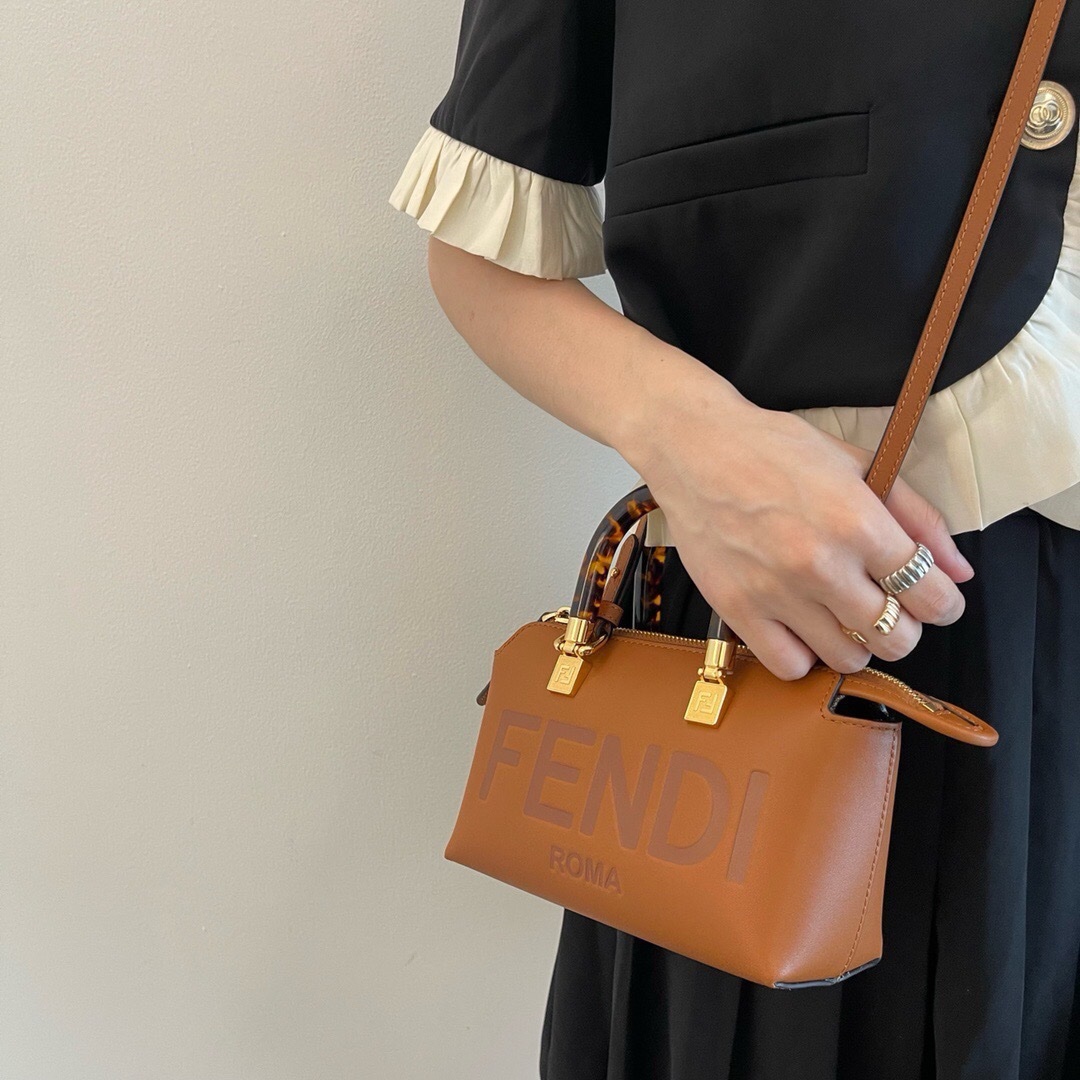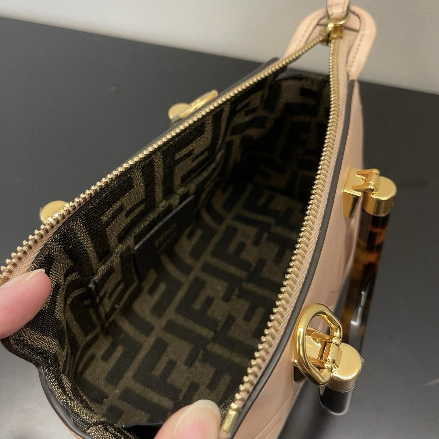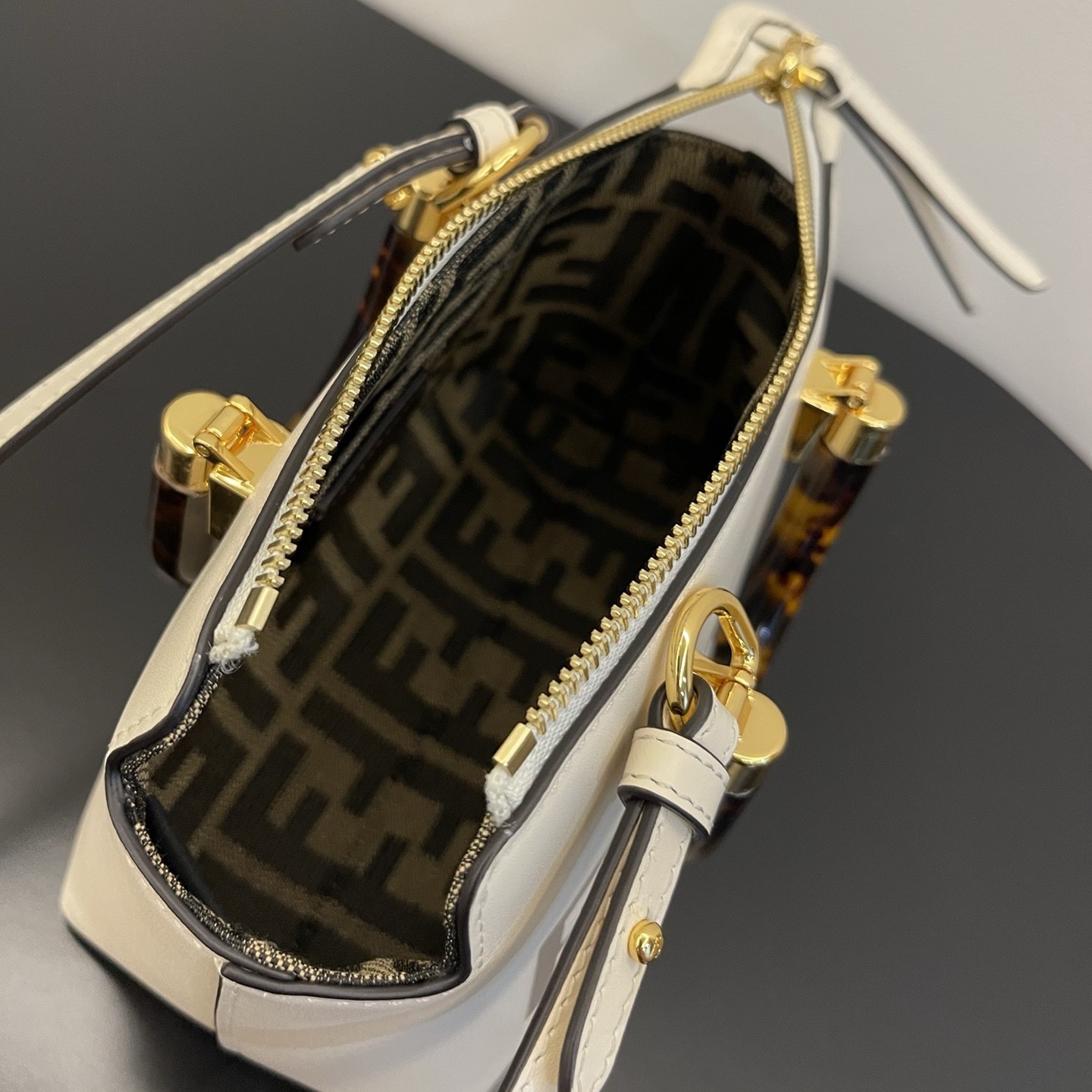 Изготовлена из кожи с тисненым логотипом FENDI ROMA и жесткими акриловыми ручками с эффектом черепаховой панцири. Застежка-молния. Внутри тканевая подкладка, карманы и фурнитура золотистого цвета. Сумочка имеет ручки и съемный плечевой ремень для ношения в руке, на плече или через плечо. Сделано в Италии.