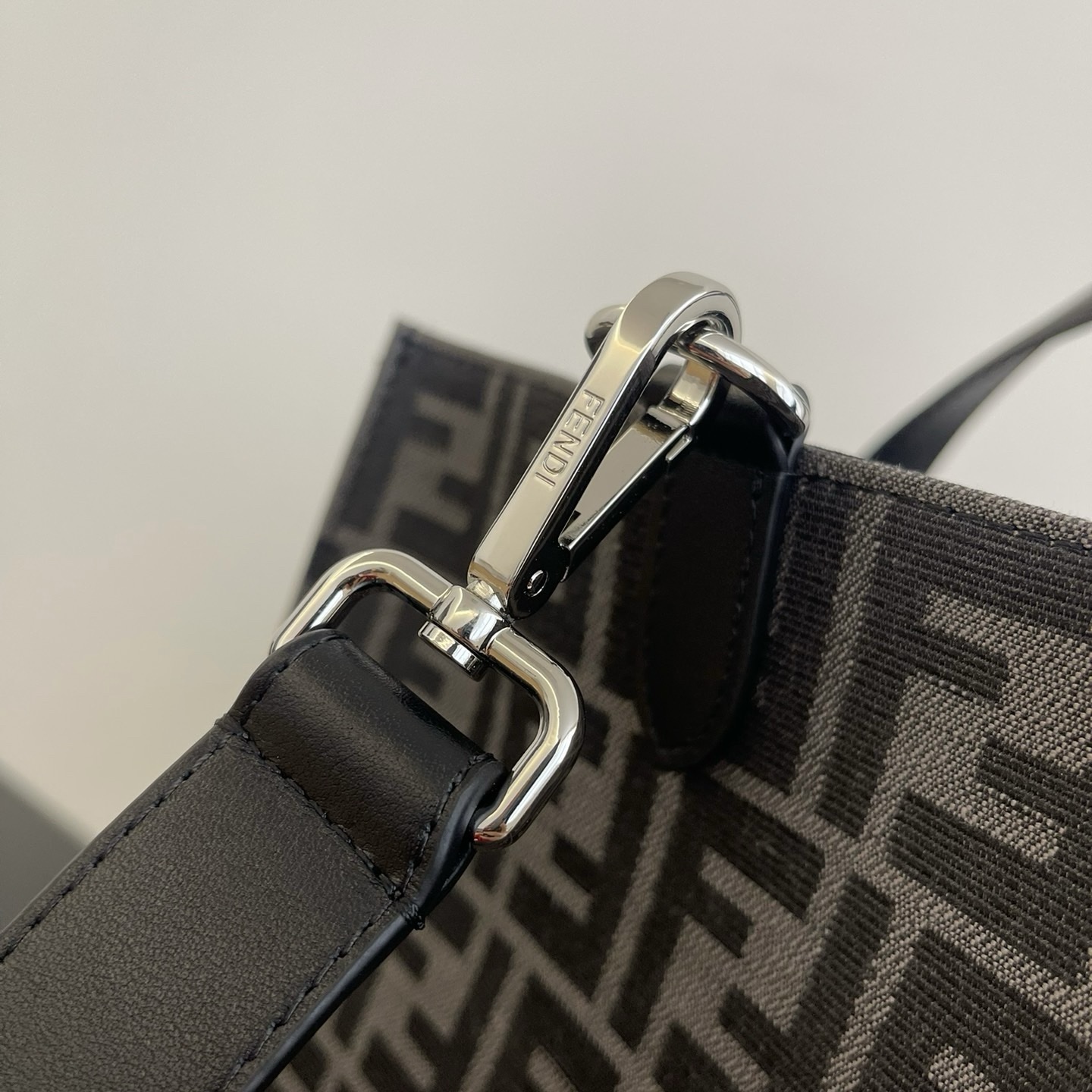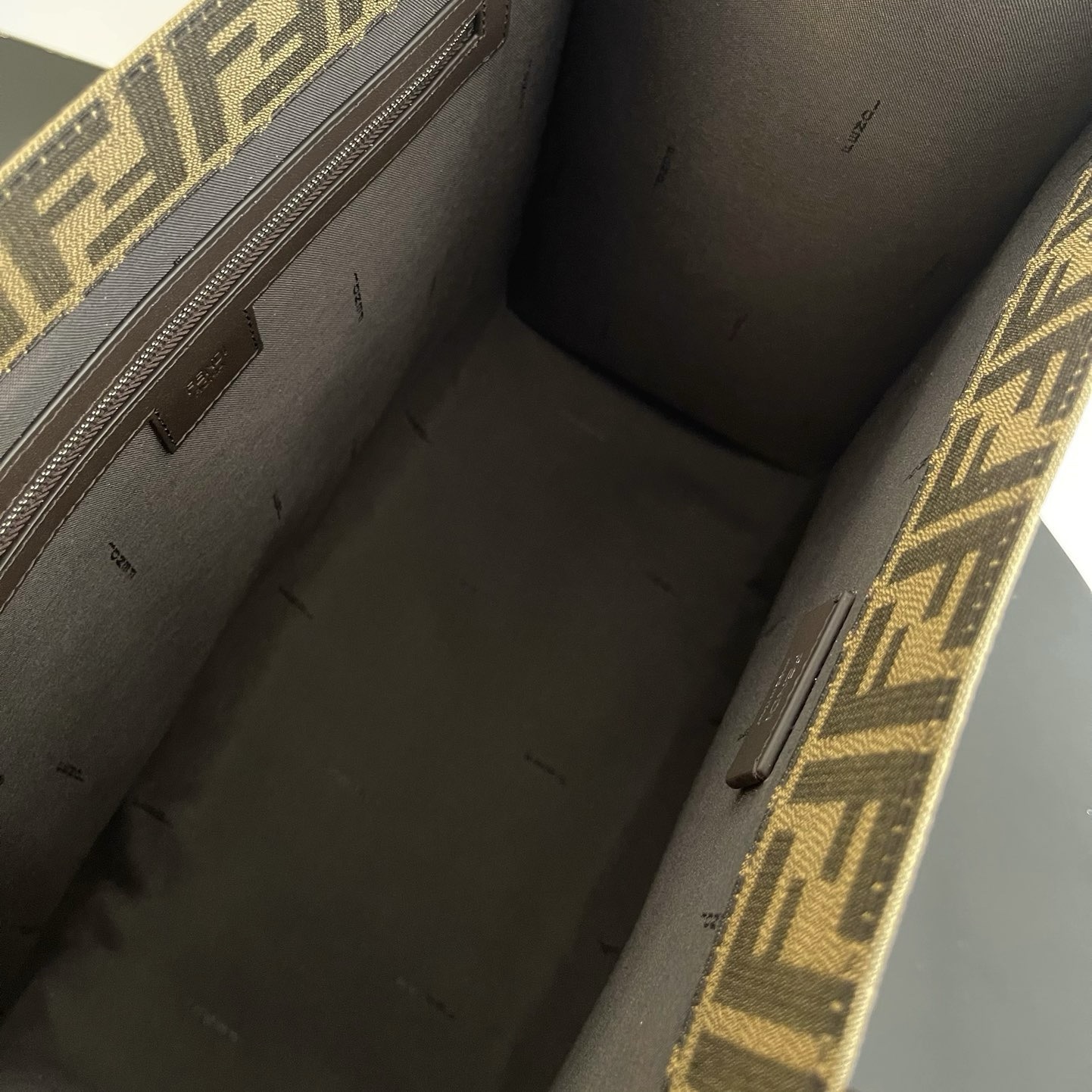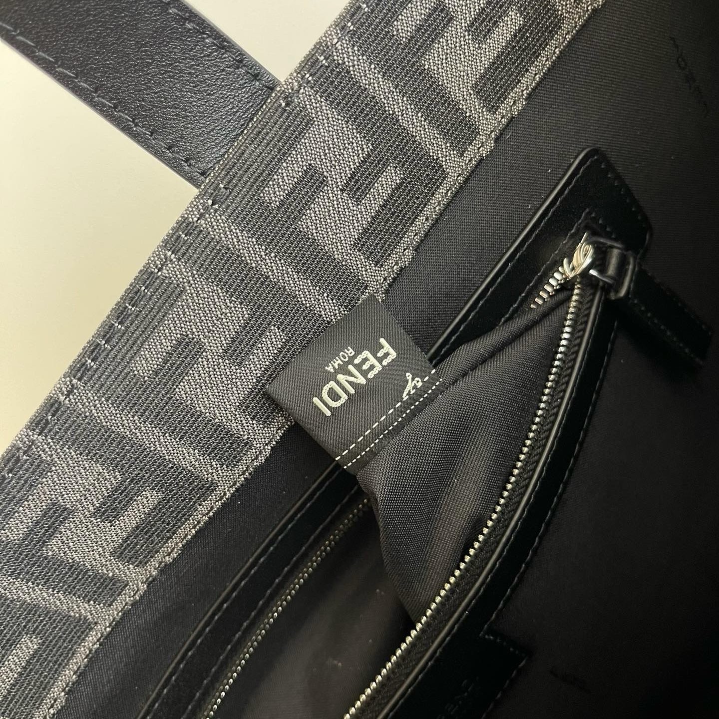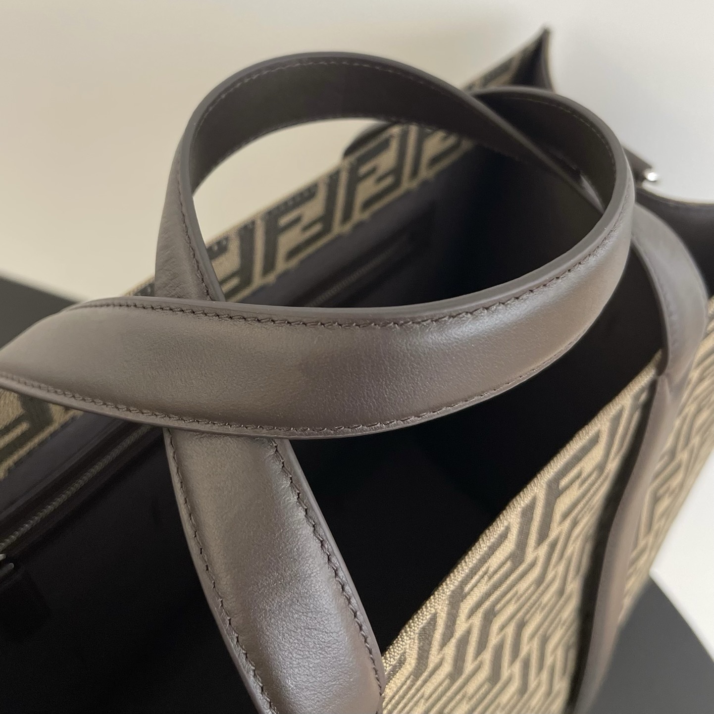 Изготовлена из переработанной жаккардовой ткани и украшена узором FF. Имеет внутреннее отделение с тканевой подкладкой, внутренний карман на молнии и фурнитуру серебристого цвета. Оснащена двумя кожаными ручками и регулируемым съемным кожаным плечевым ремнем для ношения в руке или на плече.