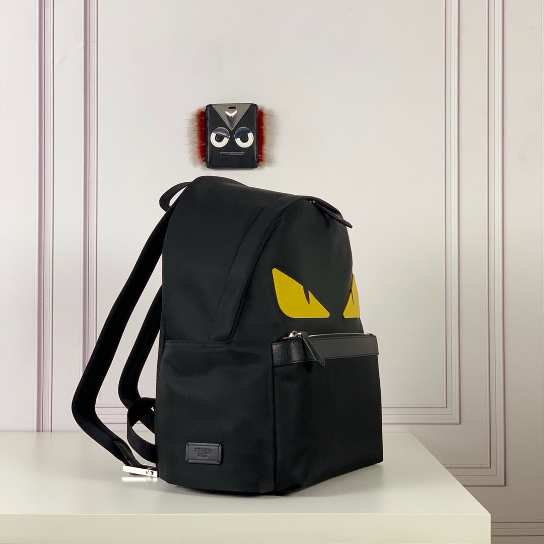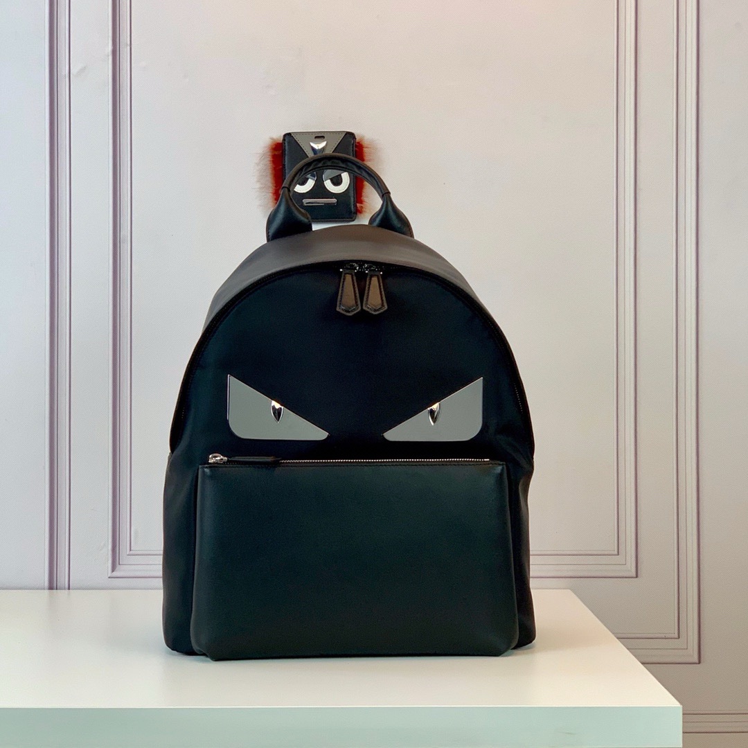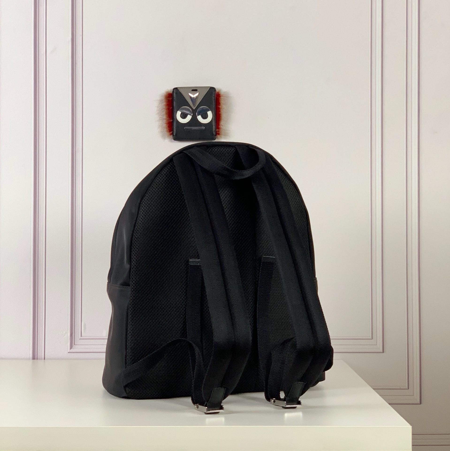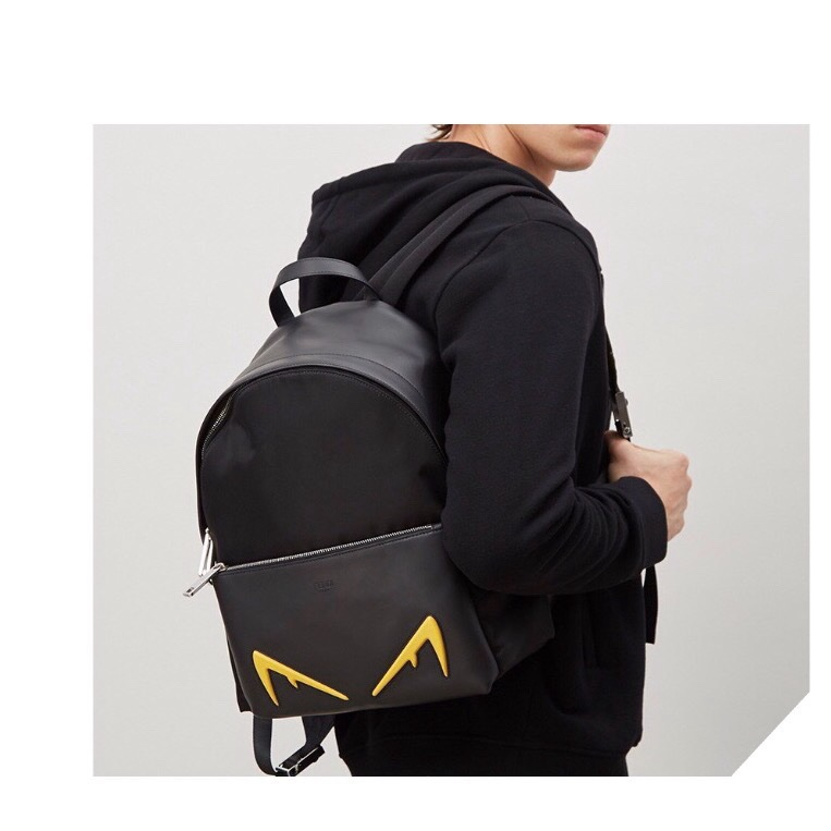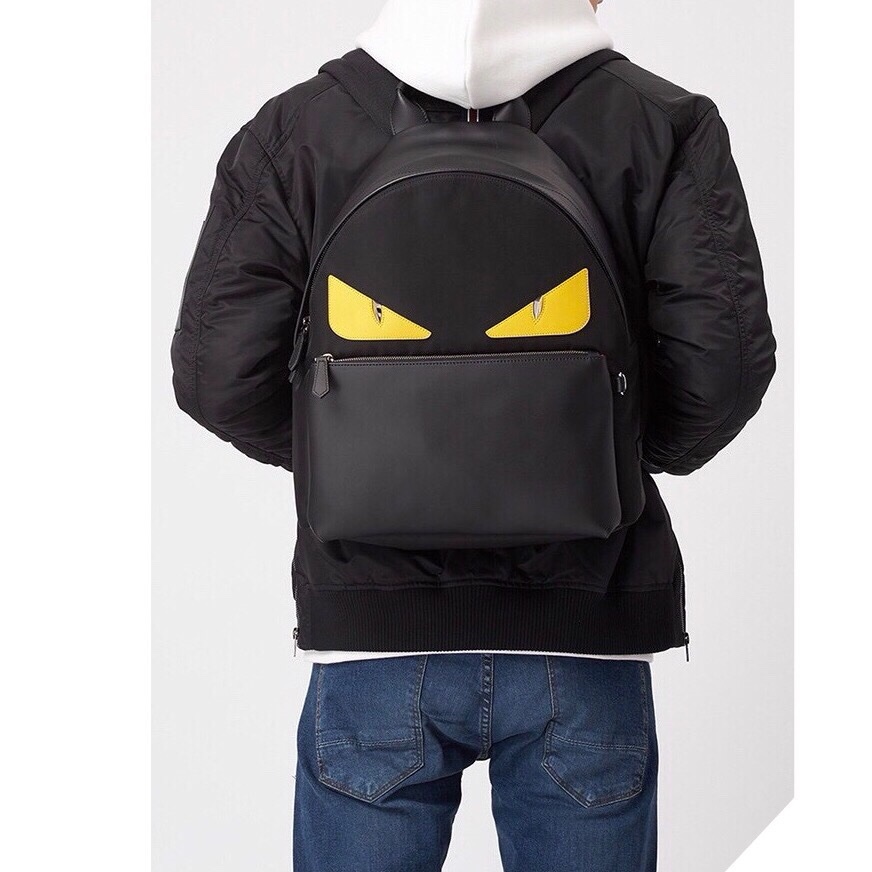 Рюкзак серии FENDI. Большой рюкзак с передним карманом. Дышащая высокотехнологичная сетчатая ткань на спинке, регулируемые плечевые лямки. Двойная застежка-молния, внутренние карманы. Конструкция из черного нейлона и кожи. Металлическая аппликация с золотым покрытием в форме глаз «жучков-мешочков».