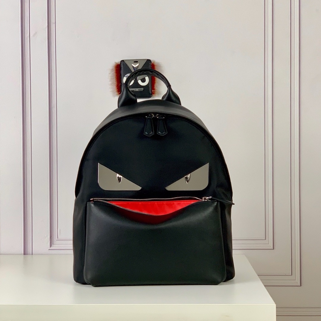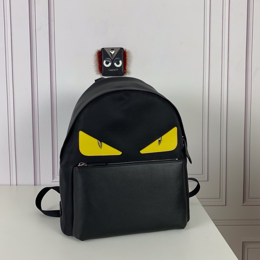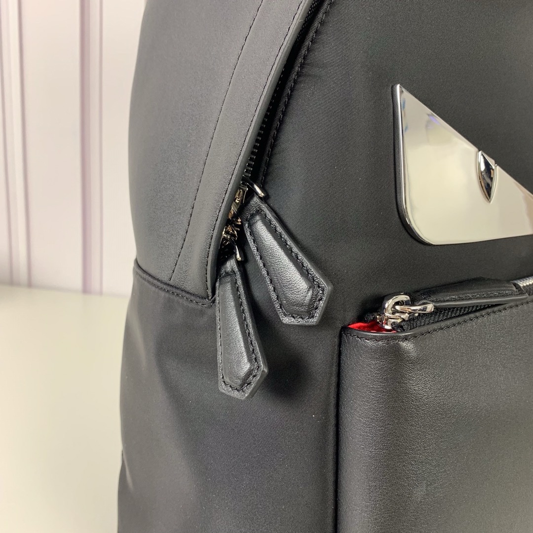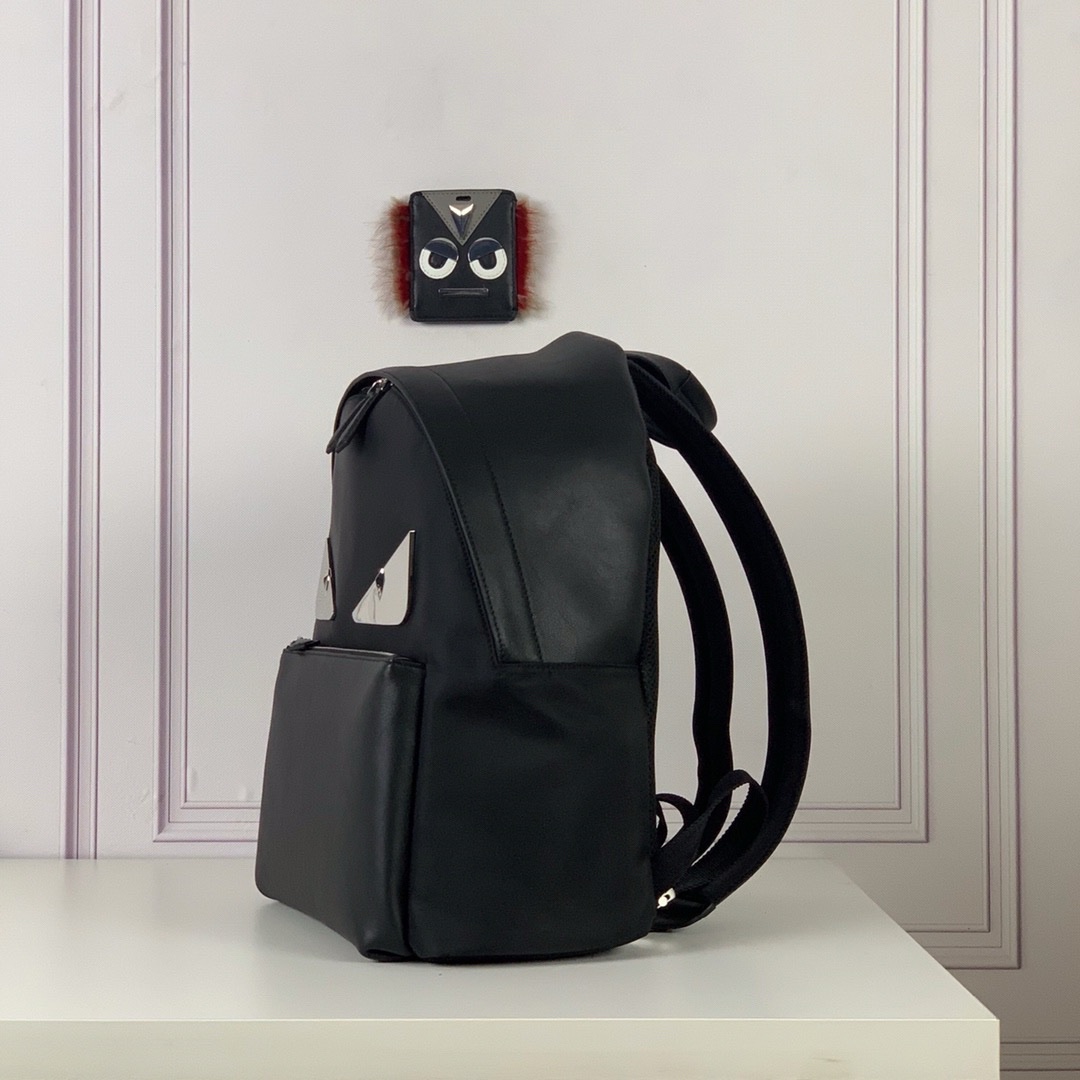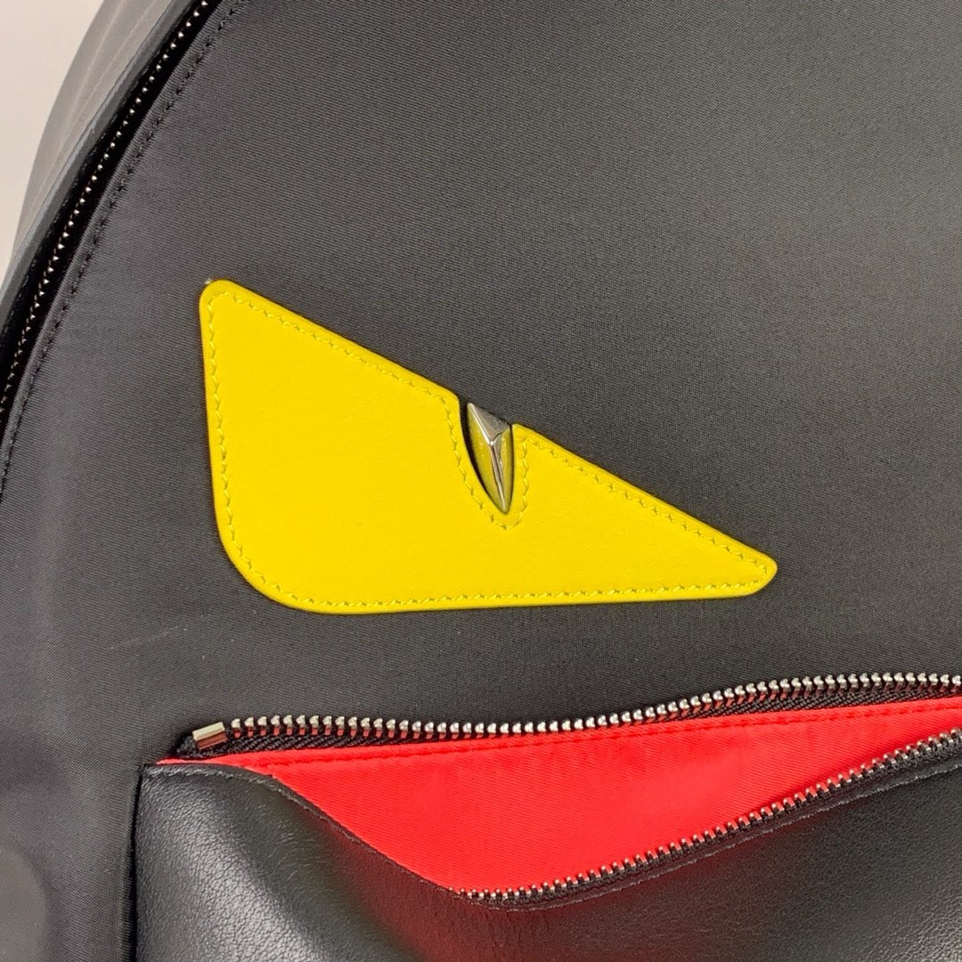 Рюкзак серии FENDI. Большой рюкзак с передним карманом. Дышащая высокотехнологичная сетчатая ткань на спинке, регулируемые плечевые лямки. Двойная застежка-молния, внутренние карманы. Конструкция из черного нейлона и кожи. Металлическая аппликация с золотым покрытием в форме глаз «жучков-мешочков».