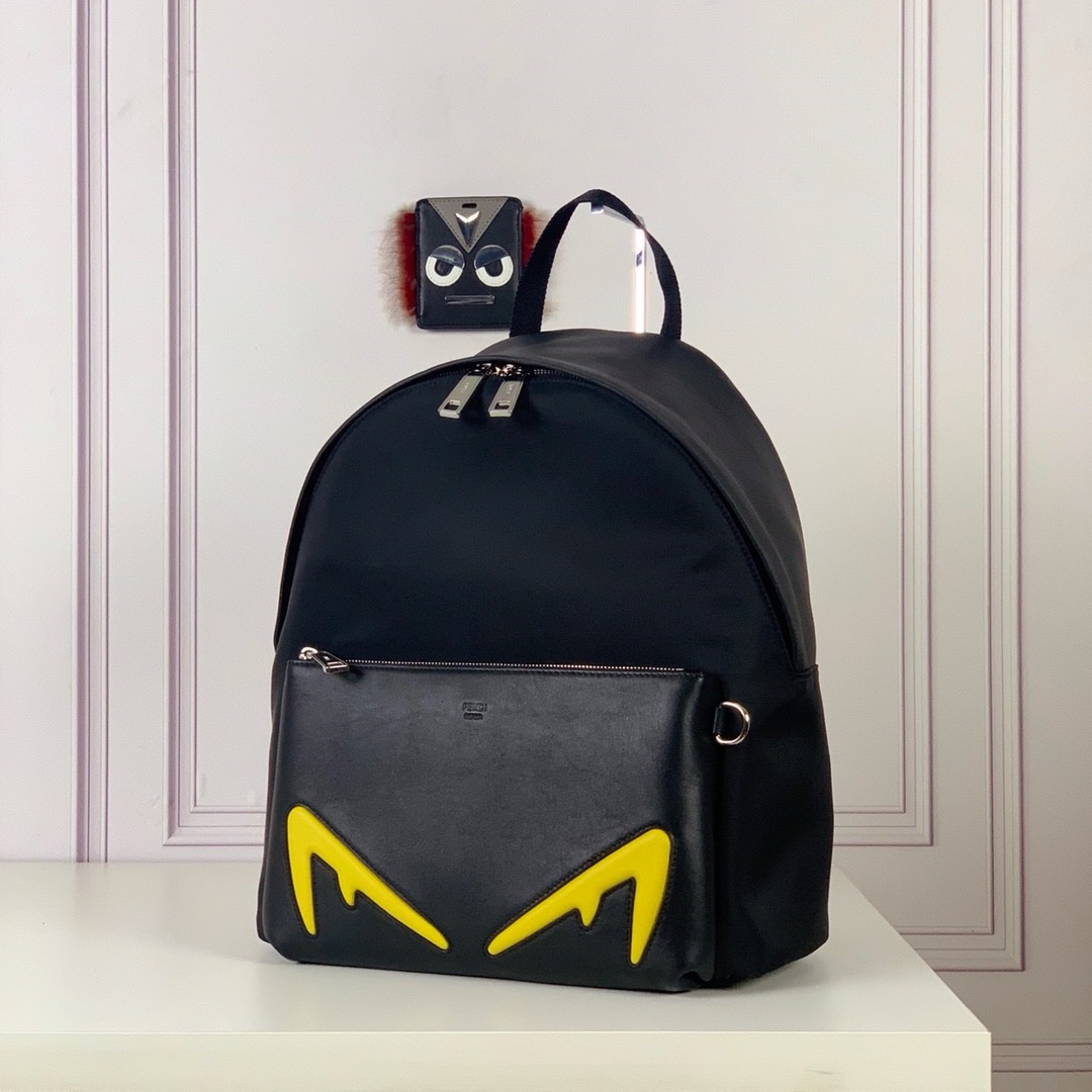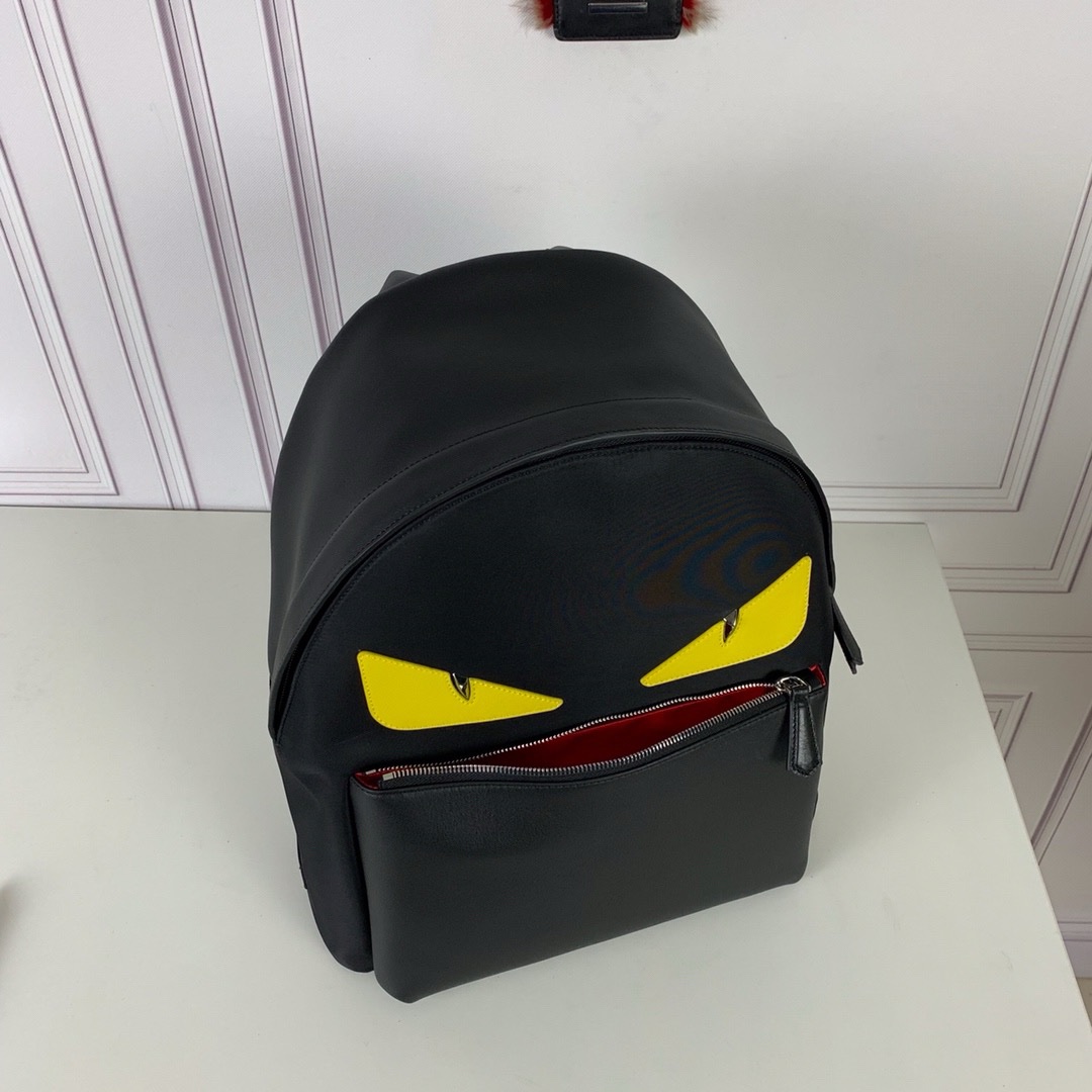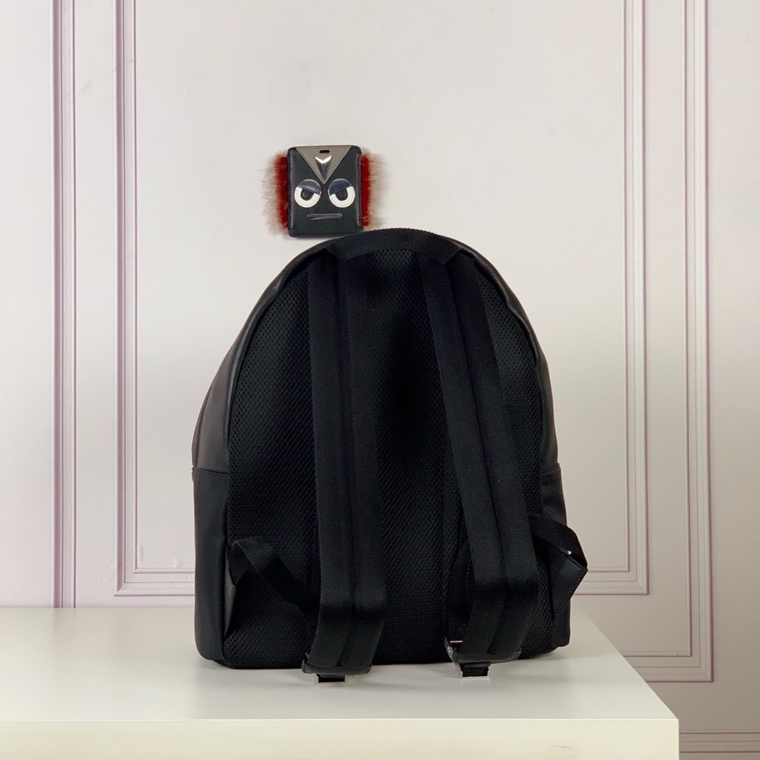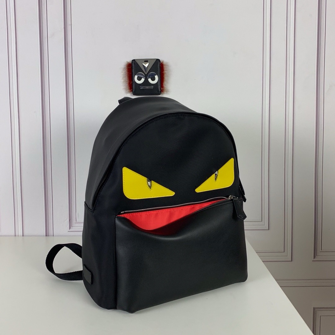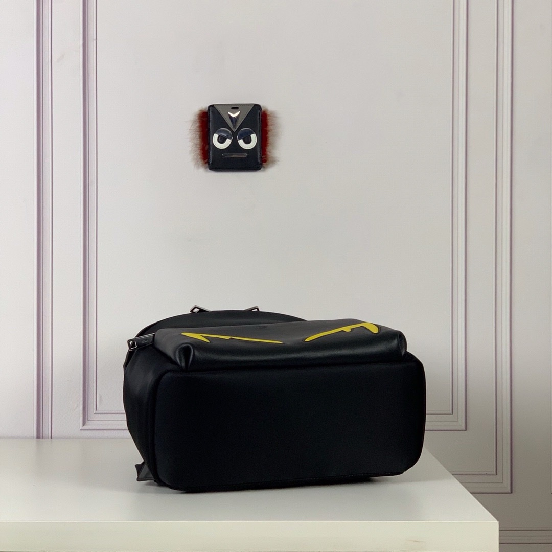 Рюкзак серии FENDI. Большой рюкзак с передним карманом. Дышащая высокотехнологичная сетчатая ткань на спинке, регулируемые плечевые лямки. Двойная застежка-молния, внутренние карманы. Конструкция из черного нейлона и кожи. Металлическая аппликация с золотым покрытием в форме глаз «жучков-мешочков».