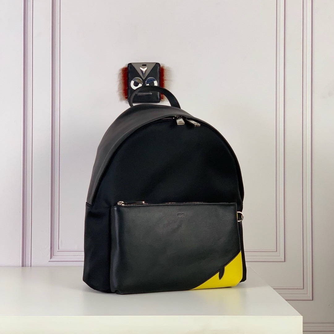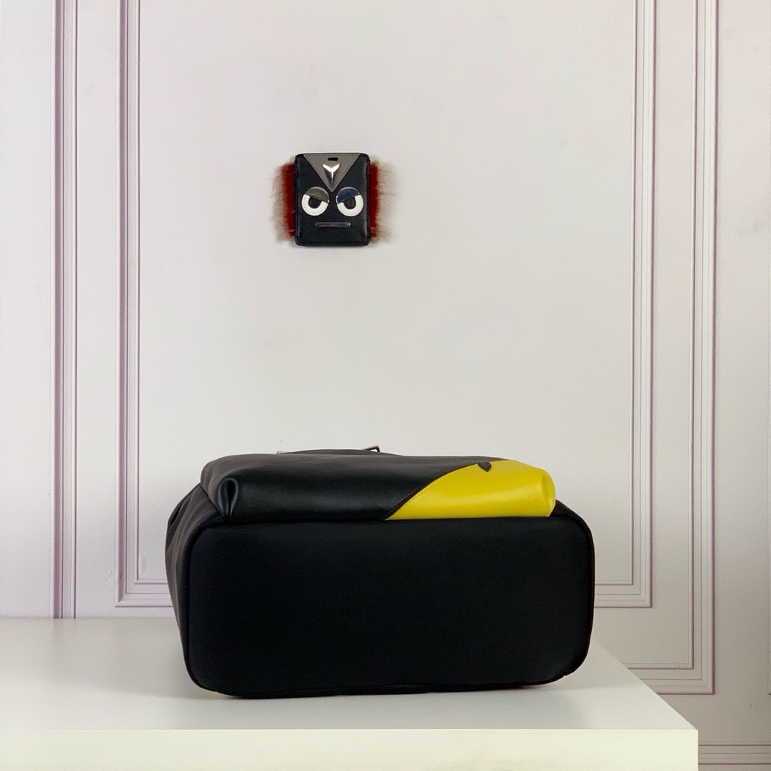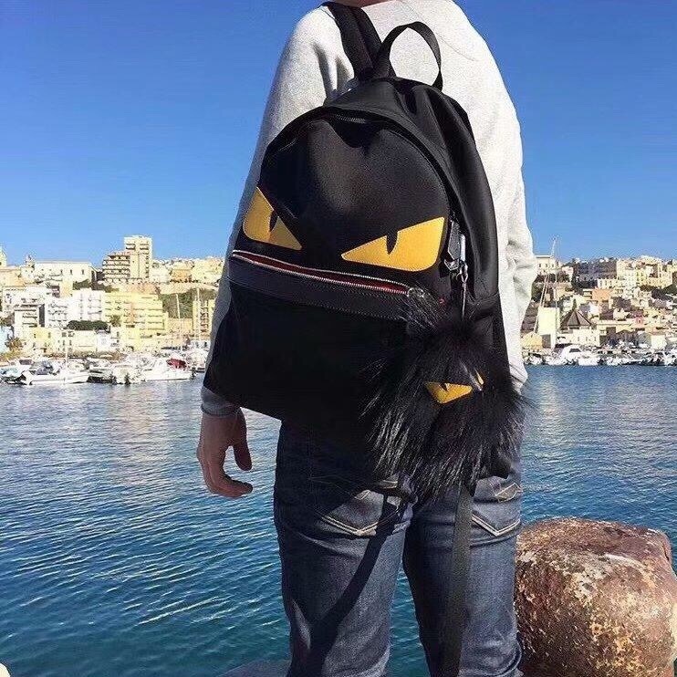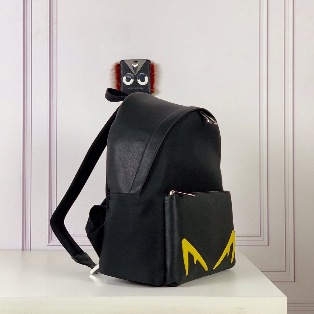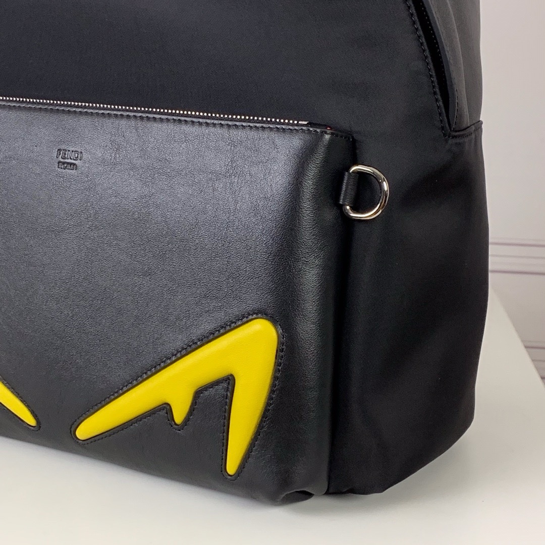 Рюкзак серии FENDI. Большой рюкзак с передним карманом. Дышащая высокотехнологичная сетчатая ткань на спинке, регулируемые плечевые лямки. Двойная застежка-молния, внутренние карманы. Конструкция из черного нейлона и кожи. Металлическая аппликация с золотым покрытием в форме глаз «жучков-мешочков».