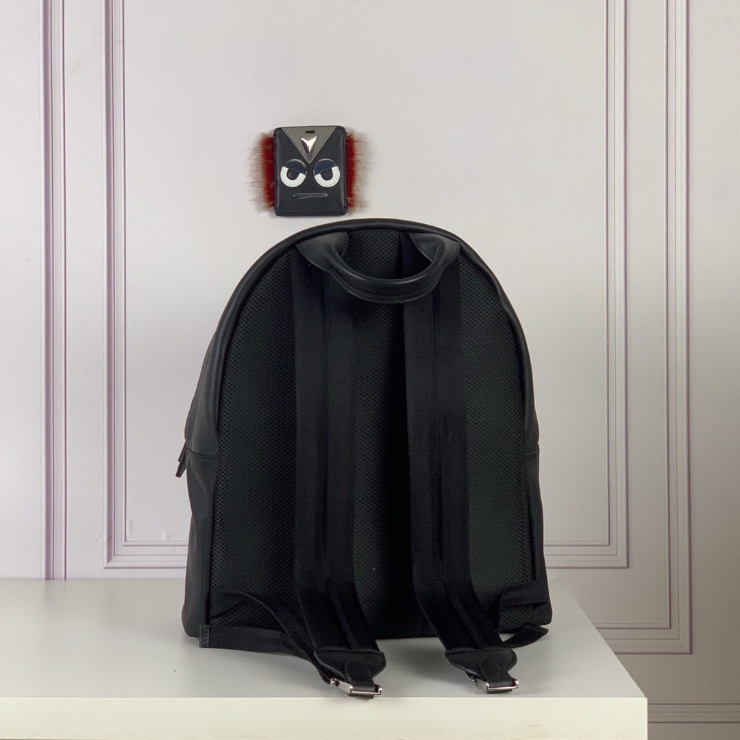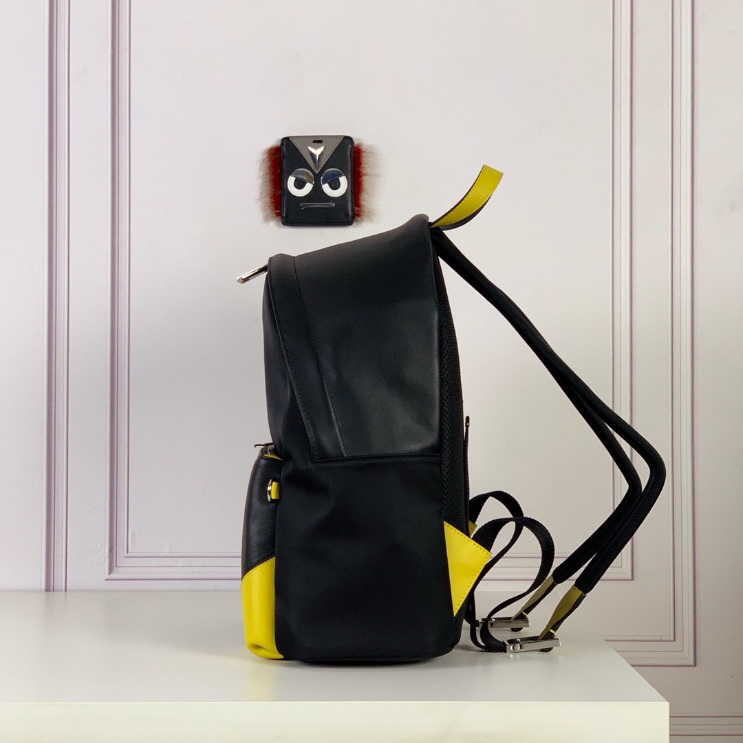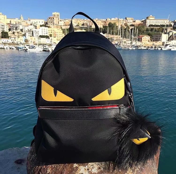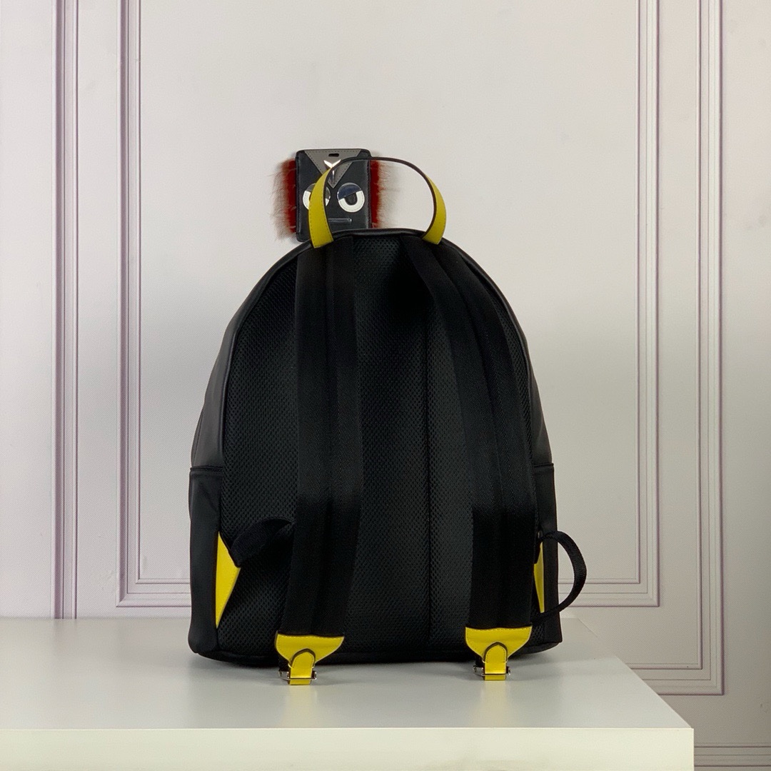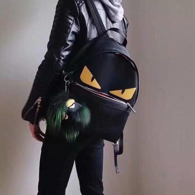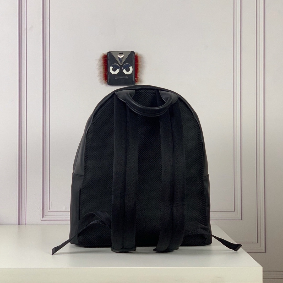 Рюкзак серии FENDI. Большой рюкзак с передним карманом. Дышащая высокотехнологичная сетчатая ткань на спинке, регулируемые плечевые лямки. Двойная застежка-молния, внутренние карманы. Конструкция из черного нейлона и кожи. Металлическая аппликация с золотым покрытием в форме глаз «жучков-мешочков».