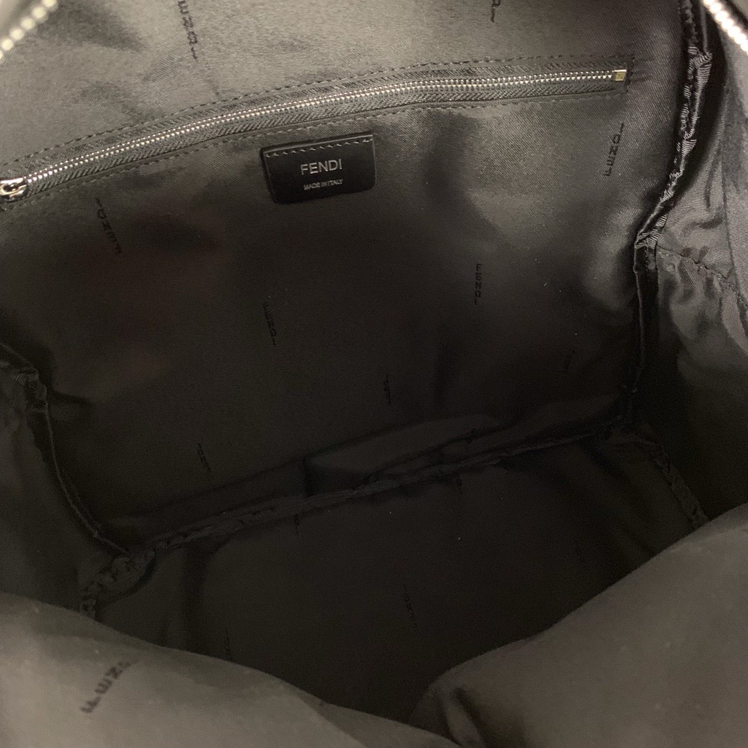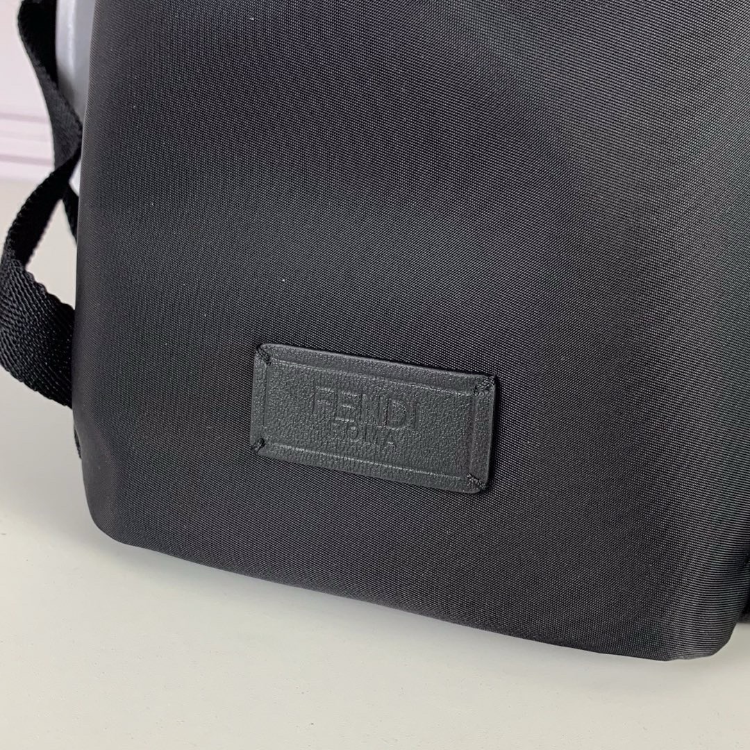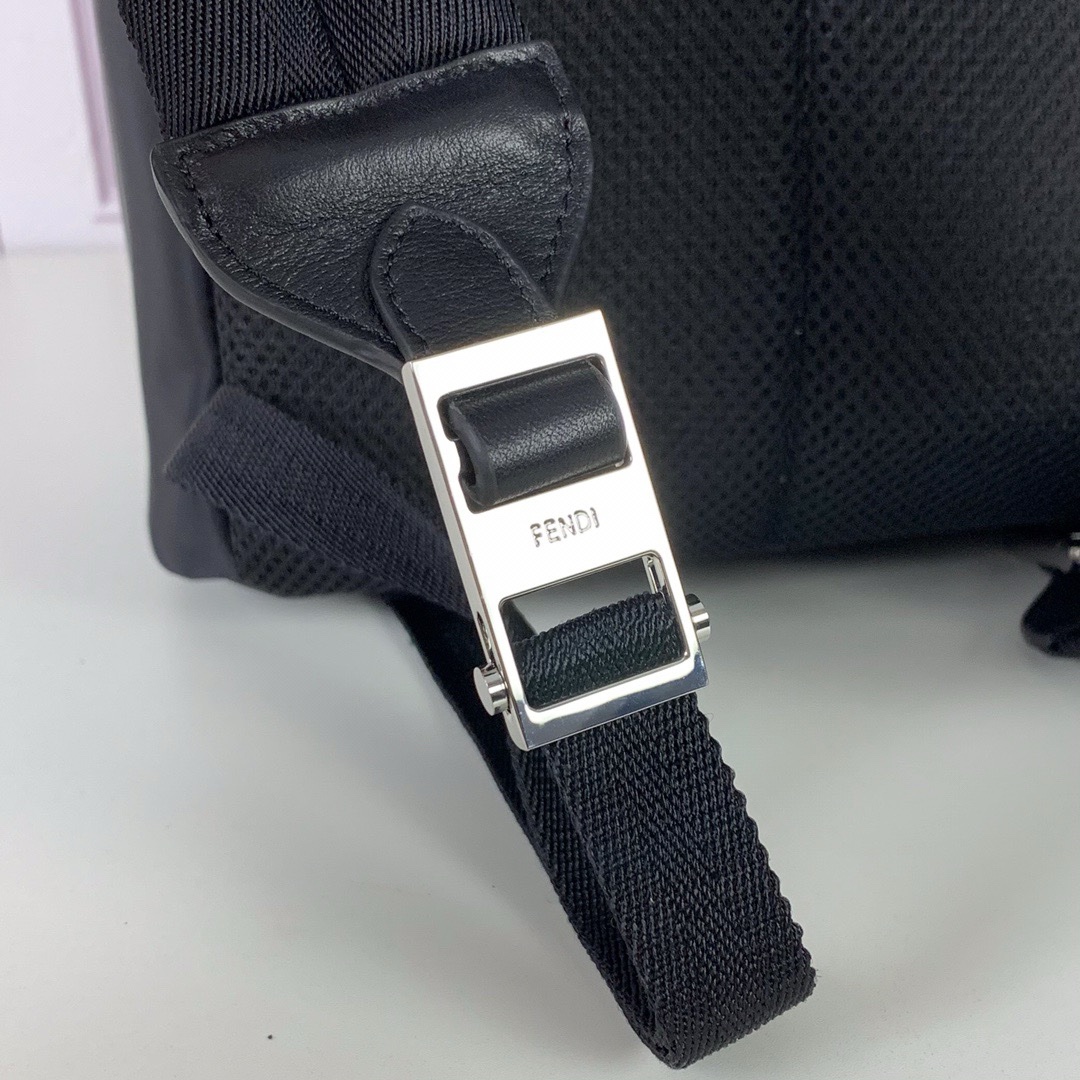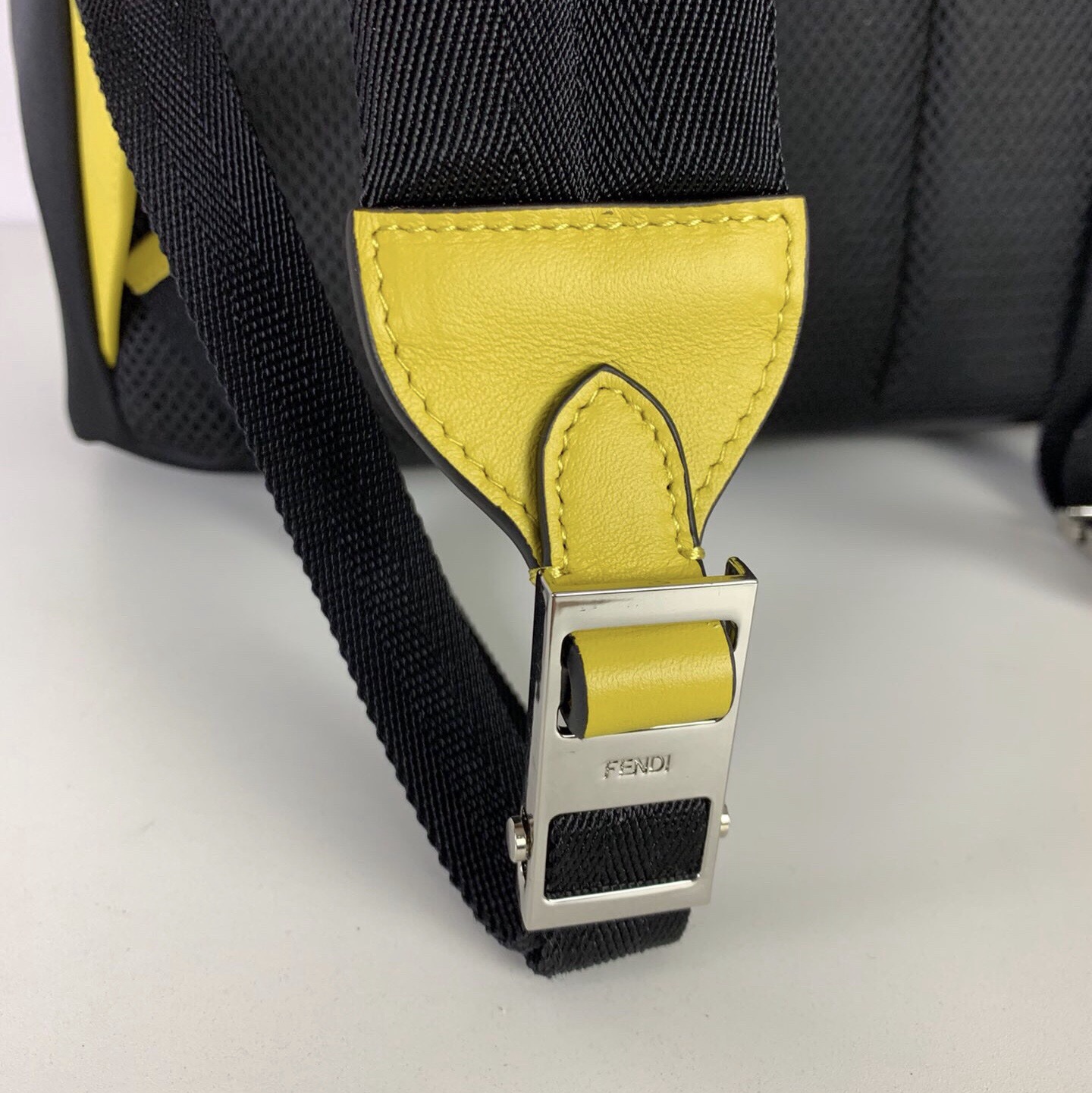 Рюкзак серии FENDI. Большой рюкзак с передним карманом. Дышащая высокотехнологичная сетчатая ткань на спинке, регулируемые плечевые лямки. Двойная застежка-молния, внутренние карманы. Конструкция из черного нейлона и кожи. Металлическая аппликация с золотым покрытием в форме глаз «жучков-мешочков».