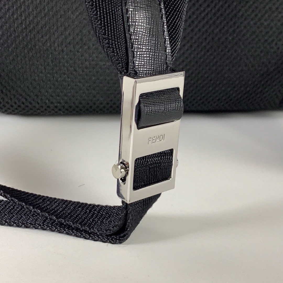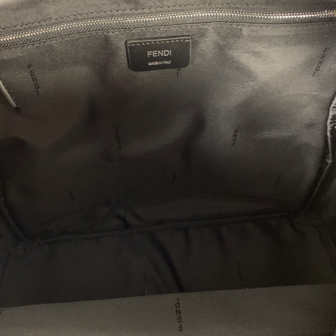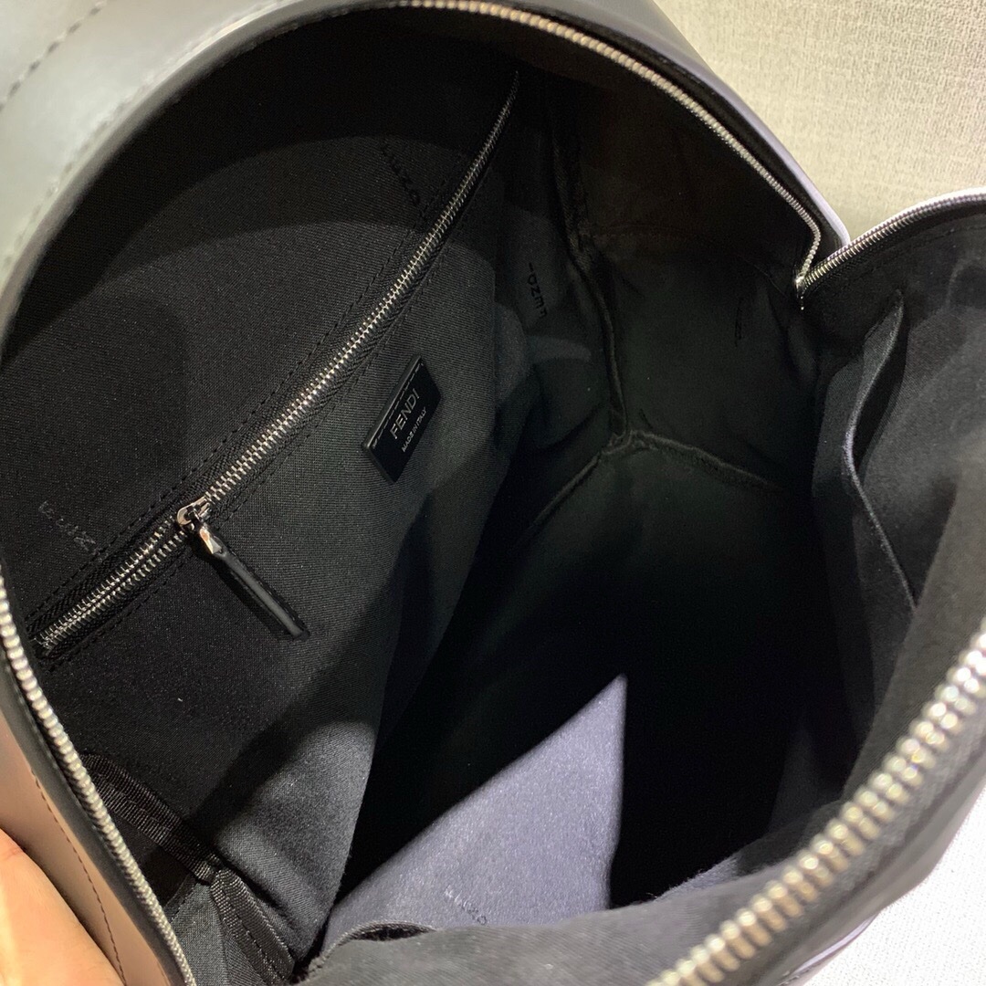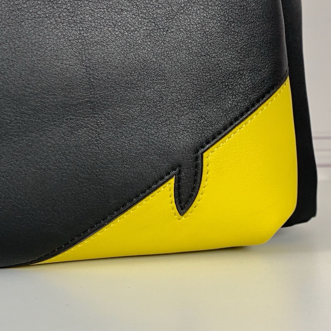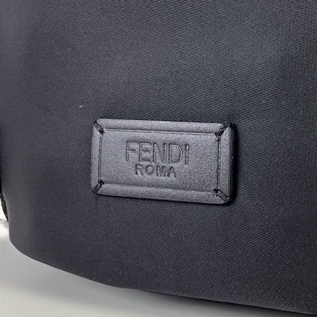 Рюкзак серии FENDI. Большой рюкзак с передним карманом. Дышащая высокотехнологичная сетчатая ткань на спинке, регулируемые плечевые лямки. Двойная застежка-молния, внутренние карманы. Конструкция из черного нейлона и кожи. Металлическая аппликация с золотым покрытием в форме глаз «жучков-мешочков».