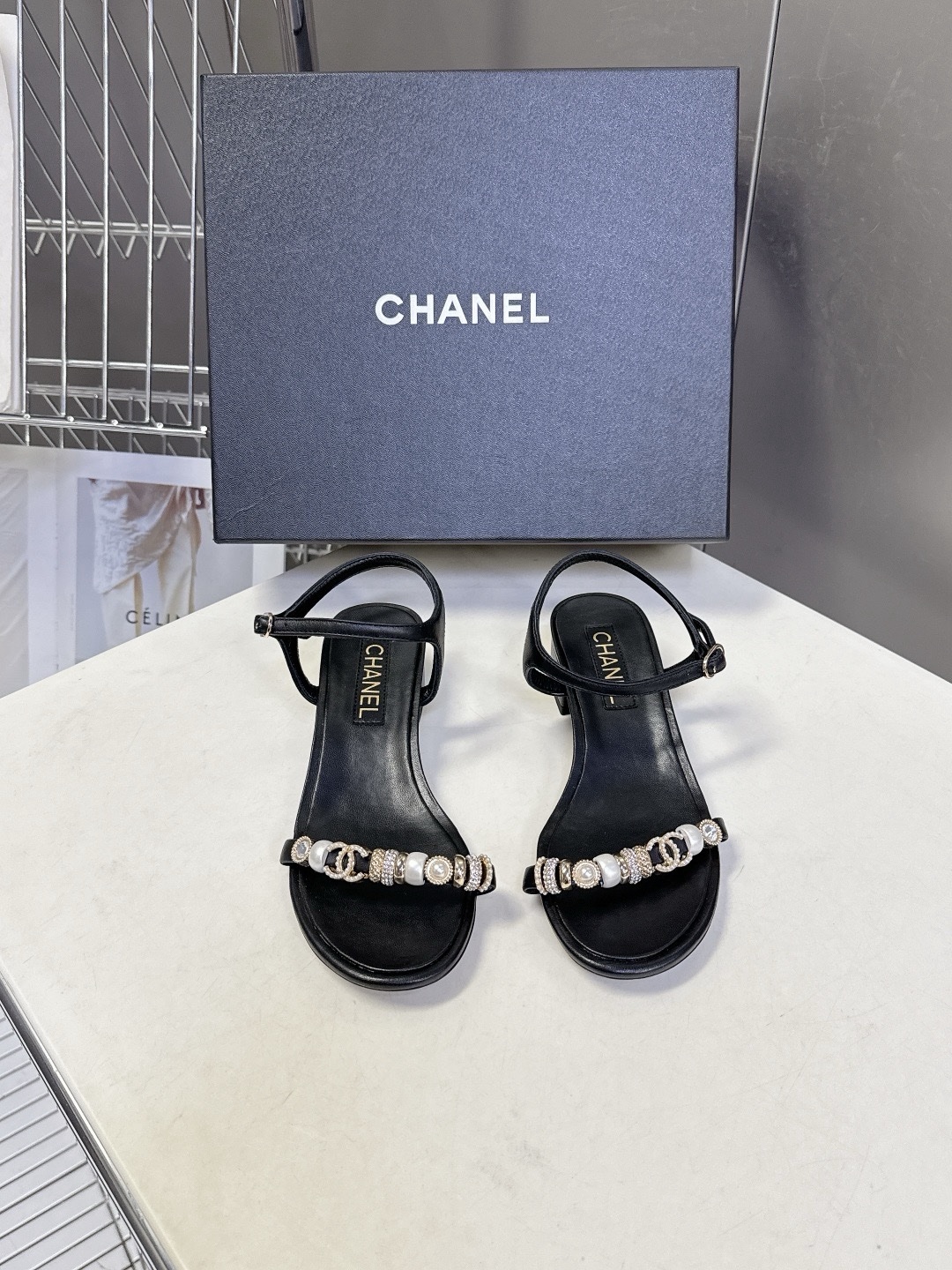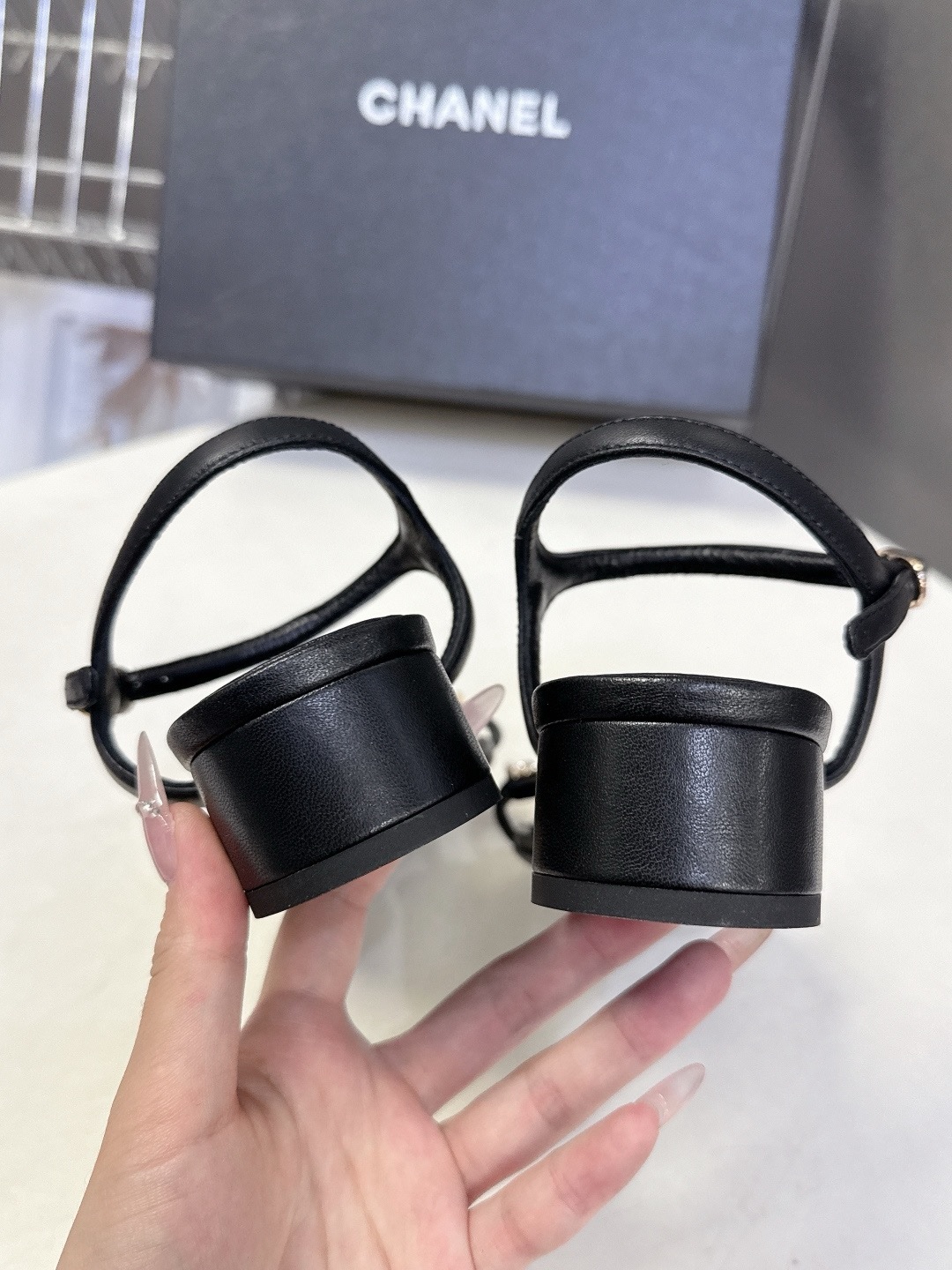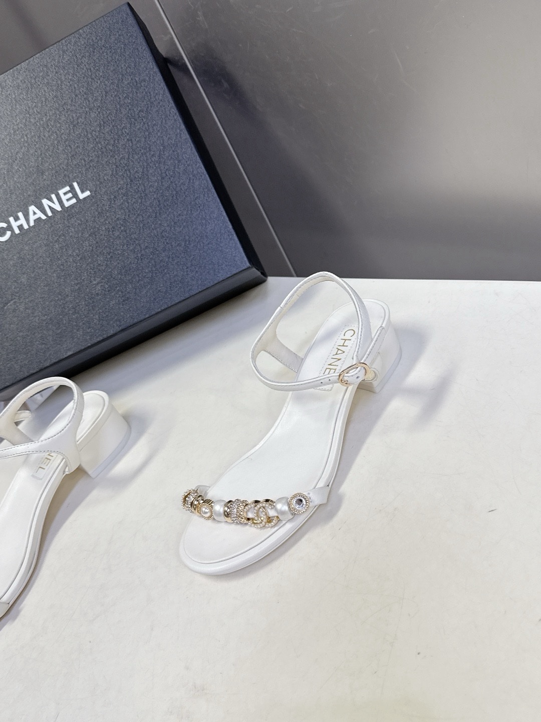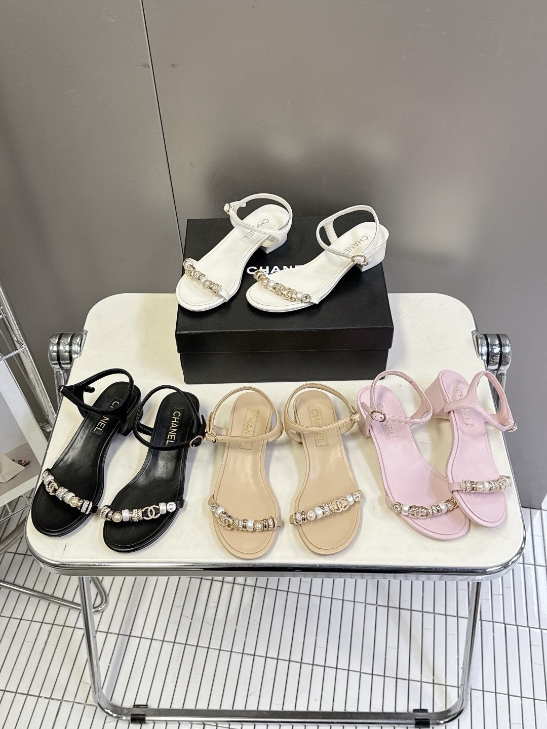 CHANEL Весна/Лето Новинка: босоножки на массивном каблуке с жемчужной цепочкой и ремешками Верхняя подкладка: комбинированная овечья кожа 3,5 см Подошва из натуральной итальянской кожи Размеры: 35-39
