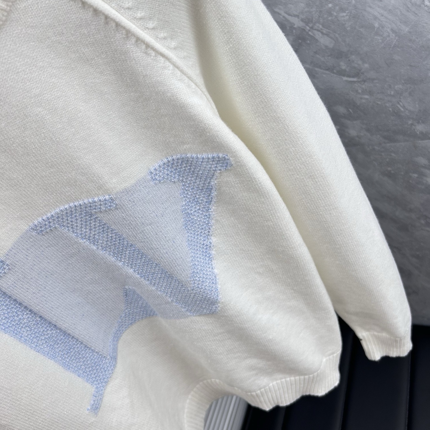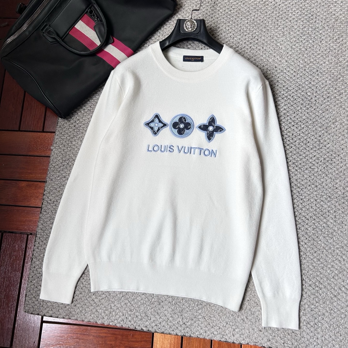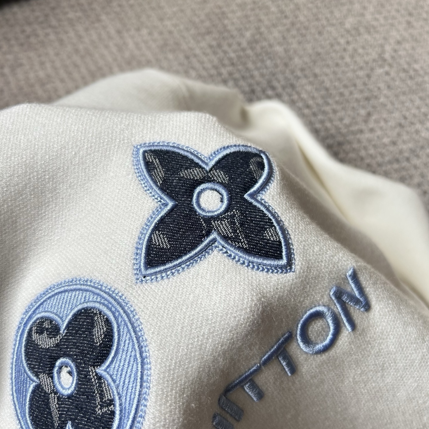 Изделие принадлежит известному французскому дому моды Louis Vuitton, специализирующемуся на предметах роскоши. На груди кофты вышиты четыре фирменных монограммных символа бренда, выполненные синими и черными нитками.
