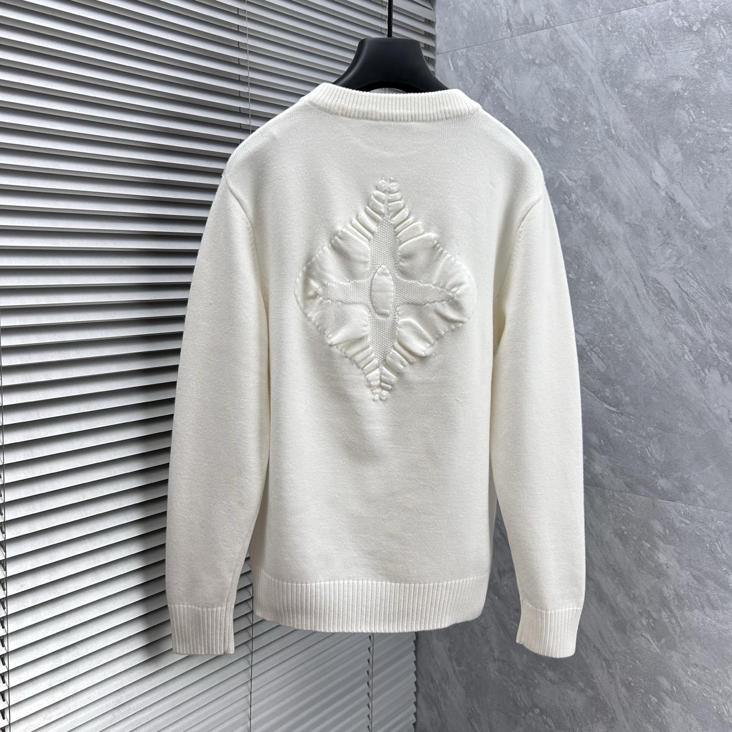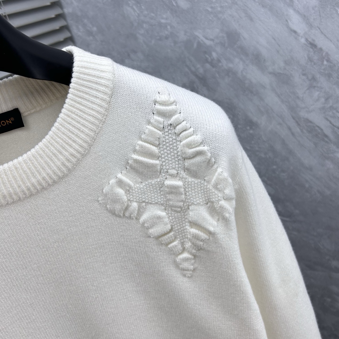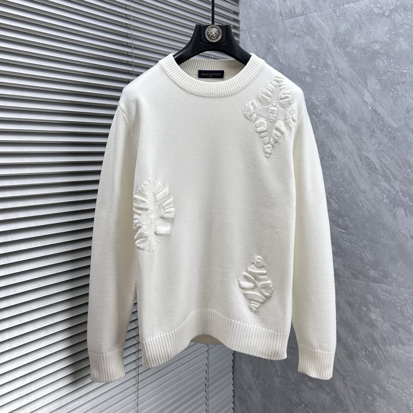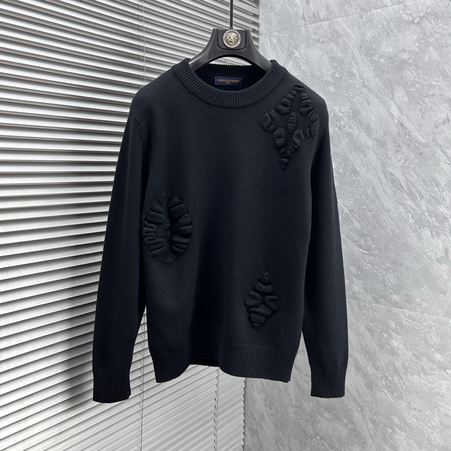 Изделие принадлежит известному французскому дому моды Louis Vuitton, специализирующемуся на предметах роскоши. На груди кофты вышиты четыре фирменных монограммных символа бренда, выполненные синими и черными нитками.