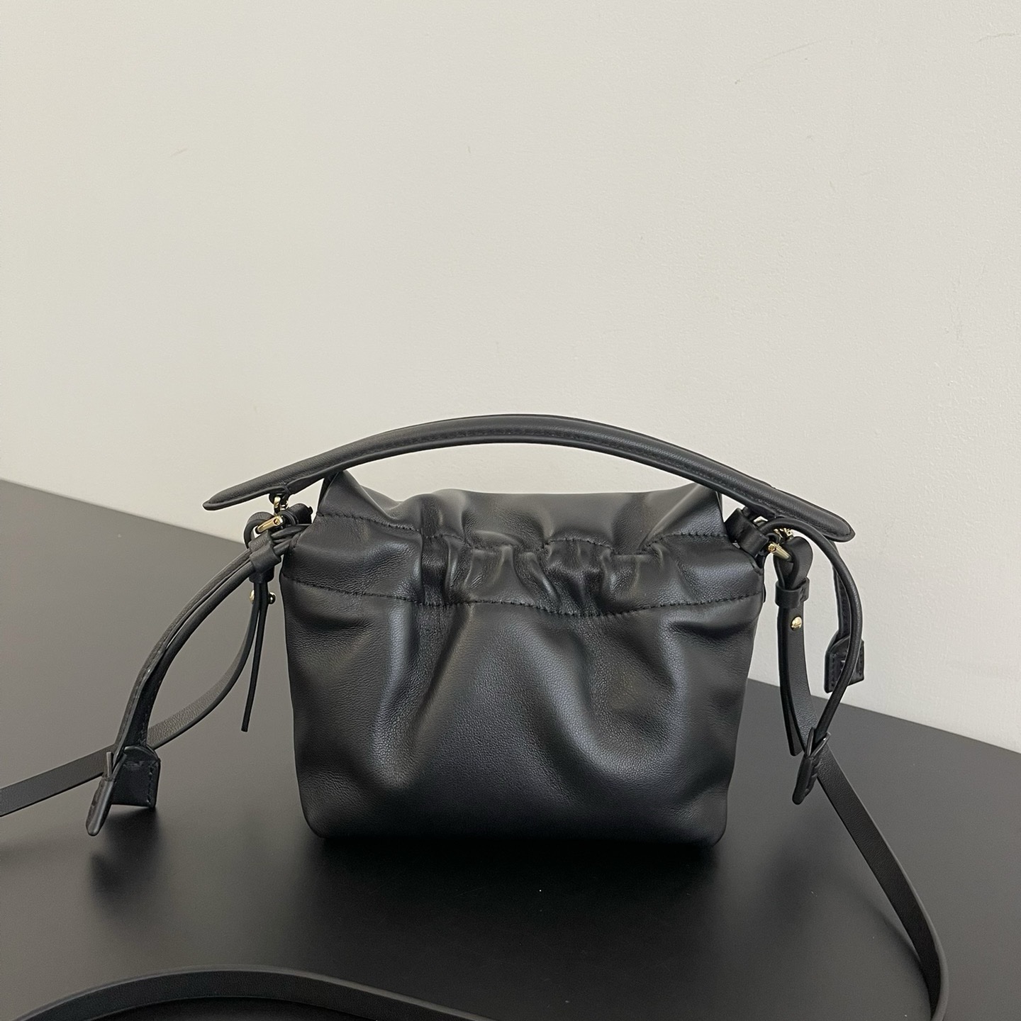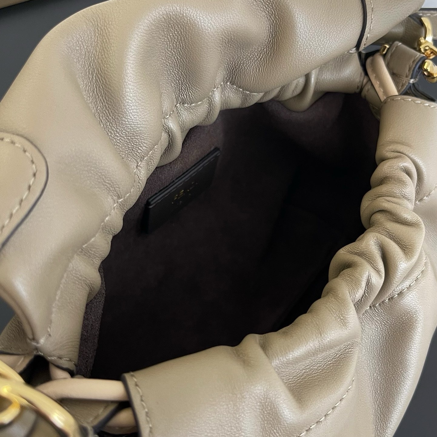 Большое внутреннее отделение с замшевой подкладкой имеет застежку на шнурке с кожаным шнурком и эксклюзивными деталями. Имеет передний клапан и магнитную застежку. Фурнитура золотистого цвета. В комплекте съемная ручка или плечевой ремень для ношения через плечо или в руке.
