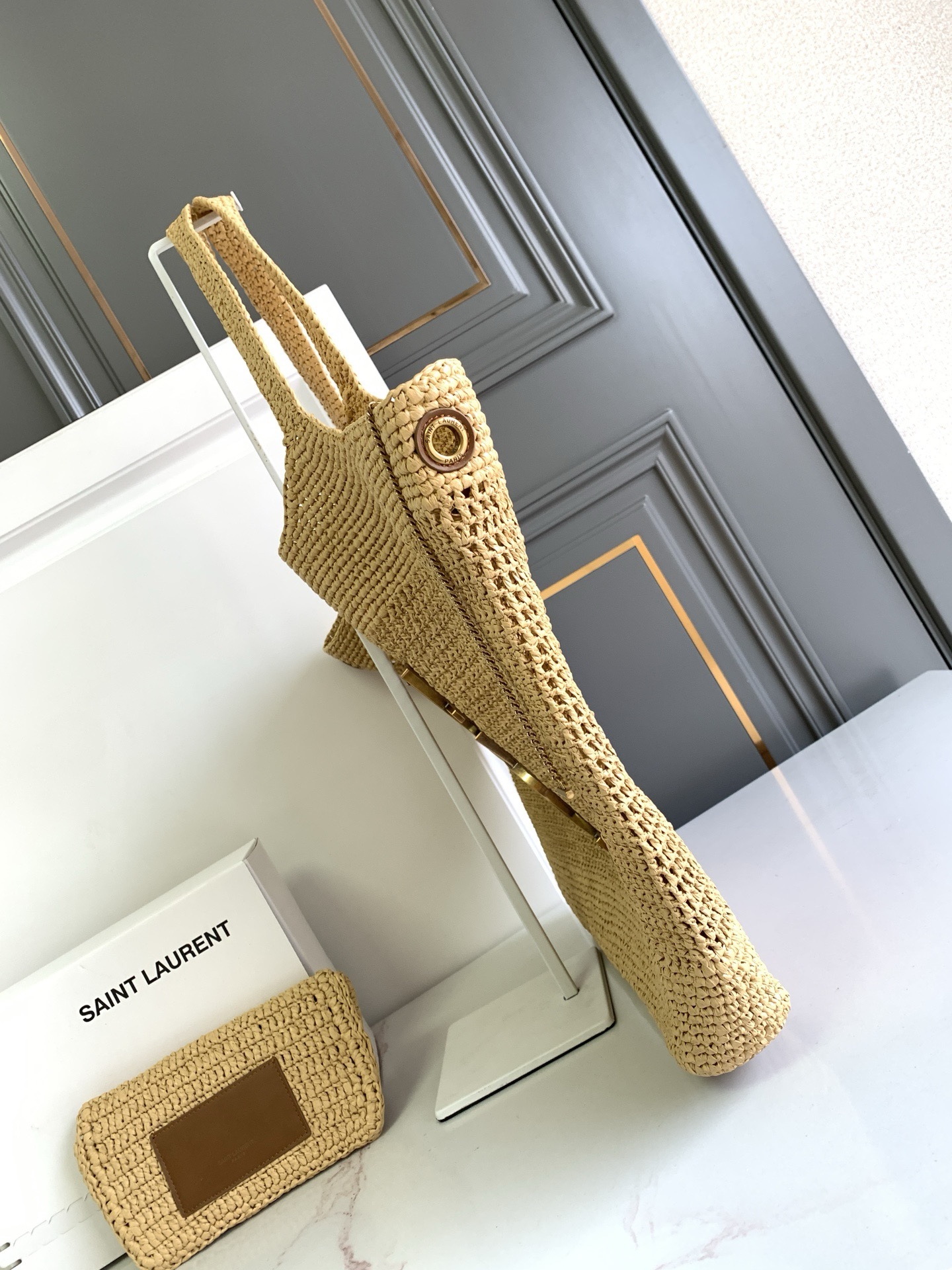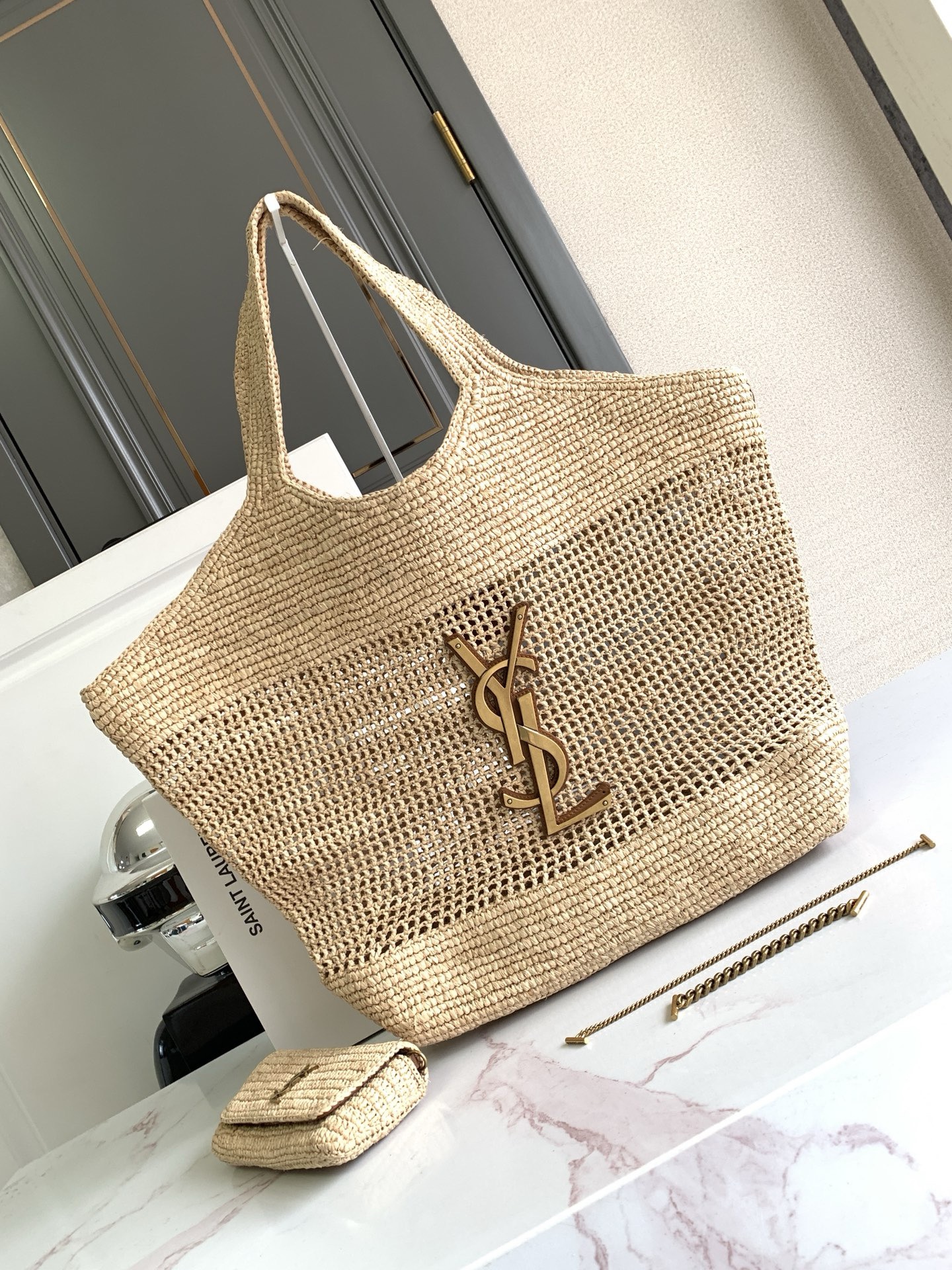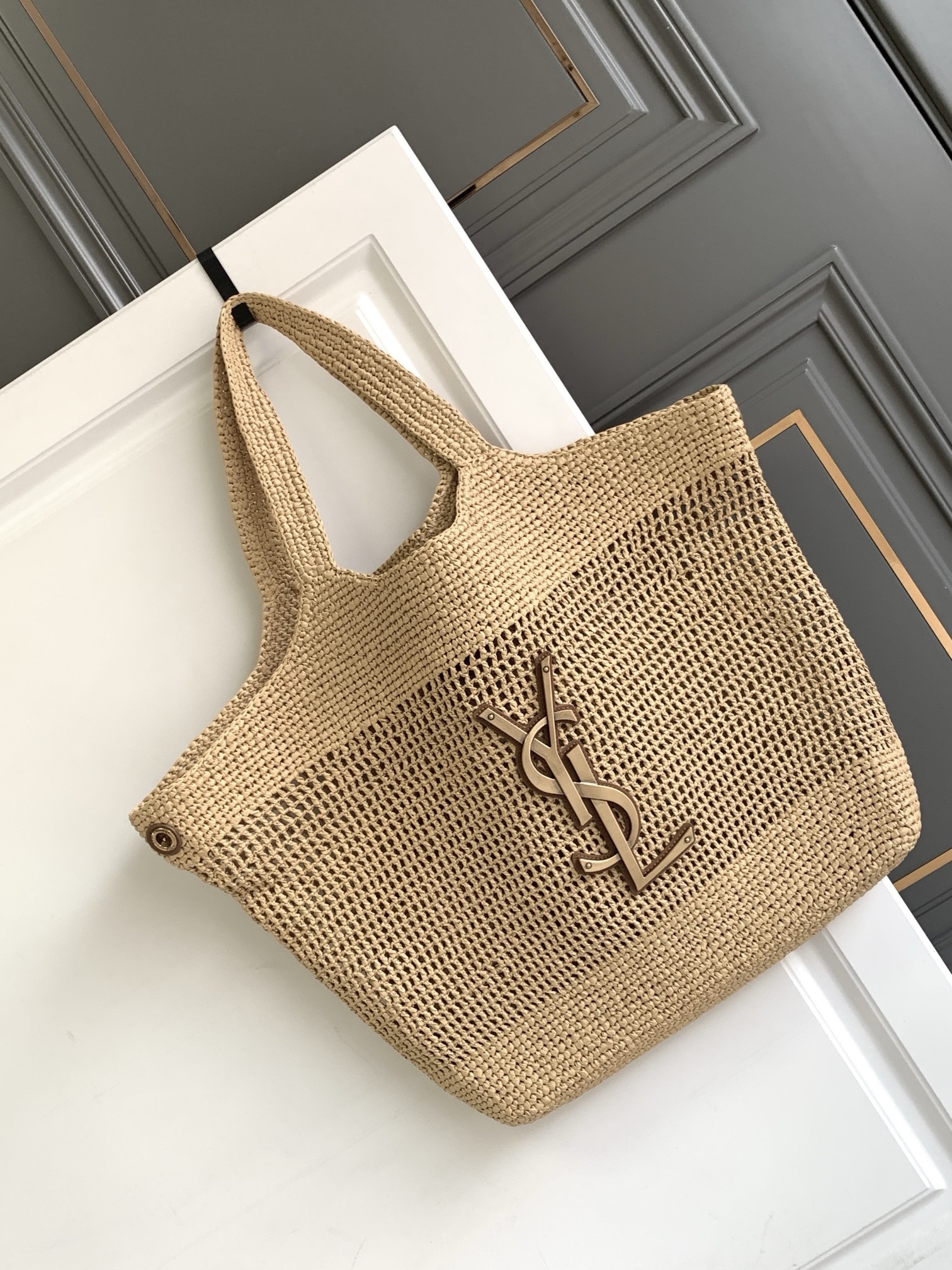 Сумка-тоут Saint Laurent Icare Maxi. Сумка выполнена вручную крючком из рафии с отделкой из кожи растительного дубления. Отличительной особенностью является крупный скульптурный логотип CASSANDRE (YSL).Модель имеет застежку-тумблер и съемный внутренний чехол на молнии. Сумку можно носить как в широком виде, так и с закрытыми боковыми сторонами. Размеры: 37–55 X 43 X 5 см