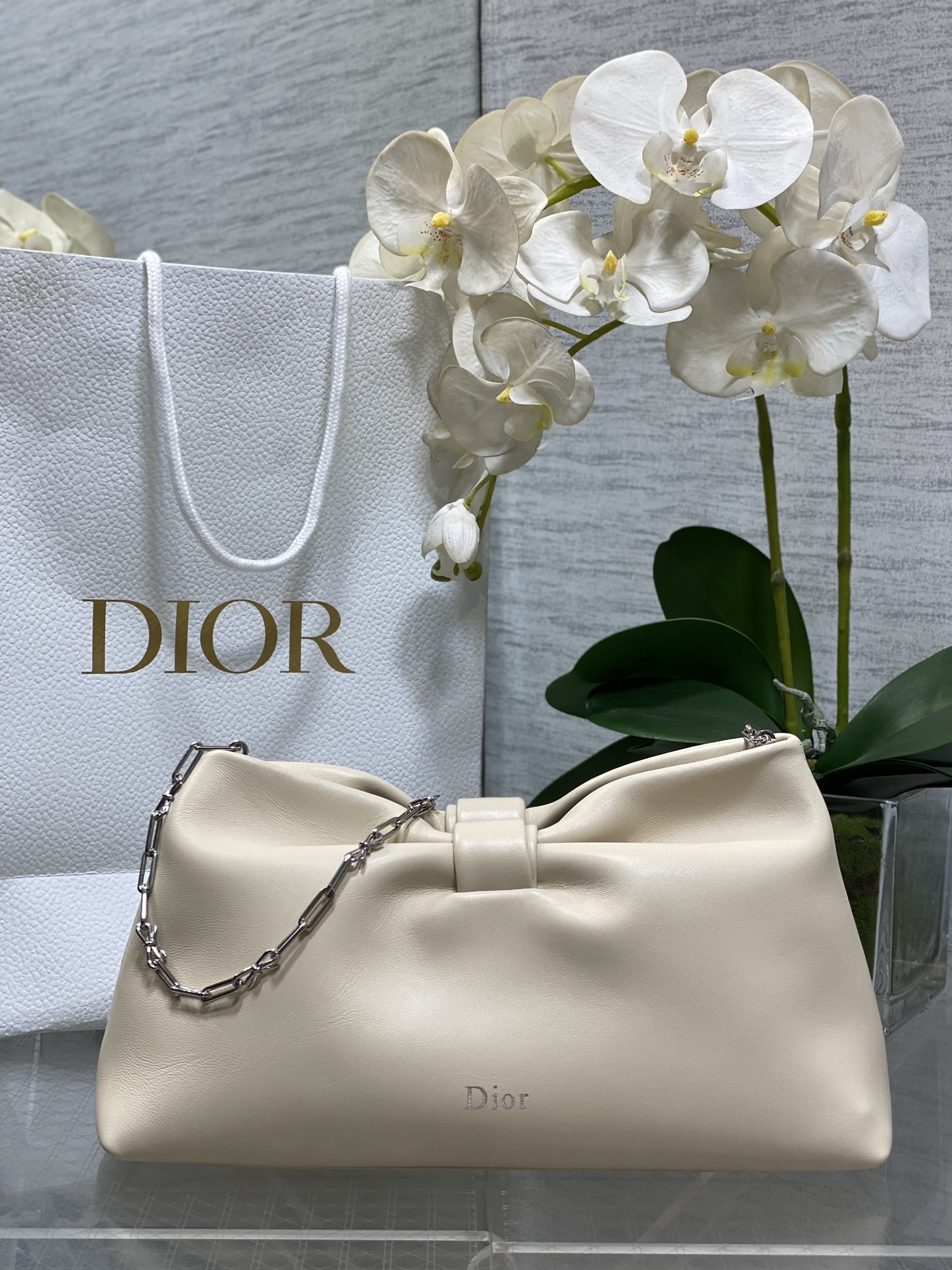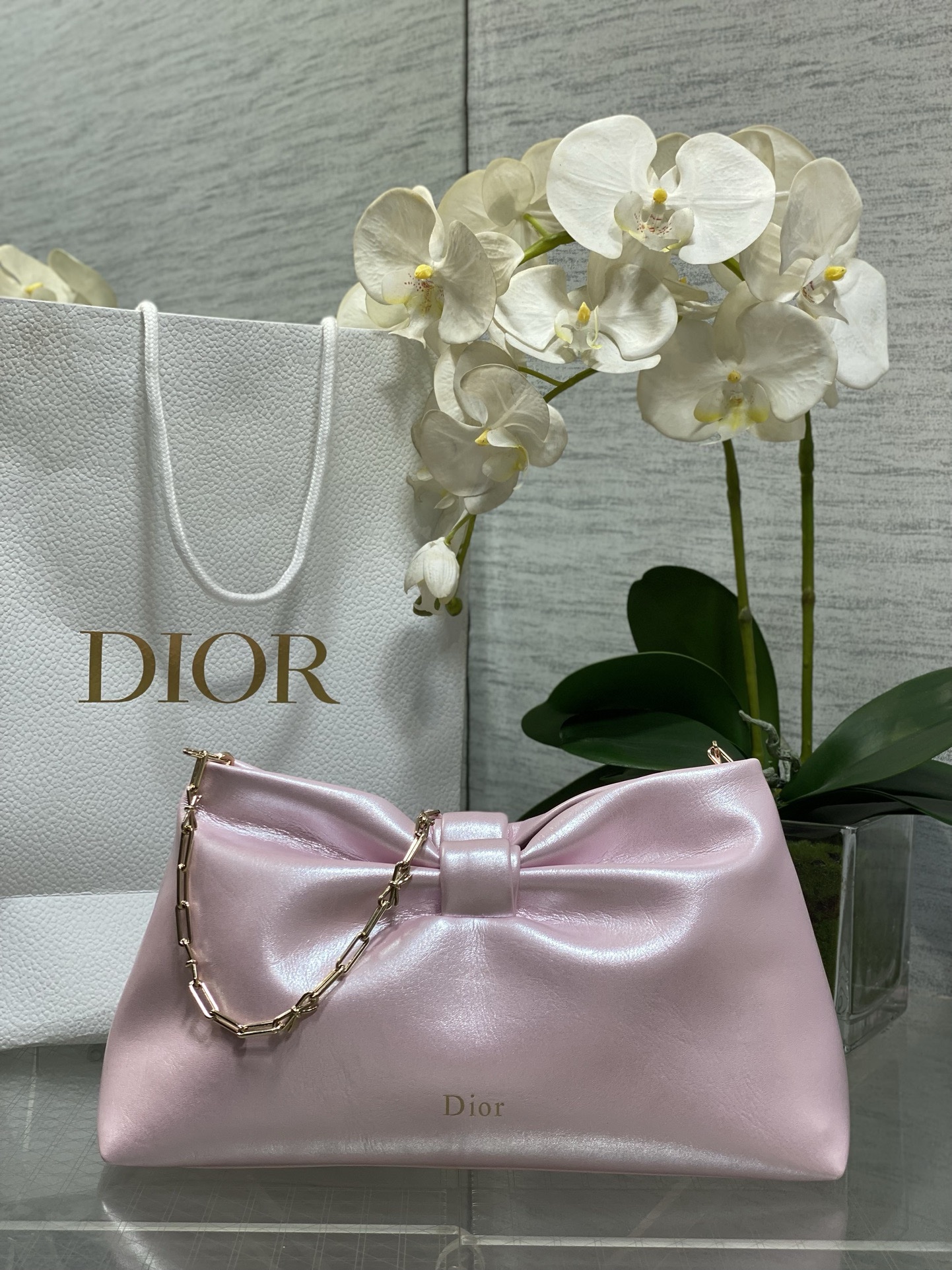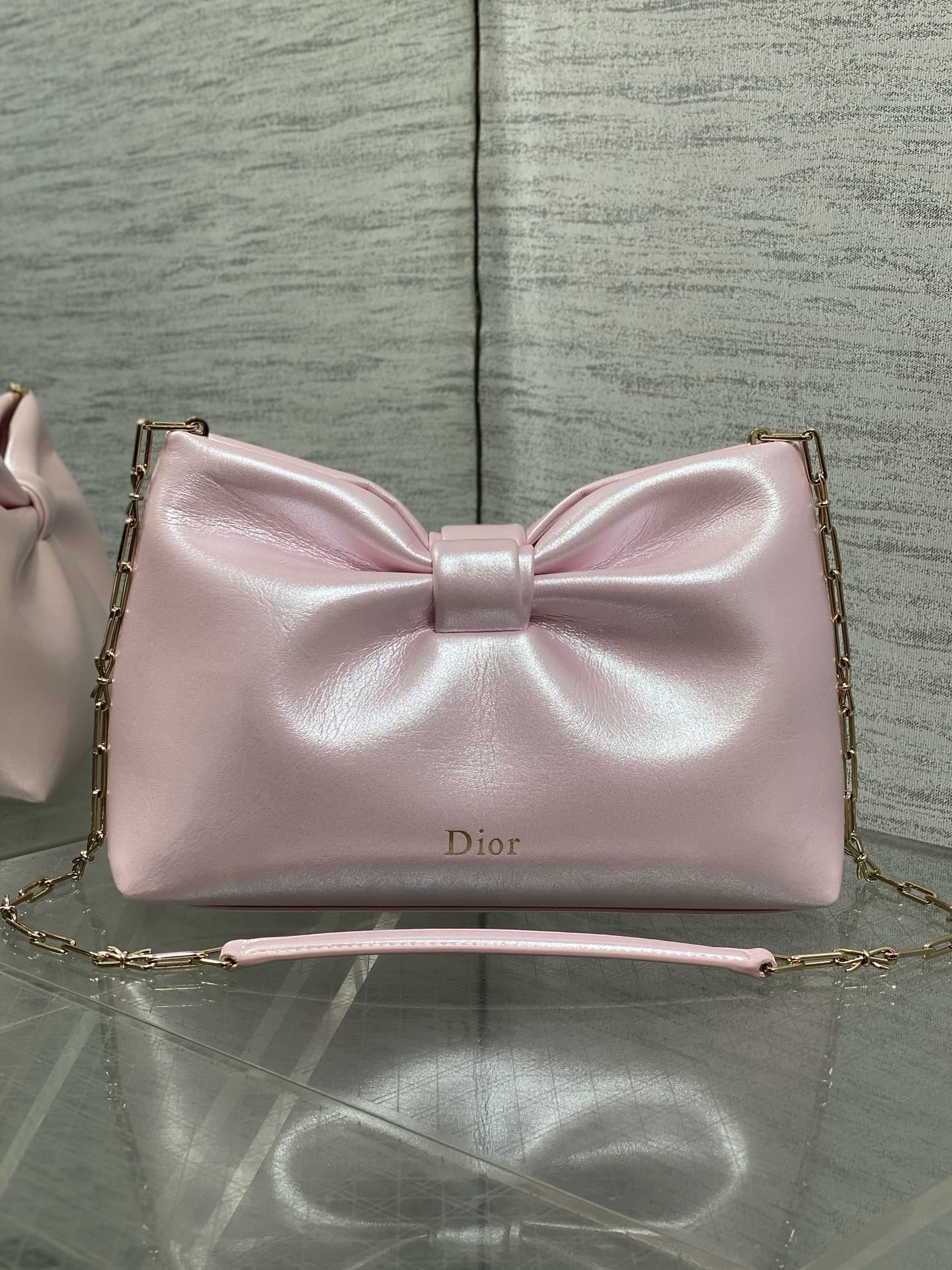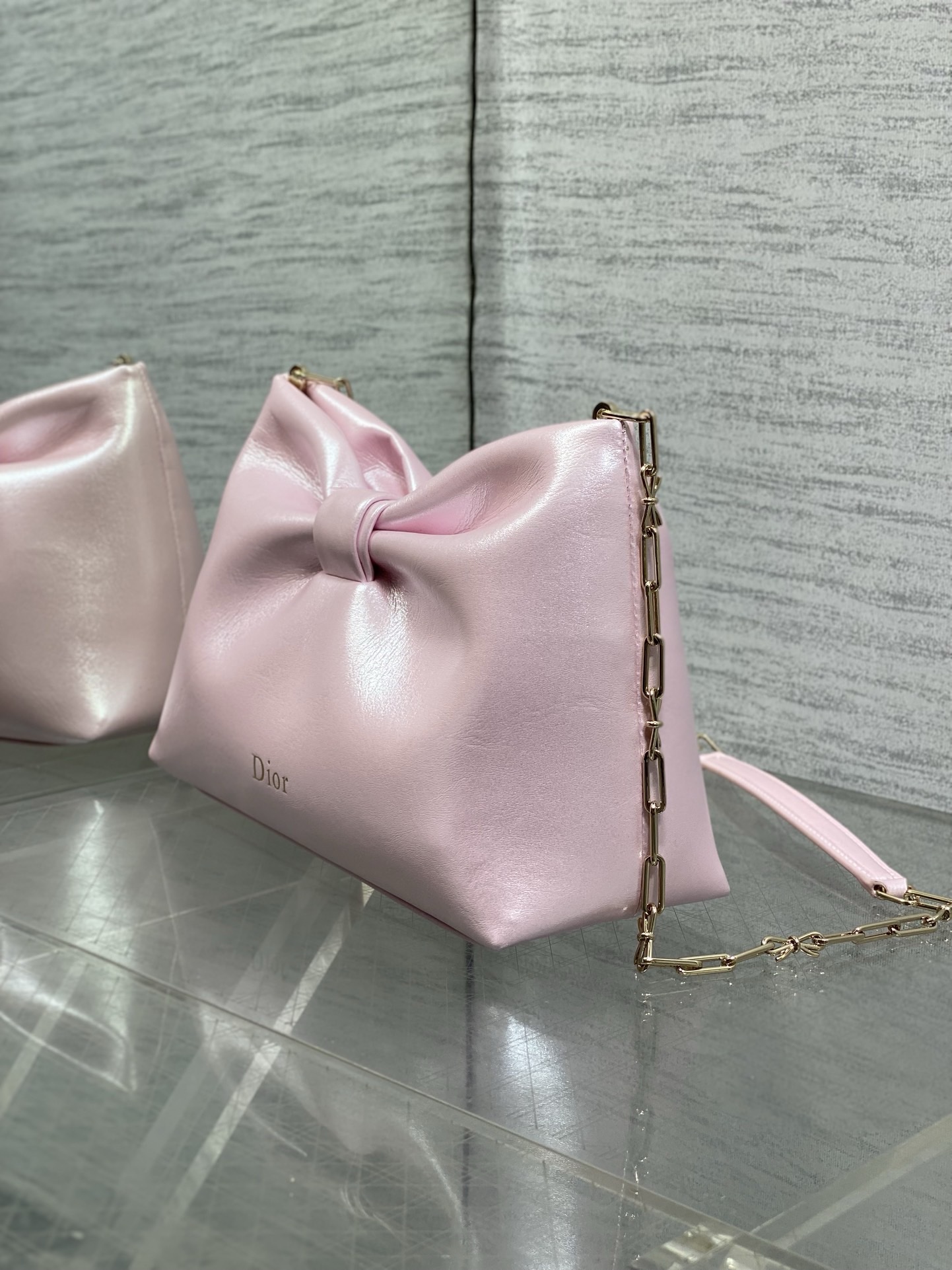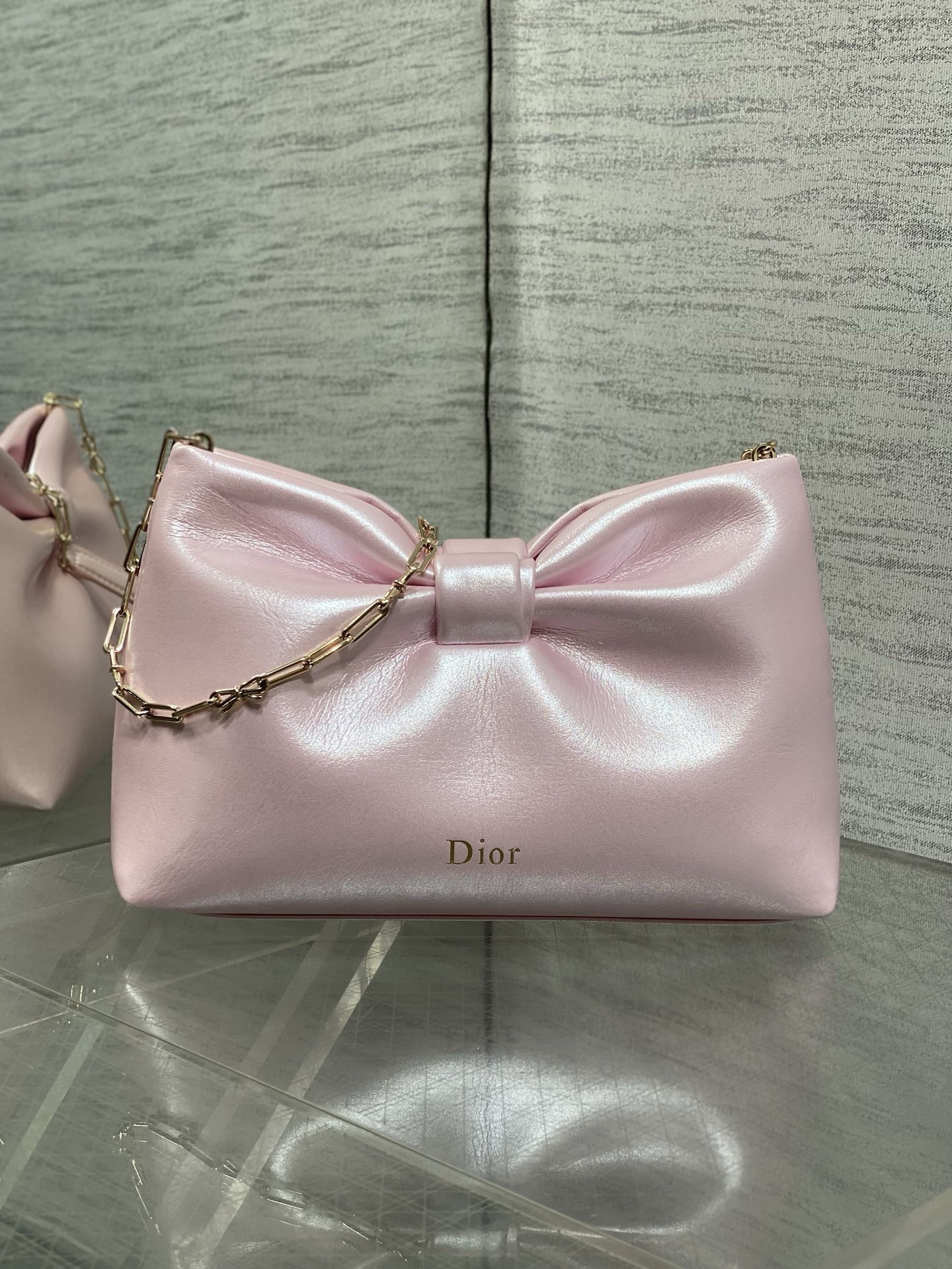 Дизайн: Сумка выполнена в форме объемного банта из кожи. Она сочетает классические коды бренда с современным игривым стилем. Материал и детали: Изделие, изготовлено из кожи ягненка . Она оснащена невидимой застежкой и съемным ремешком-цепочкой с металлическими звеньями.Цвет и размер: Эта модель доступна в различных цветах, включая черный, розовый, турмалин, желтый и белый латте.Коллекция: Сумка Dior является ключевым аксессуаром коллекции весна-лето 2026 года и дебютной моделью под руководством креативного директора Джонатана Андерсона.